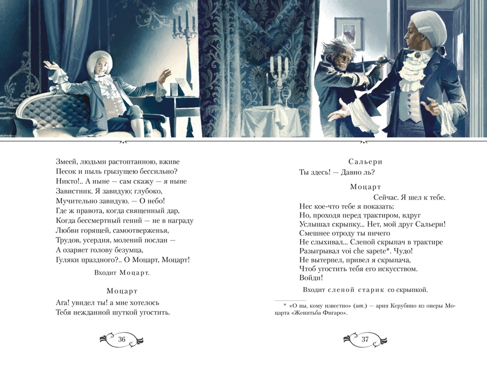 Цикл драматических миниатюр "Маленькие трагедии" был написан А. С. Пушкиным осенью 1830 года, когда поэт несколько месяцев провел в своем имении Болдино во время холерного карантина. Эти произведения – не только исторические жанровые сценки, но и притчи о человеческих слабостях и пороках: зависти, алчности, вероломстве, равнодушии, – и о том, что может повлечь за собой нарушение нравственных законов. Недаром Анна Ахматова писала, что ни в одном из созданий мировой поэзии грозные вопросы морали не поставлены так резко.