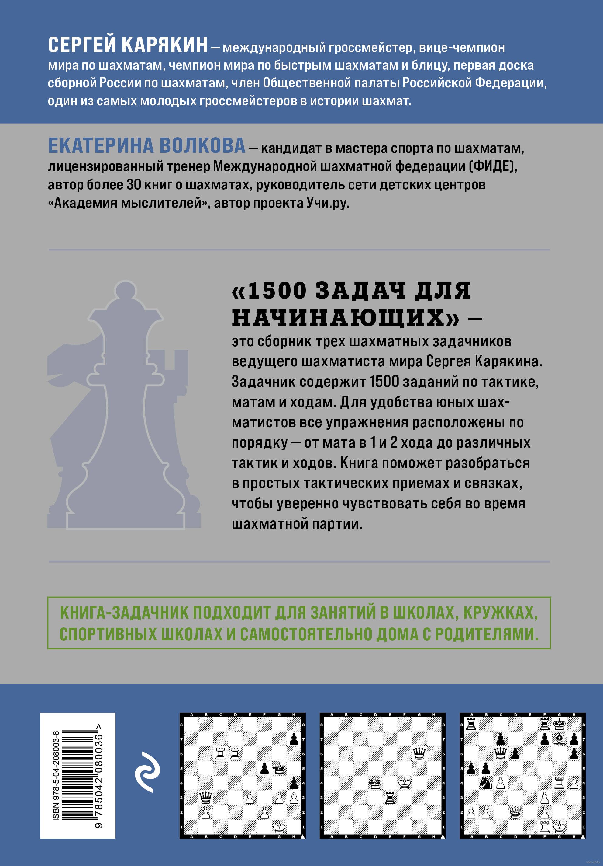 "1500 задач для начинающих" – это сборник трех шахматных задачников ведущего шахматиста мира Сергея Карякина. Задачник содержит 1500 заданий по тактике, матам и ходам. Для удобства юных шахматистов все упражнения расположены по порядку – от мата в 1 и 2 хода до различных тактик и ходов. Книга поможет разобраться в простых тактических приемах и связках, чтобы уверенно чувствовать себя во время шахматной партии.