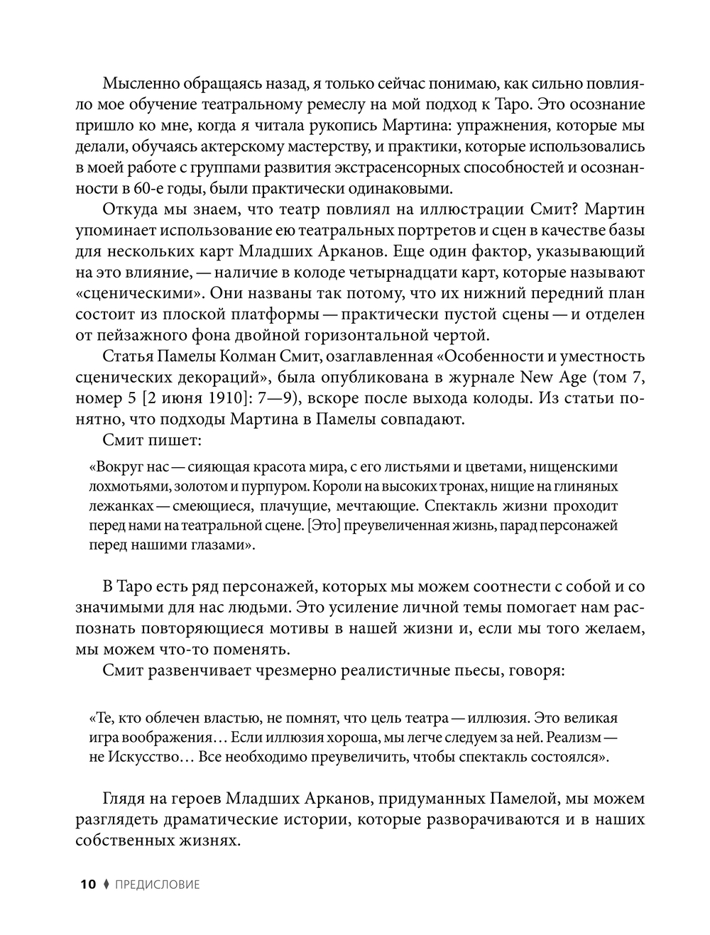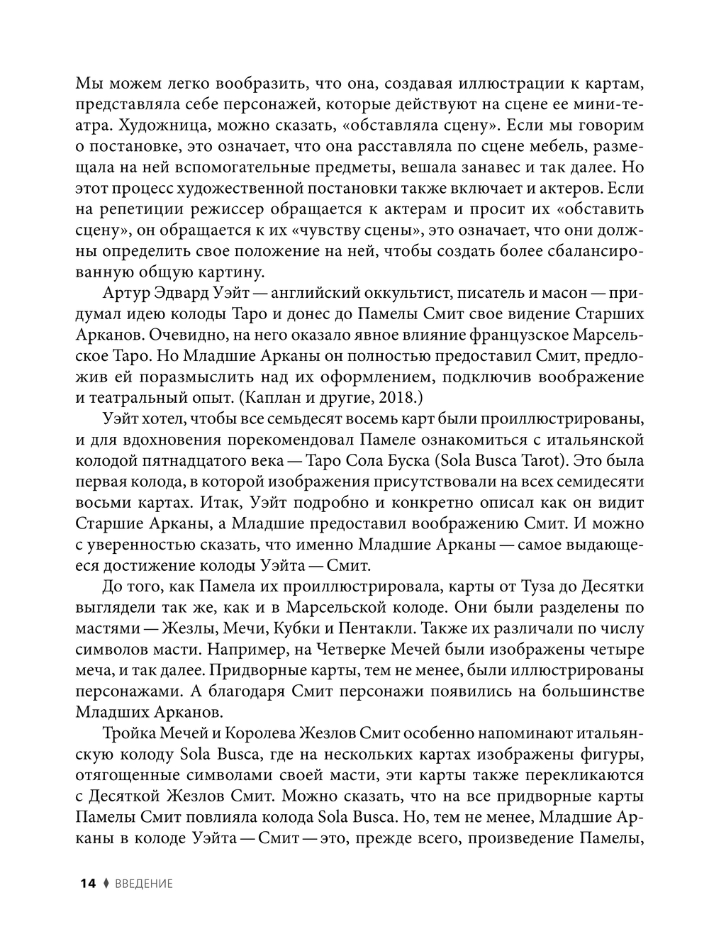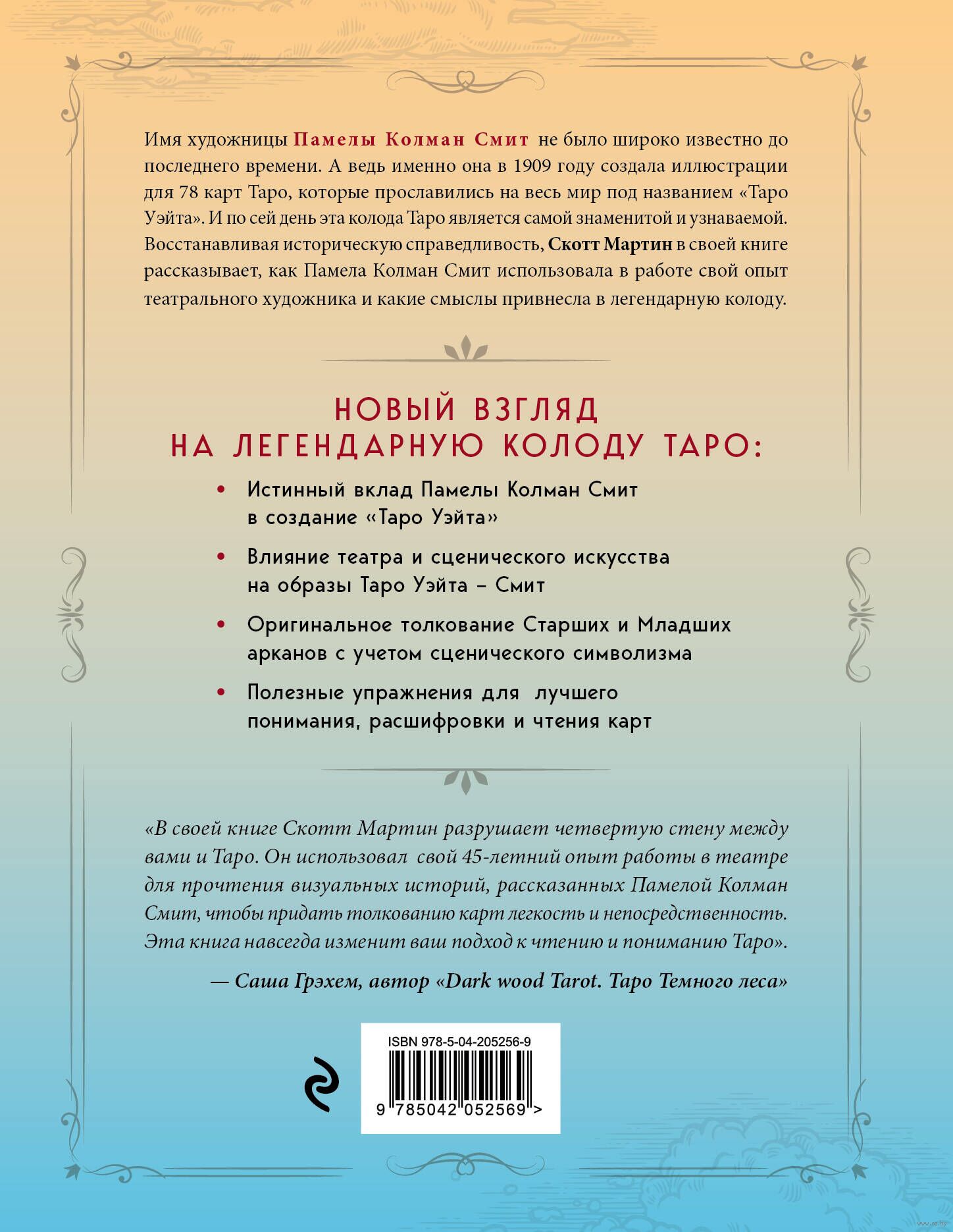 Из этой книги вы узнаете, насколько велик вклад Памелы Колман Смит в "Таро Уэйта" и каково влияние театра и сценического искусства на образы Арканов Таро. Также здесь вы найдете свежие оригинальные толкования Старших и Младших арканов с учетом "языка сцены", а также полезные упражнения, задания и расклады для лучшего понимания и чтения карт.