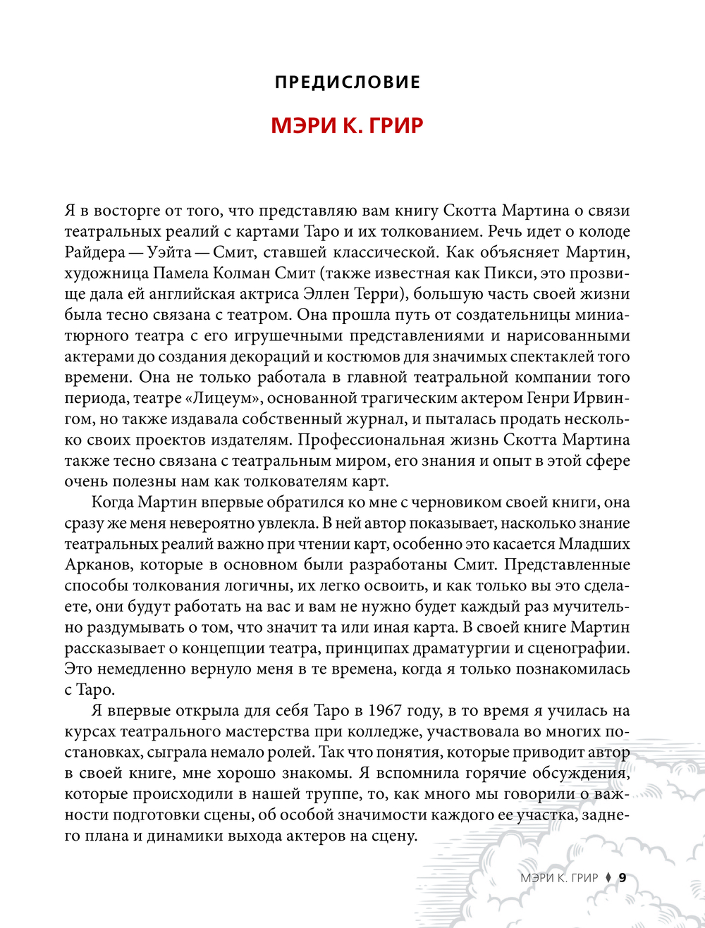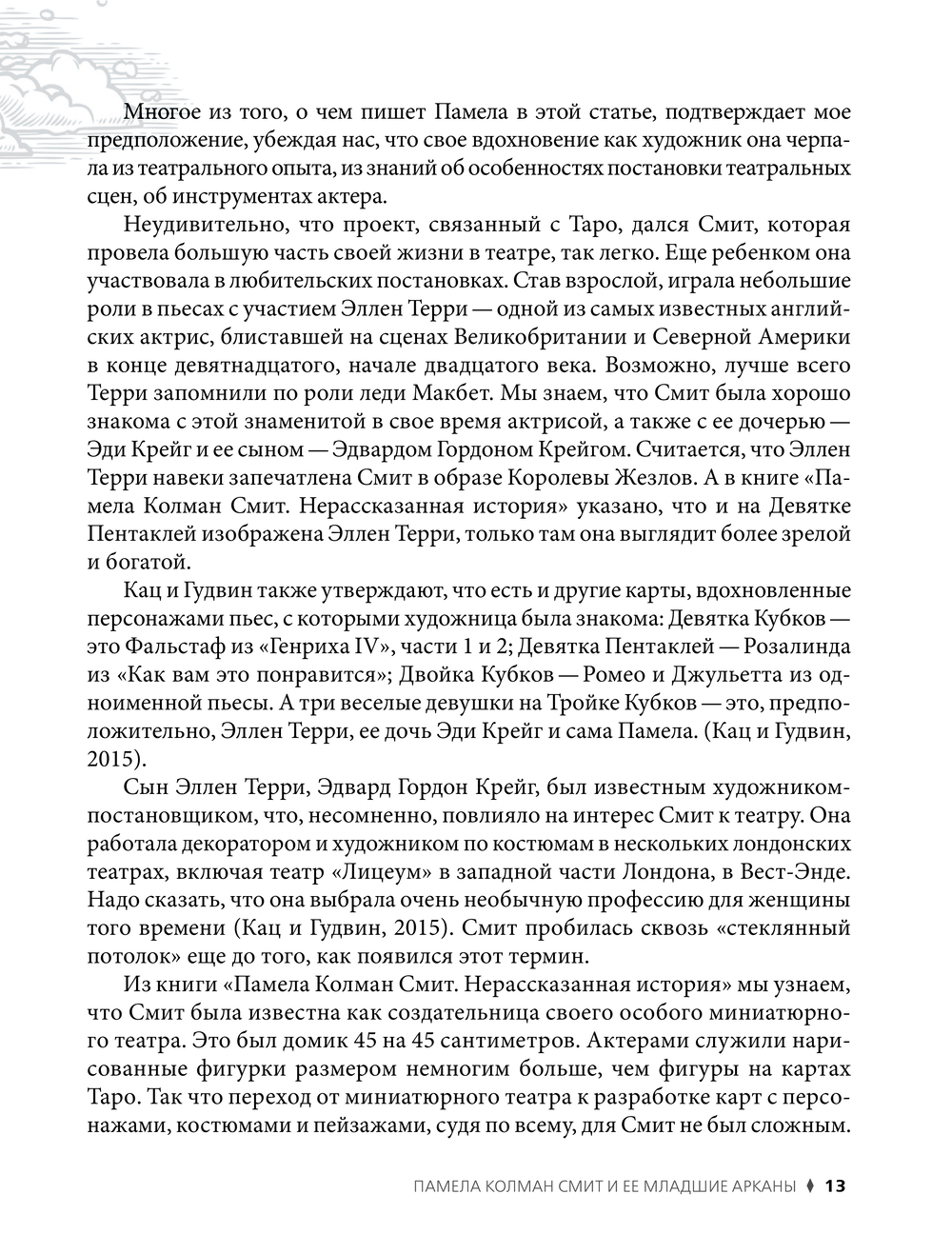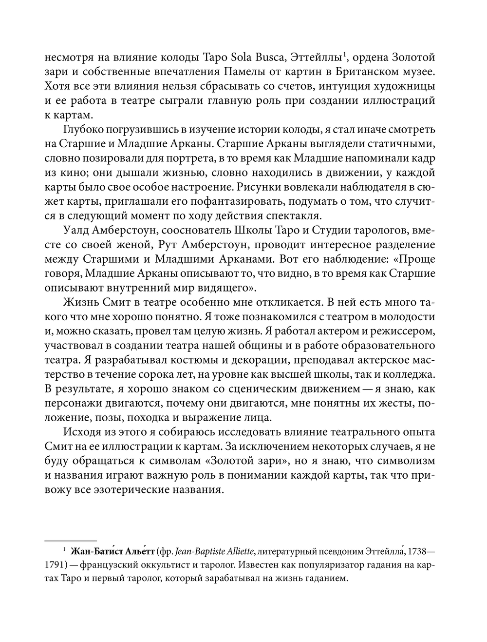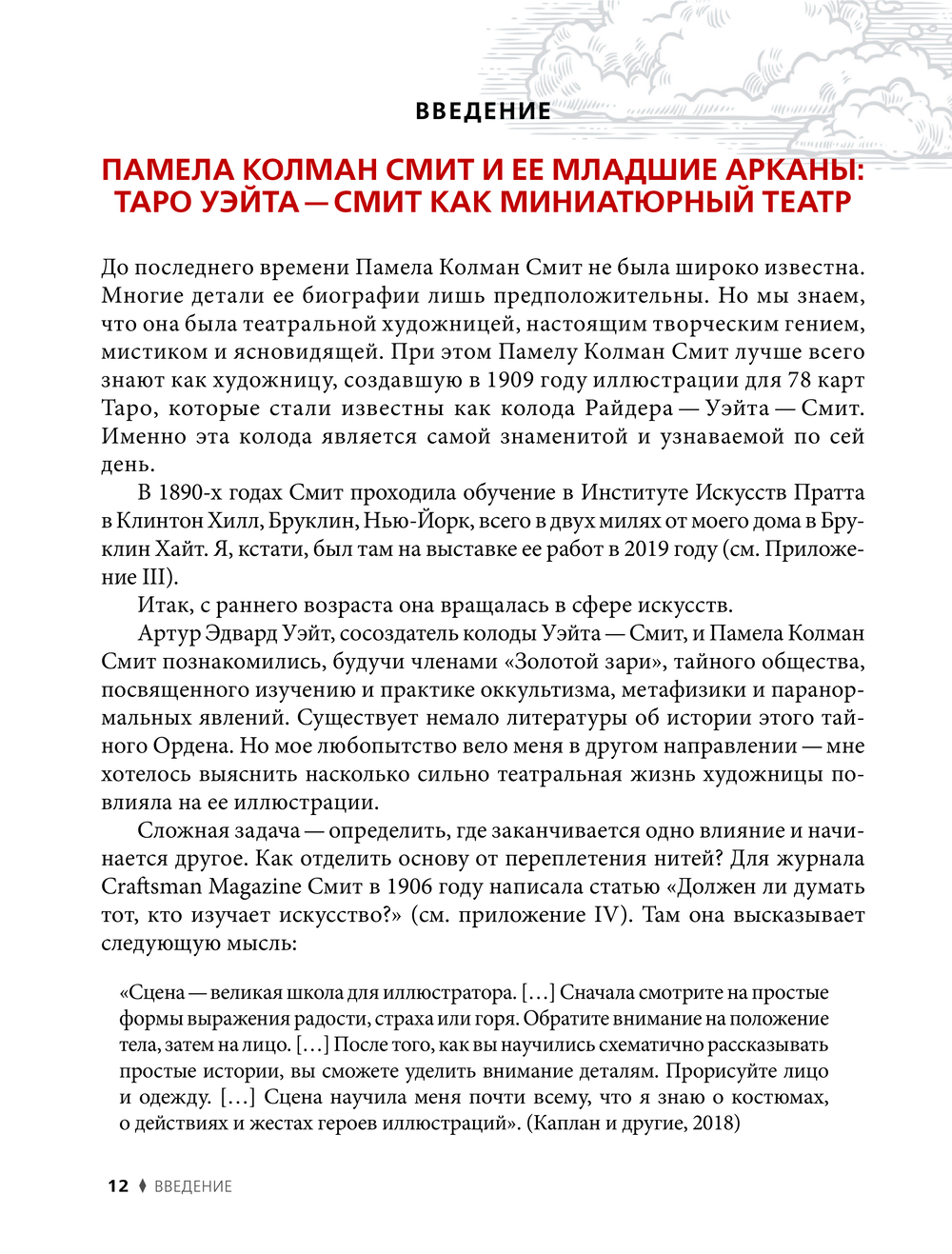 Из этой книги вы узнаете, насколько велик вклад Памелы Колман Смит в "Таро Уэйта" и каково влияние театра и сценического искусства на образы Арканов Таро. Также здесь вы найдете свежие оригинальные толкования Старших и Младших арканов с учетом "языка сцены", а также полезные упражнения, задания и расклады для лучшего понимания и чтения карт.