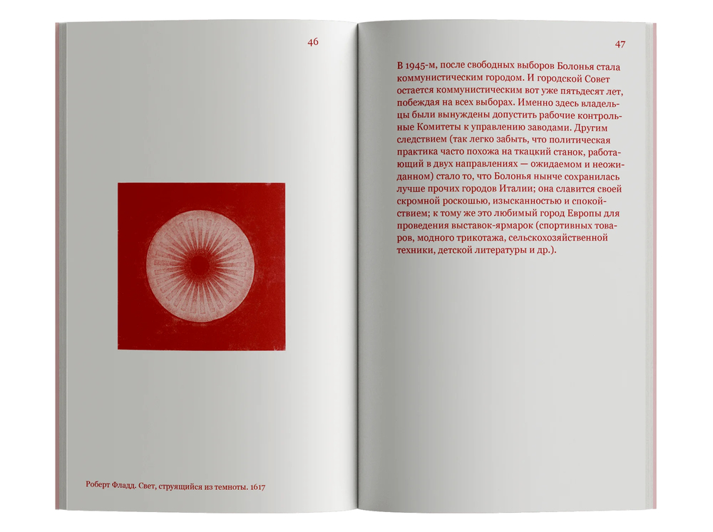 Цвета, запахи и даже вкусы Болоньи, рассеянные по медитативным заметкам, обволакивают читателя, будто становясь ощутимыми. Рассказчик двигается в географическом пространстве и пространстве памяти, соединяя описания увиденного на средневековых улицах с размышлениями о духе города, страны, живописи и итальянской кухни.