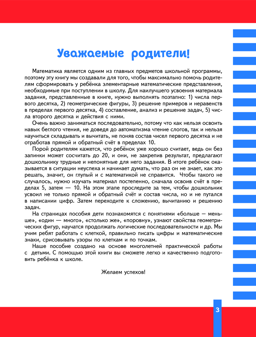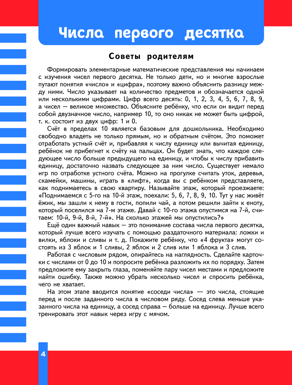 Выполняя увлекательные задания, ребёнок повторит счет в пределах 20, освоит состав числа, будет сравнивать предметы и числа по количеству, решать примеры и задачи в пределах первого десятка. Кроме того, в книге имеются советы родителям, которые помогут им организовать развивающие задания с ребёнком наиболее эффективно.