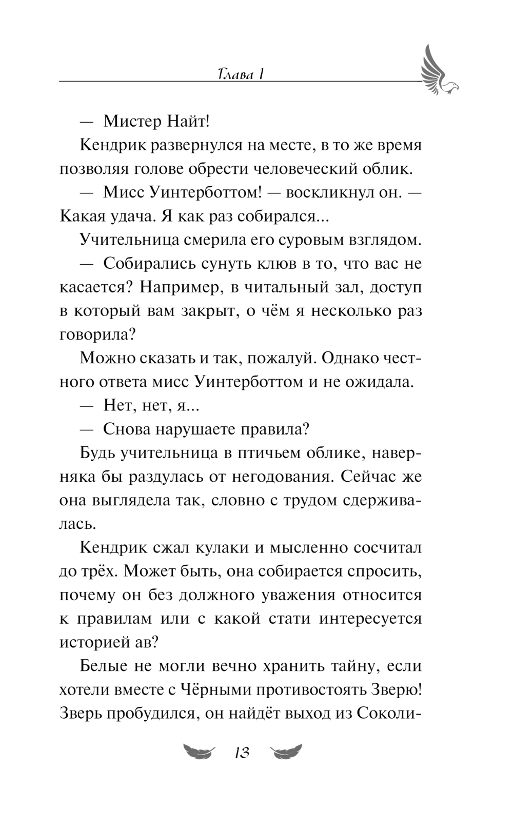 С тех пор как Кендрик стал учеником школы-интерната, его жизнь перевернулась с ног на голову: теперь мальчик принадлежит к тайному сообществу людей-птиц. На протяжении сотен лет такие, как он, выполняют важную миссию. Они охраняют Соколиный Пик, где согласно легенде, заперт опасный зверь.