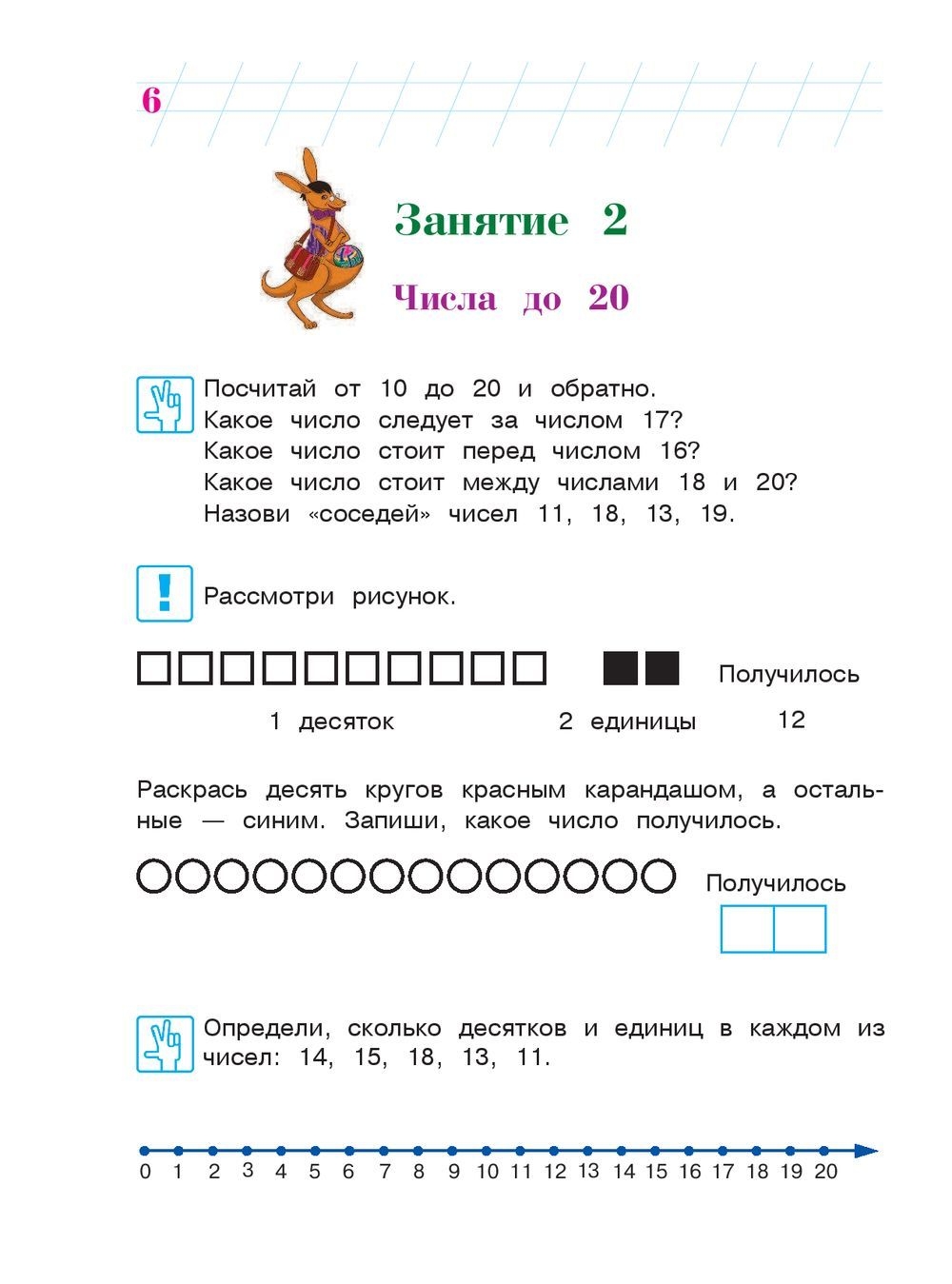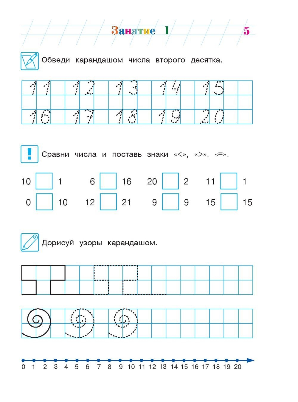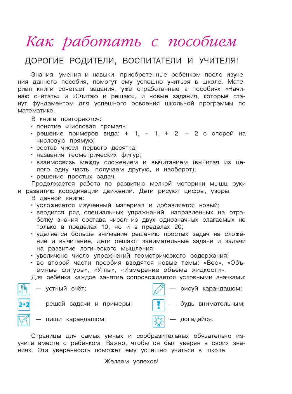 Основные задачи пособия – закрепление знаний состава чисел в пределах 20 и навыков решения задач на сложение и вычитание; ознакомление ребенка с математическими понятиями "слагаемое", "сумма", "уменьшаемое", "вычитаемое", "разность", "однозначные/двузначные числа", "четные/нечетные числа"; обучение счету десятками, обозначению углов и сторон геометрических фигур; формирование представлений об объемных фигурах. Упражнения по штриховке геометрических фигур ориентированы на развитие мелкой моторики руки и координации движений. Задания на выявление закономерностей в рядах чисел и фигур способствуют развитию логического мышления, внимания, памяти.
