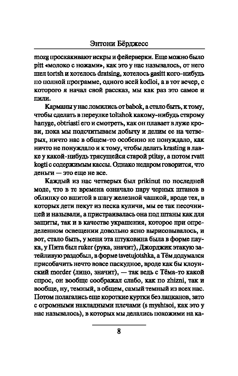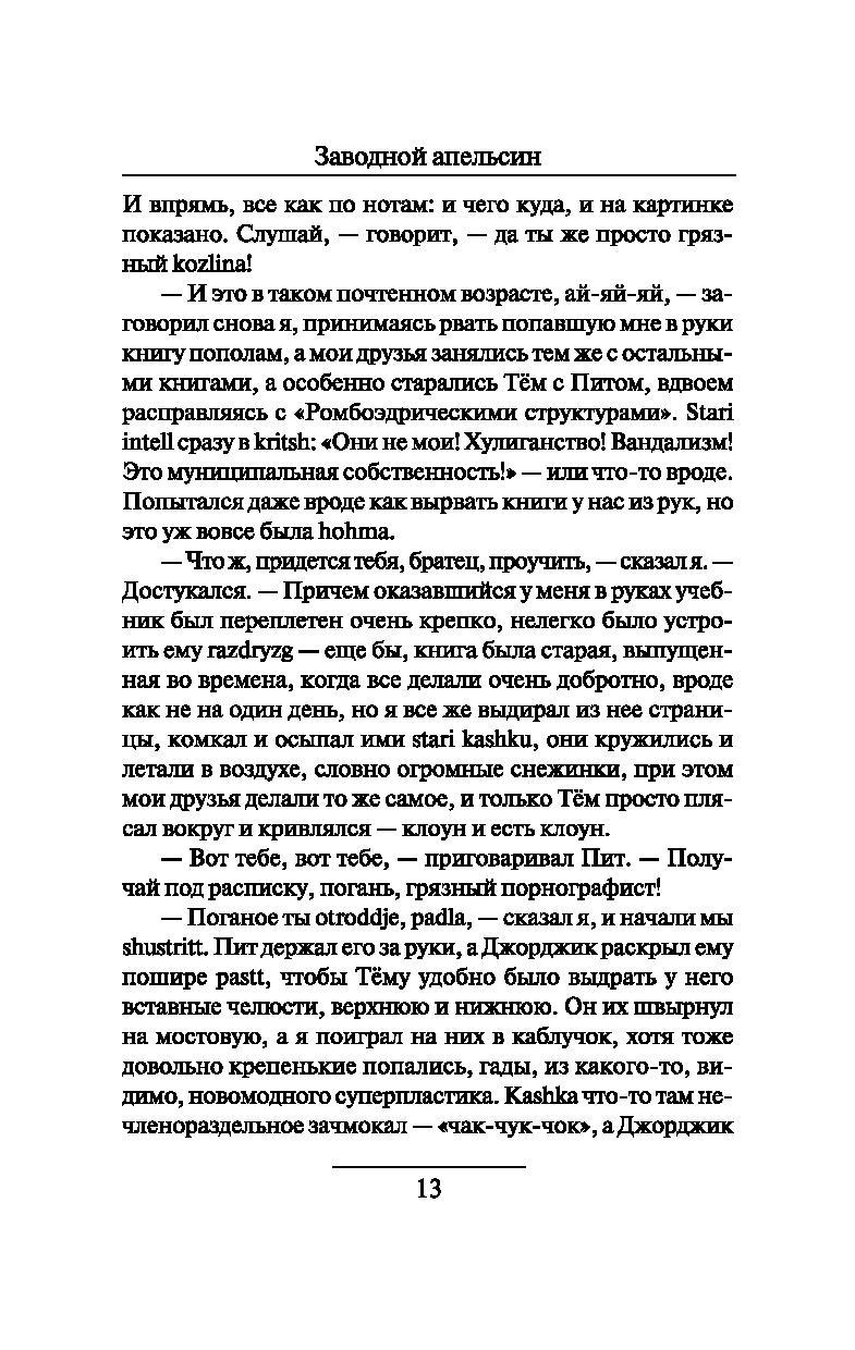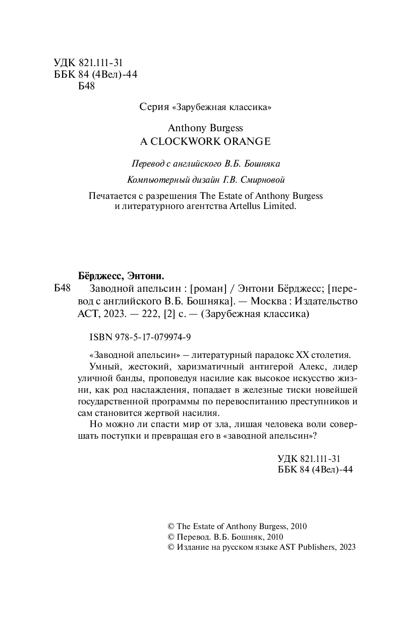 "Заводной апельсин" – литературный парадокс ХХ столетия. Продол-жая футуристические традиции в литературе, экспериментируя с языком, на котором говорит рубежное поколение malltshipalltshikov и kisok "надсатых", Энтони Бёрджесс создает роман, признанный классикой современной литературы. Умный, жестокий, харизматичный антигерой Алекс, лидер уличной банды, проповедуя насилие как высокое искусство жизни, как род наслаждения, попадает в железные тиски новейшей государственной программы по перевоспитанию преступников и сам становится жертвой наси-лия. Можно ли спасти мир от зла, лишая человека воли совершать пос-тупки и превращая его в "заводной апельсин"? Этот вопрос сегодня актуален так же, как и вчера, и вопрос этот автор задает читателю.