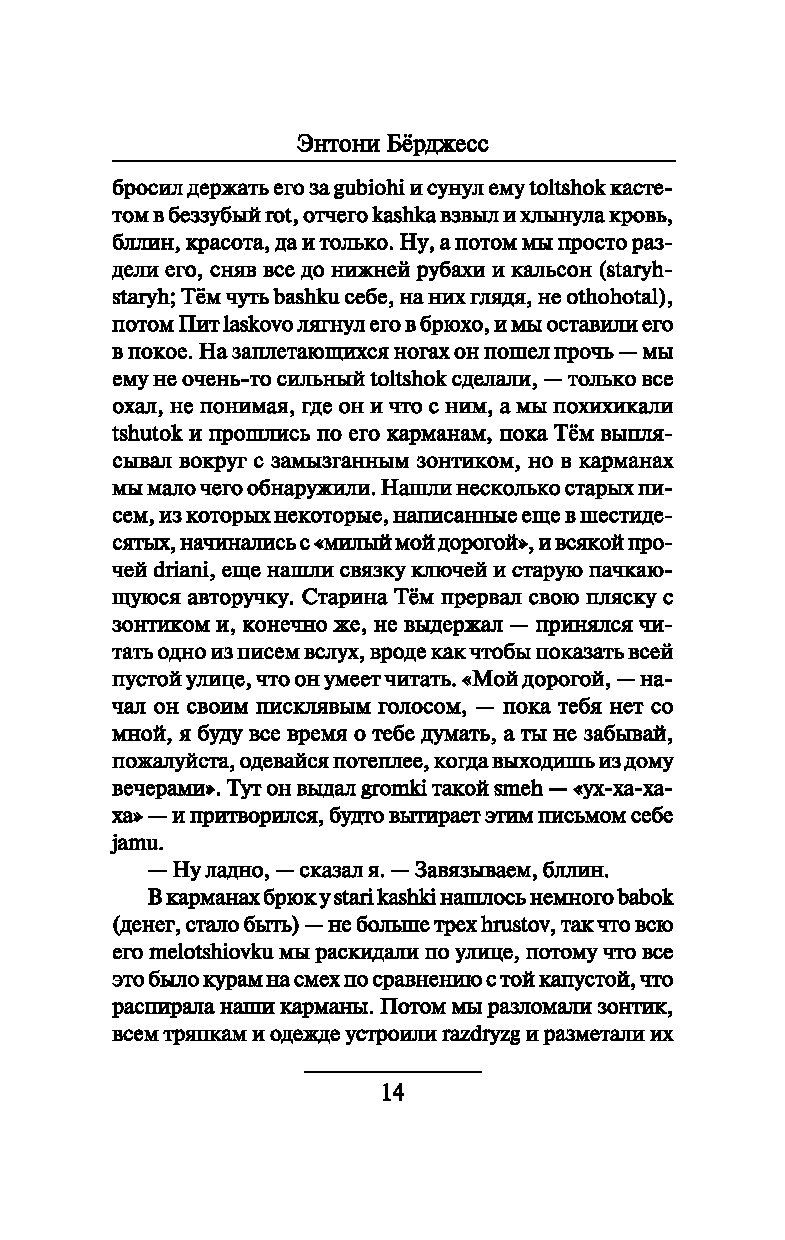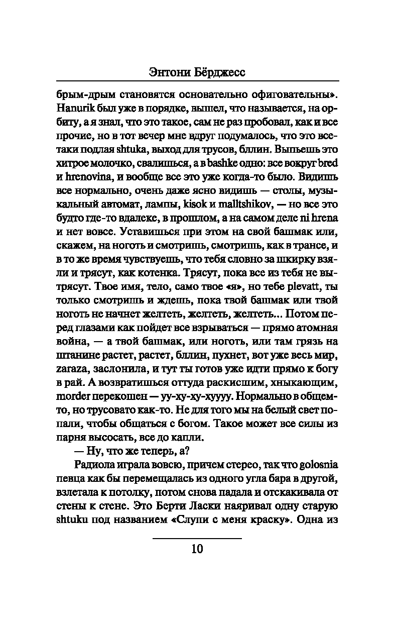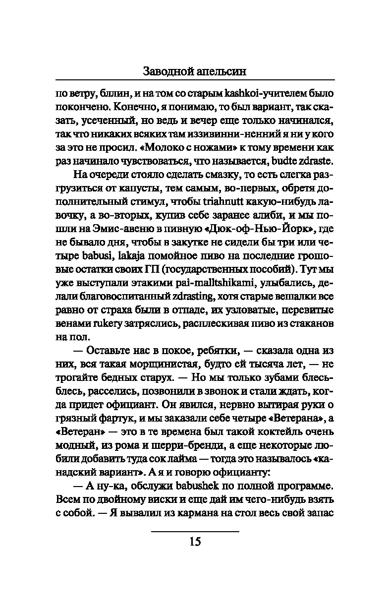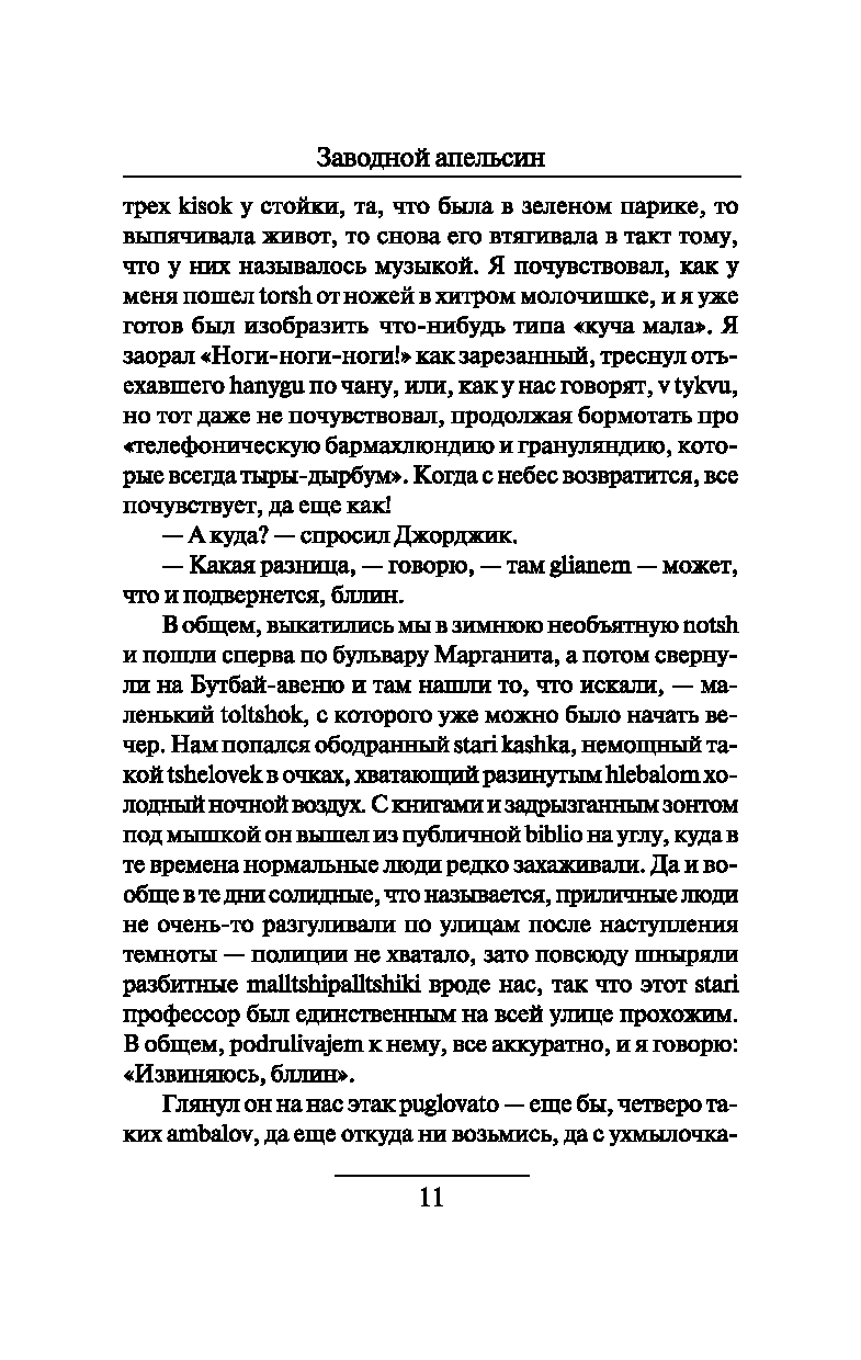 "Заводной апельсин" – литературный парадокс ХХ столетия. Продол-жая футуристические традиции в литературе, экспериментируя с языком, на котором говорит рубежное поколение malltshipalltshikov и kisok "надсатых", Энтони Бёрджесс создает роман, признанный классикой современной литературы. Умный, жестокий, харизматичный антигерой Алекс, лидер уличной банды, проповедуя насилие как высокое искусство жизни, как род наслаждения, попадает в железные тиски новейшей государственной программы по перевоспитанию преступников и сам становится жертвой наси-лия. Можно ли спасти мир от зла, лишая человека воли совершать пос-тупки и превращая его в "заводной апельсин"? Этот вопрос сегодня актуален так же, как и вчера, и вопрос этот автор задает читателю.