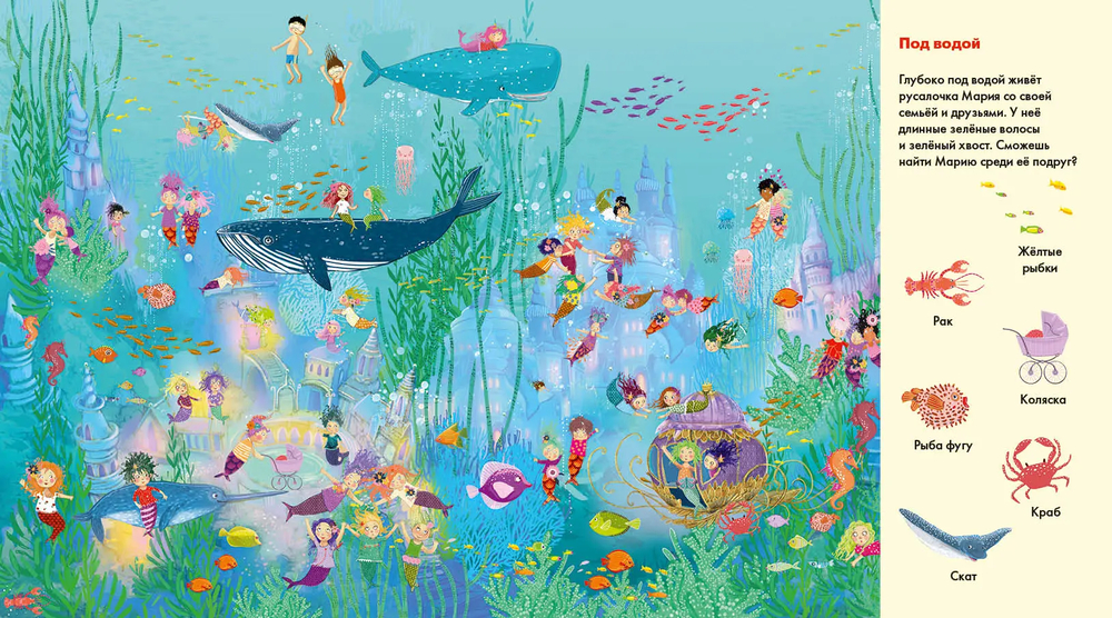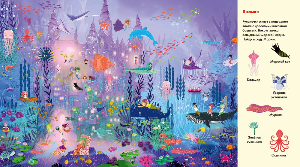У непоседливых русалок всегда что-то происходит! Давайте вместе посетим морского царя, поищем жемчуг на коралловом рифе, поиграем с дракончиком на волшебном острове и примем участие в соревнованиях по плаванию. Ведь подводный мир такой необычный и увлекательный! Главное – внимательно разглядывай рисунки и найди морских обитателей, животных, птиц, насекомых и множество любопытных вещей, которые окружают озорных русалок.