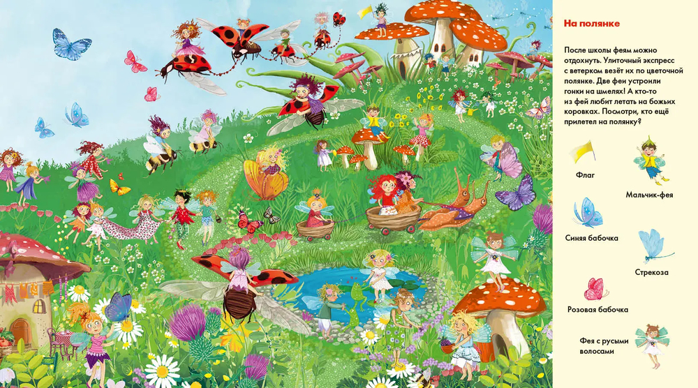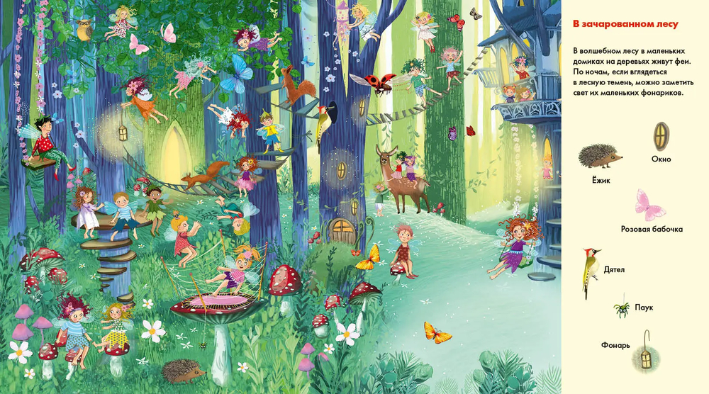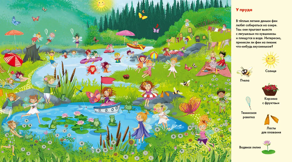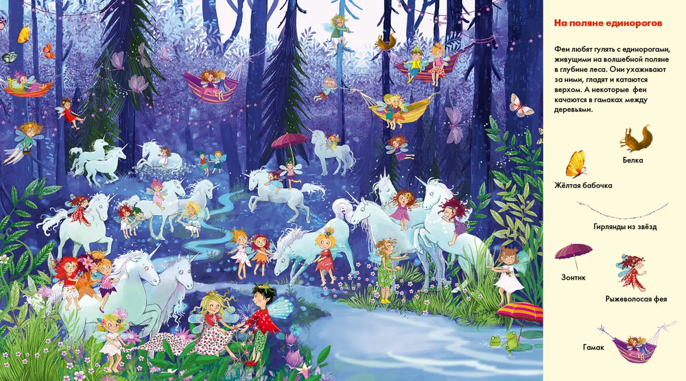 Отправляйтесь с нами в захватывающий мир фей! Давайте вместе побываем в зачарованном лесу, посетим хрустальный замок, порезвимся на цветущем лугу, покатаемся на единорогах и станцуем на празднике. В этом волшебном царстве никогда не бывает скучно! Главное – внимательно разглядывай рисунки и найди зверей, птиц, насекомых и множество любопытных вещей, которые окружают весёлых фей.