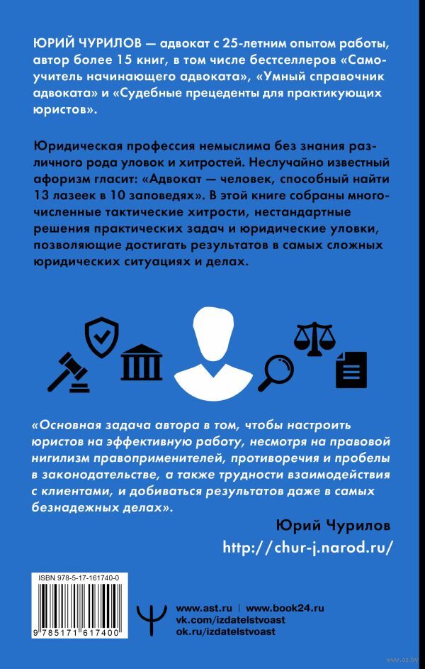 Новейшее издание бестселлера, полностью переработанное и дополненное в соответствии с актуальными изменениями законодательства! Юридическая профессия немыслима без знания различного рода уловок и хитростей. Неслучайно один из известных афоризмов гласит: "Адвокат – человек, способный найти 13 лазеек в 10 заповедях". Автор книги собрал воедино многочисленные тактические хитрости, нестандартные решения практических задач и юридические уловки, позволяющие достигать результатов даже в самых, на первый взгляд, безнадежных делах.