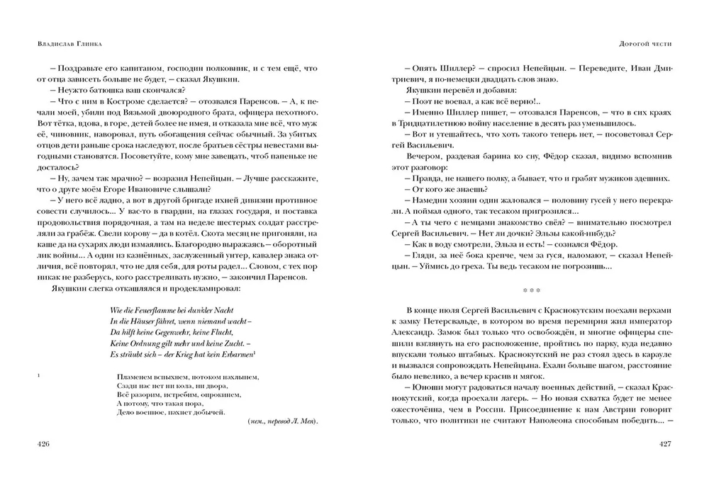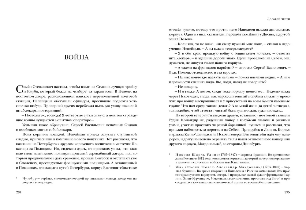 Роман "Дорогой чести" рассказывает о дальнейшей судьбе этого незаурядного человека. Потерявший ногу ещё юношей при штурме Очакова, Непейцын поступил на службу командиром охранной роты на Тульский оружейный завод, но впоследствии был отставлен Аракчеевым в связи с тем, что протез мог заскрипеть во время парада и тем нарушить чин церемонии, и назначен городничим в Великие Луки. С началом Отечественной войны 1812 года он ушёл добровольцем в действующую армию, вскоре прославился как бравый партизанский командир (протез ноги, созданный Кулибиным, давал возможность ездить верхом и даже танцевать) и был переведён за отличия в гвардейский Семёновский полк, с которым и дошёл до Парижа.