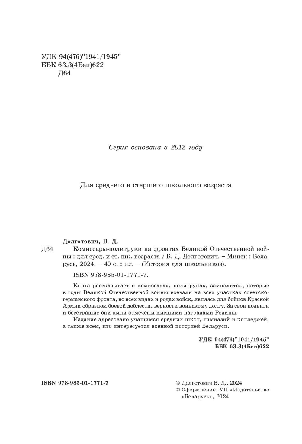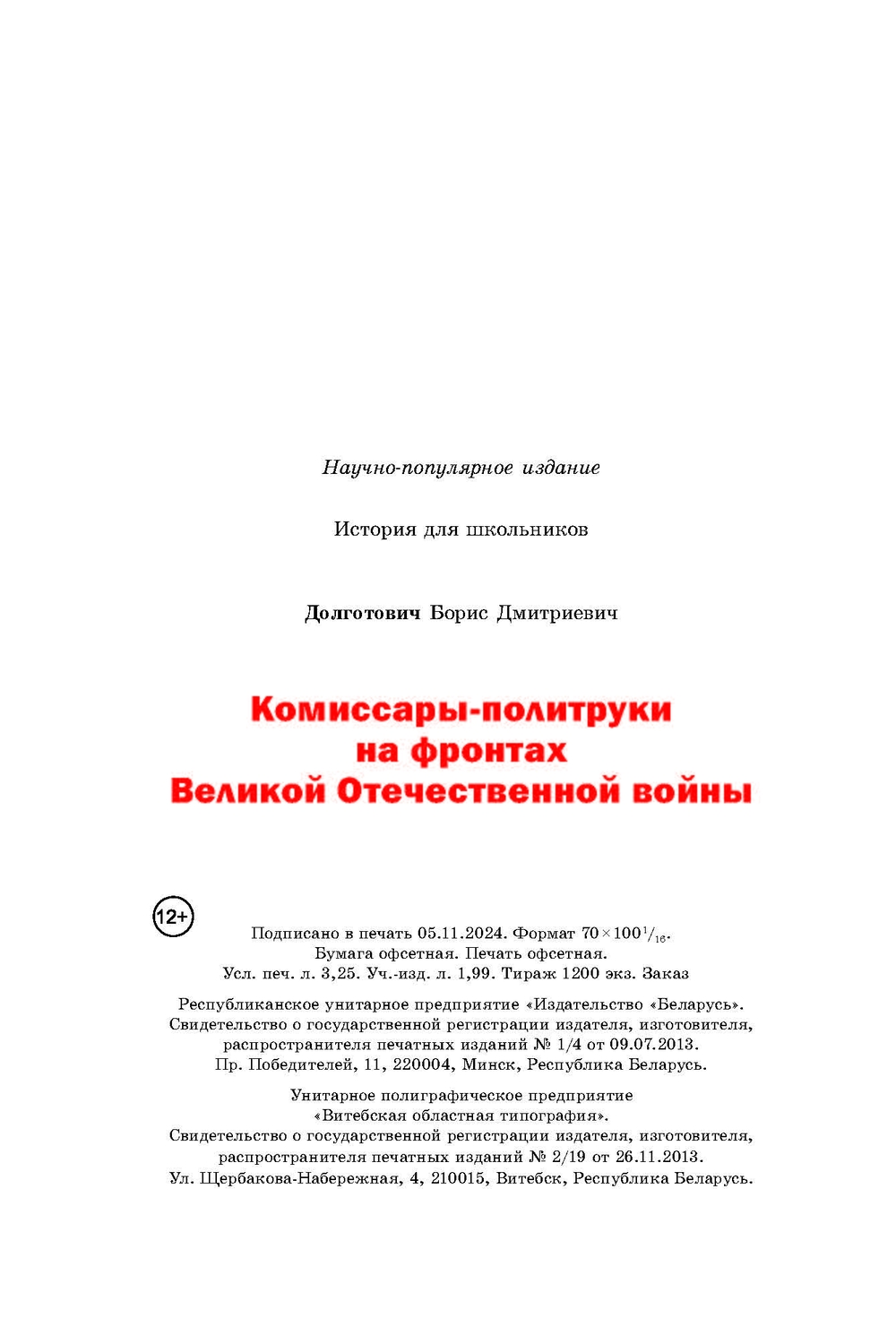 Книга рассказывает о комиссарах, политруках, замполитах, которые в годы Великой Отечественной войны воевали на всех участках советско-германского фронта, во всех видах и родах войск, являясь для бойцов Красной Армии образцом боевой доблести, верности воинскому долгу. За свои подвиги и бесстрашие они были отмечены высшими наградами Родины.