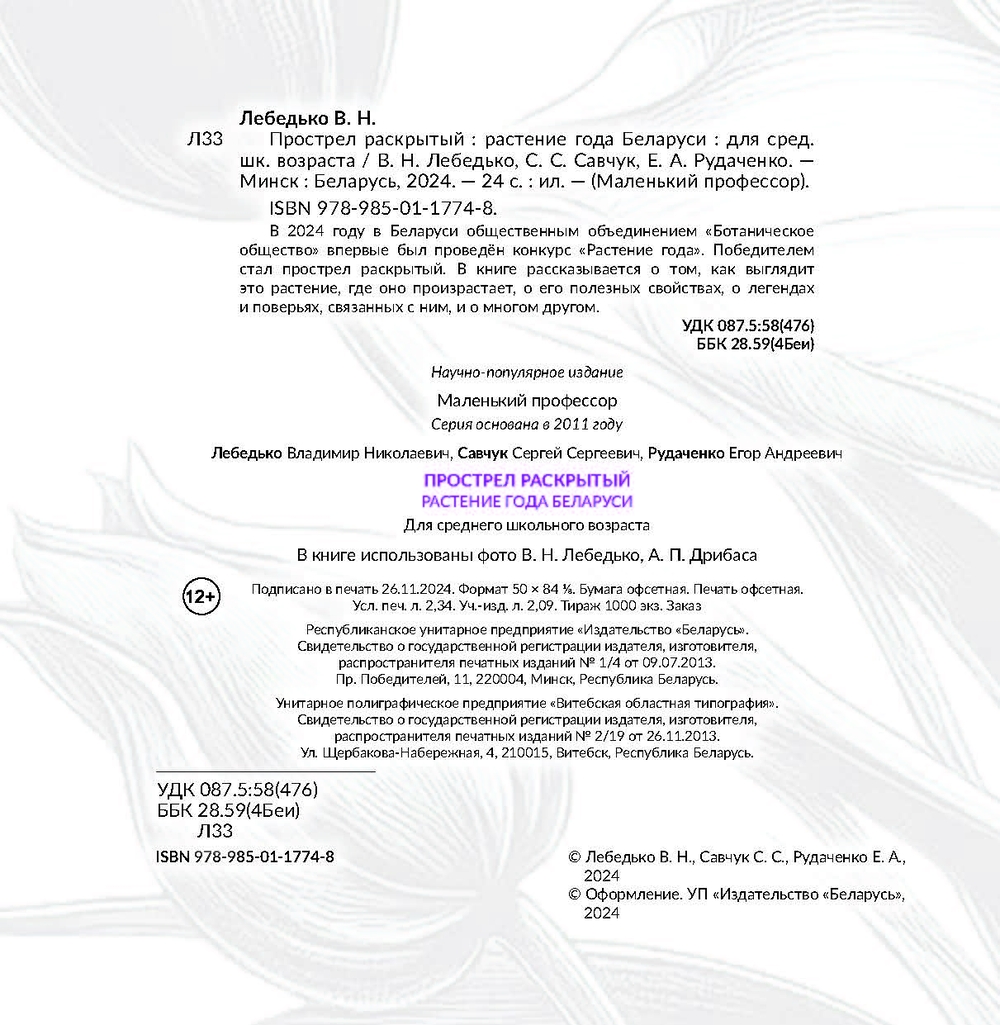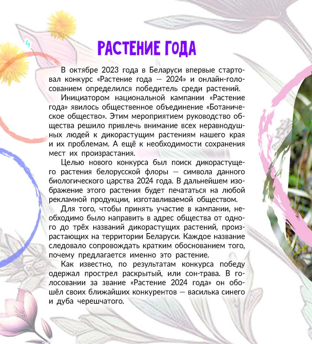 В 2024 году в Беларуси общественным объединением "Ботаническое общество" впервые был проведён конкурс "Растение года". Победителем стал прострел раскрытый. В книге рассказывается о том, как выглядит это растение, где оно произрастает, о его полезных свойствах, о легендах и поверьях, связанных с ним, и о многом другом.