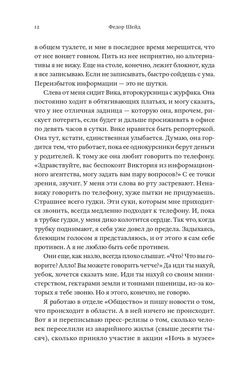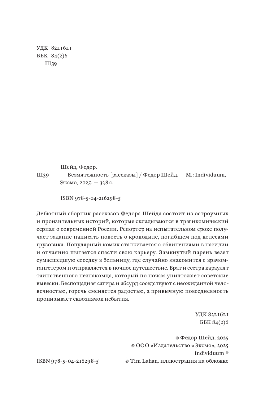 Дебютный сборник рассказов Федора Шейда состоит из остроумных и пронзительных историй, которые складываются в трагикомический сериал о современной России. Репортер на испытательном сроке получает задание написать новость о крокодиле, погибшем под колесами грузовика. Популярный комик сталкивается с обвинениями в насилии и отчаянно пытается спасти свою карьеру. Замкнутый парень везет сумасшедшую соседку в больницу, где случайно знакомится с врачом-гангстером и отправляется в ночное путешествие. Брат и сестра караулят таинственного незнакомца, который по ночам уничтожает советские вывески. Беспощадная сатира и абсурд соседствуют с неожиданной человечностью, горечь сменяется радостью, а привычную повседневность пронизывает сквознячок небытия.
