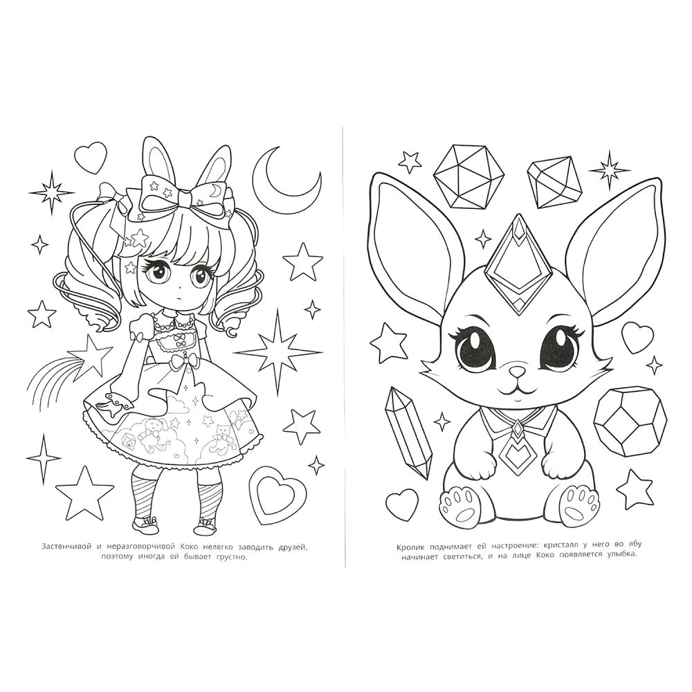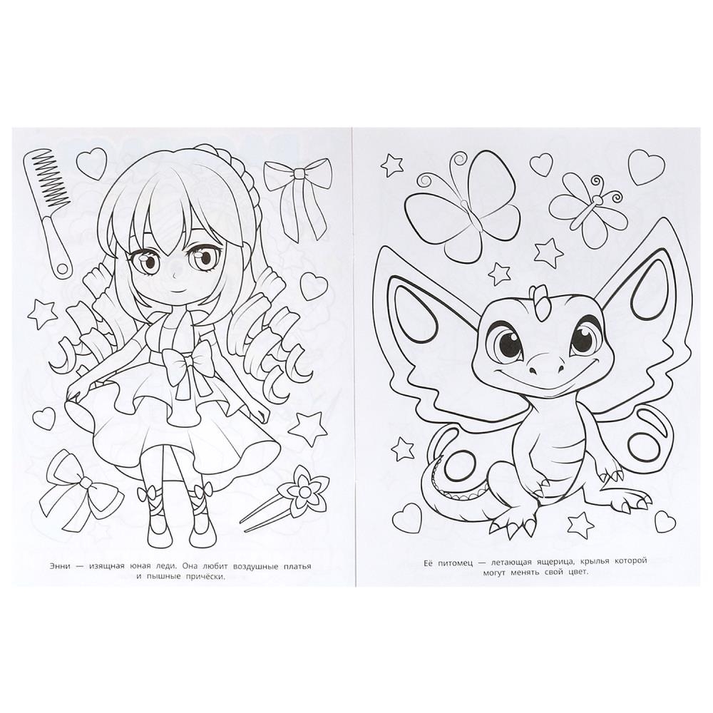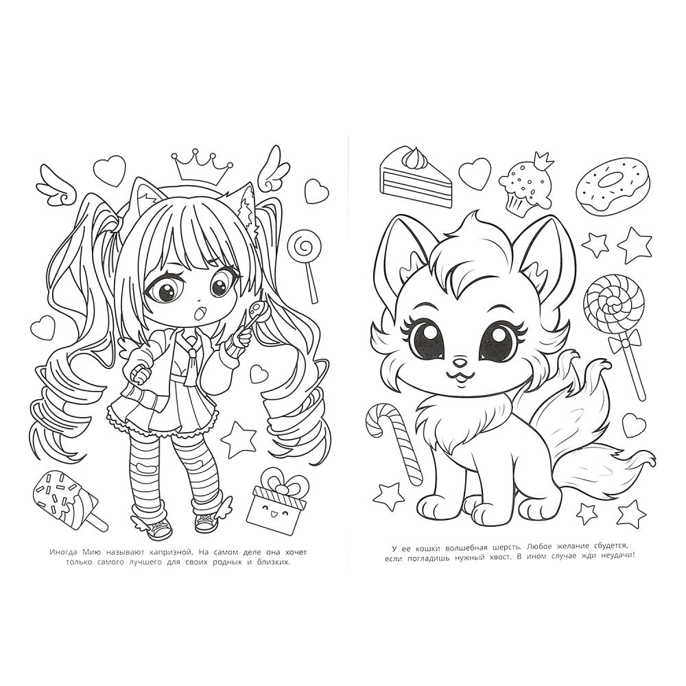 Эта увлекательная раскраска об аниме-девочках и их кавайных питомцах непременно понравится девочке. В ней она найдёт интересные картинки с чёткими контурами и сюжетными текстами к ним. Благодаря удобному формату раскраску можно взять с собой в путешествие.