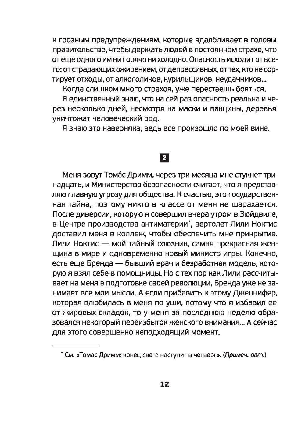 Томас однажды уже предотвратил конец света – и тут же невольно обрек человечество на новую опасность, оказавшись в центре чужих интриг. Он подозревает, что за эпидемией стоит злой умысел, вот только чей? И кому доверять в этом мире, который будто вывернулся наизнанку: "зеленые легкие" города вот-вот его задушат, влюбленная в Томаса одноклассница пытается его убить, а рохля отец вдруг превращается в важную политическую фигуру... Да еще и старый знакомый, профессор Пиктон, снова дает о себе знать – и заявляет, что судьба всего мира опять в руках Томаса Дримма.