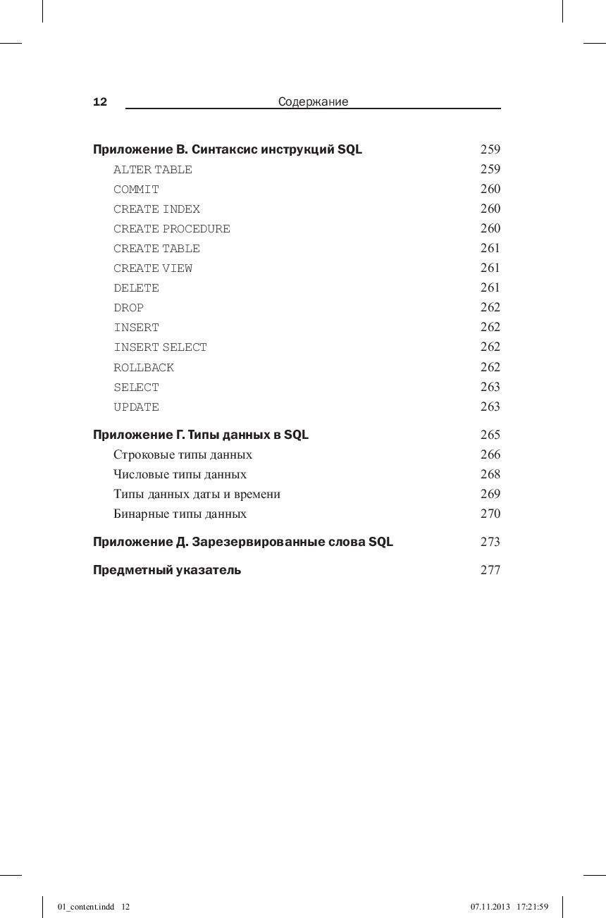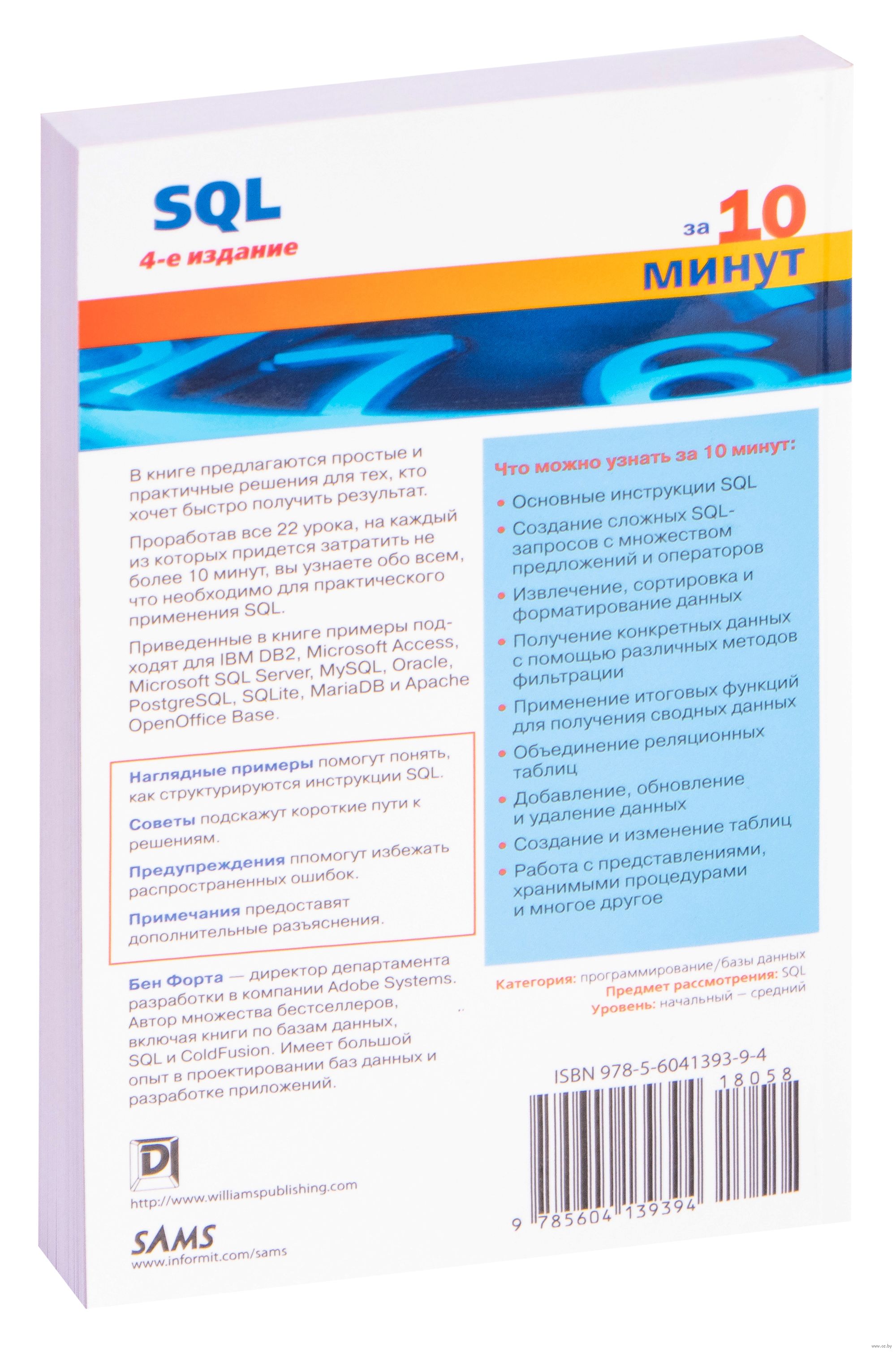 В книге "SQL за 10 минут" предлагаются простые и практичные решения для тех, кто хочет быстро получить результат. Проработав все 22 урока, на каждый из которых придется затратить не более 10 минут, вы узнаете обо всем, что необходимо для практического применения SQL. Приведенные в книге примеры подходят для IBM DB2, Microsoft Access, Microsoft SQL Server, MySQL, Oracle, PostgreSQL, SQLite, MariaDB и Apache OpenOffice Base.