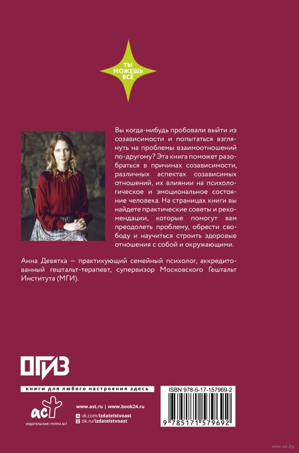 В своей книге Анна Девятка, психолог с многолетним опытом работы, в полной мере раскрывает явление созависимости, ее причины, последствия, механизмы возникновения созависимых отношений, их влияние на человека. Практические рекомендации и авторские упражнения помогут разобраться в себе, своих чувствах и отношениях с окружающими, научат выстраивать здоровые и гармоничные отношения с родными, близкими, друзьями, коллегами. Книга будет полезна всем, кто попал в сладкую паутину созависимости и стремится преодолеть проблему.