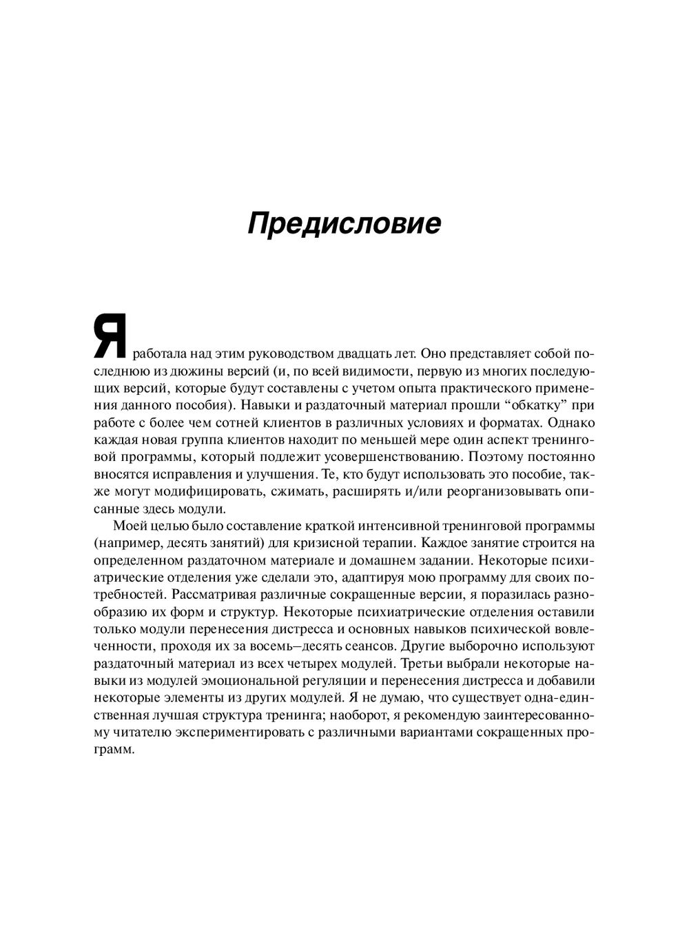 Руководство... содержит краткое объяснение ключевых позиций ДПТ, детальную структуру тренинговых сеансов, многочисленные упражнения, а также предназначенные для ксерокопирования образцы раздаточного материала и таблиц домашней отработки навыков.