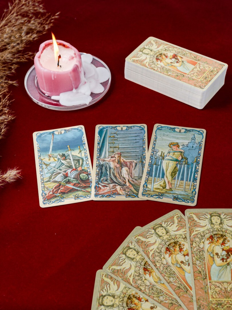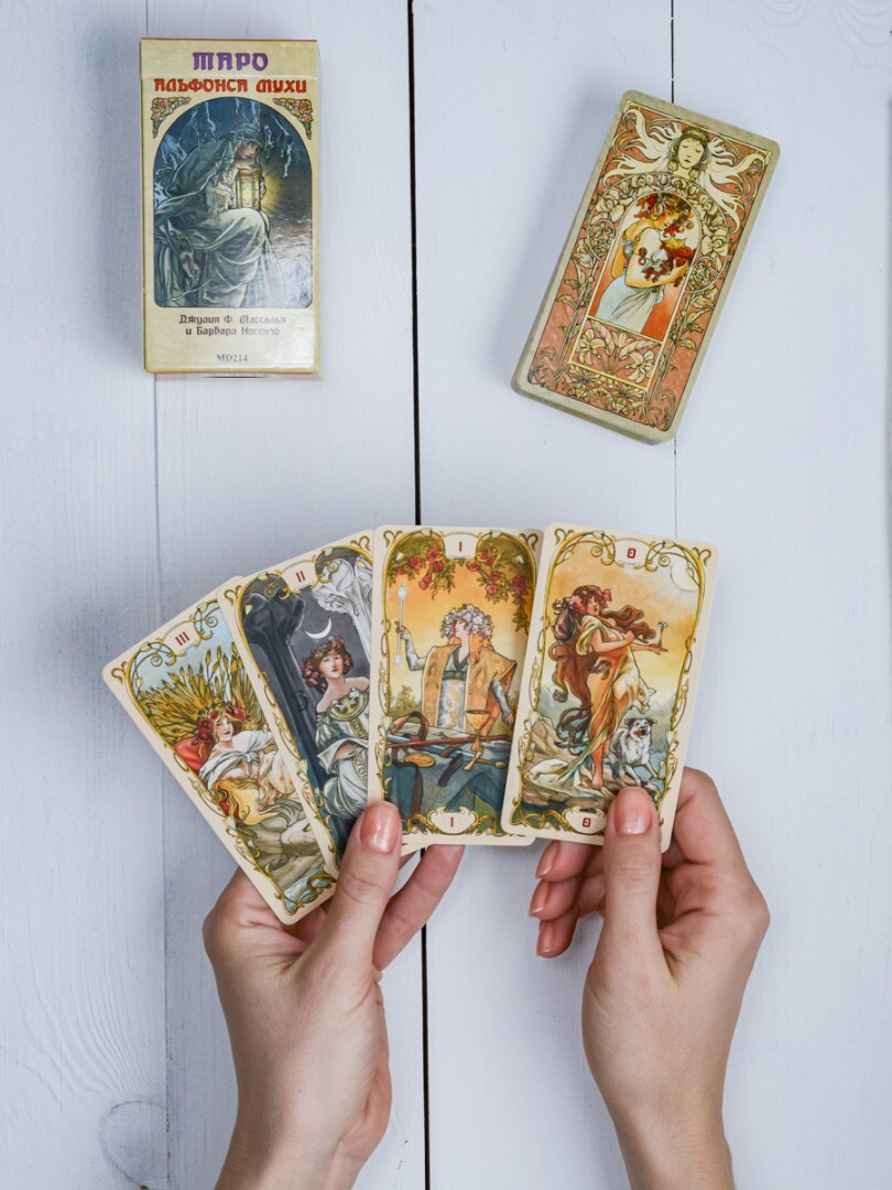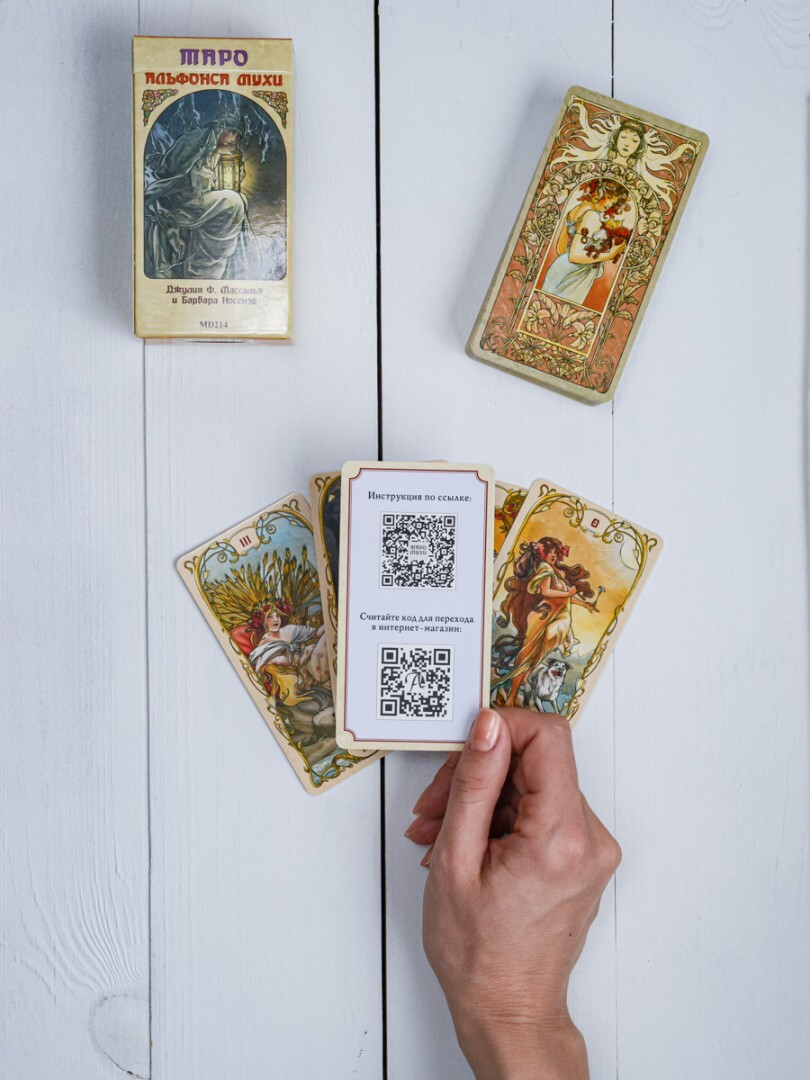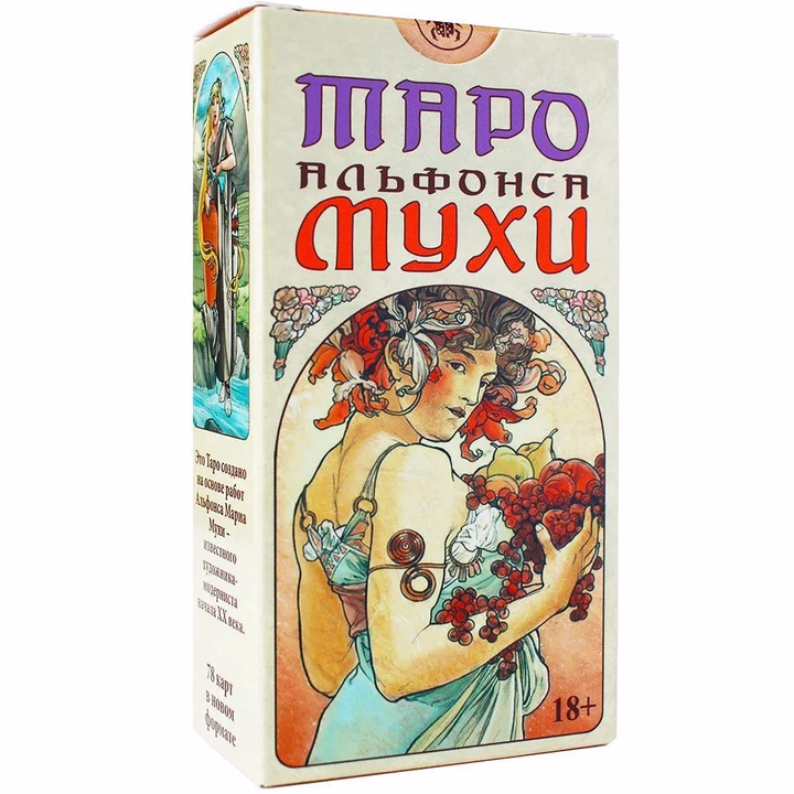 Это Таро вдохновлено живописью Альфонса Мухи, увлечённому вихрем новых течений в изобразительном искусстве на заре ХХ века, отдающего дань красоте, вечной мудрости и человеческой душе. Таро в соответствии с принципами композиции и стиля Мухи позволяет нам увидеть символику рисунков в новом ключе. Колода состоит из 78 карт и разделена на 2 части: Старшие Арканы и Младшие Арканы. Старшие Арканы – это 22 карты, пронумерованные от 0 до 21. Они символизируют архетипы, общие для всего человеческого опыта. Младшие Арканы – 56 карт, разделенных на 4 масти. Кубки говорят об отношениях и эмоциях. Пентакли показывают наши отношения с материальным миром. Мечи описывают то, как мы общаемся и рассказывают о конфликтах, которые приходят в нашу жизнь. И, наконец, Жезлы отображают сцены творческих озарений, порывов и страстей.