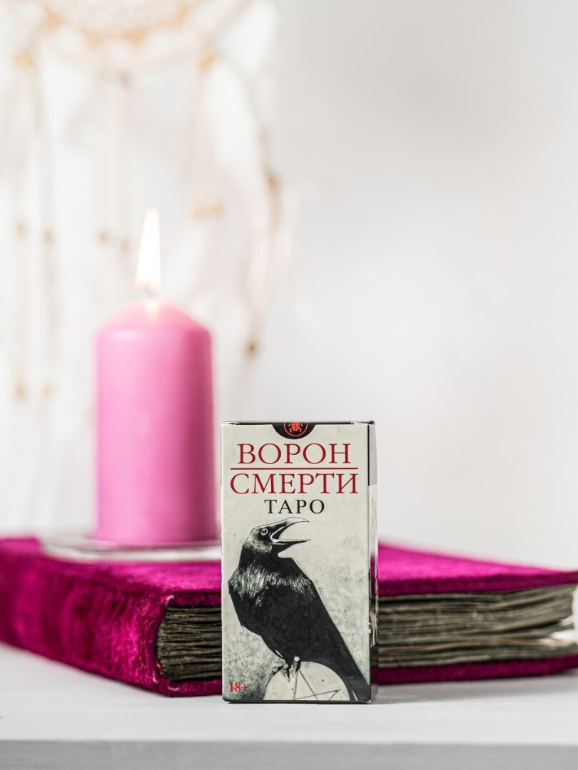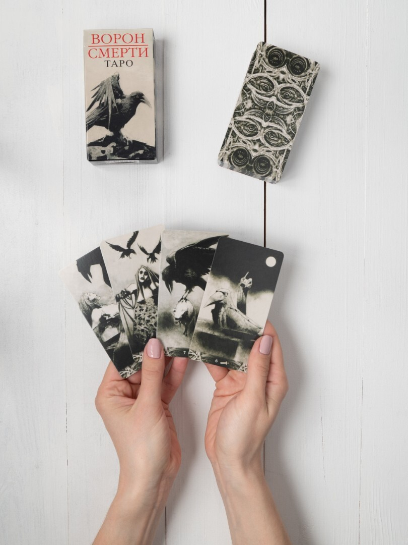Эта готическая колода черных карт принадлежит к новой серии Таро, в которой главным персонажем является Чёрный Ворон. Вороны – необычные существа, посланцы иного мира, частые спутники ворожбы и колдовства. Их присутствие порой пугает, предвещая беды и напасти, так как вороны первыми появляются там, где горе и смерть. Но Ворон также самая мудрая птица, и знает, как избежать этих несчастий, давая свой полезный совет через это Таро.