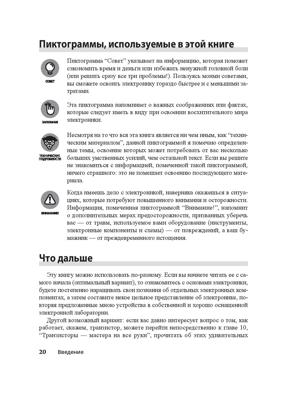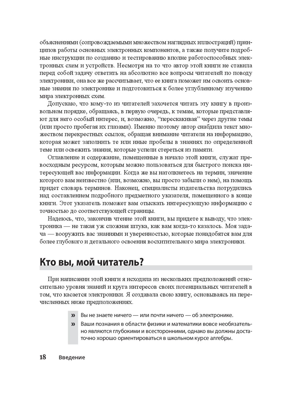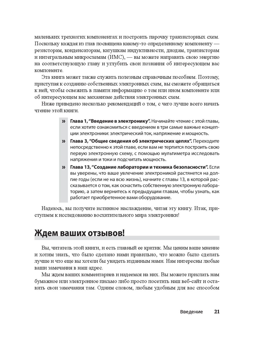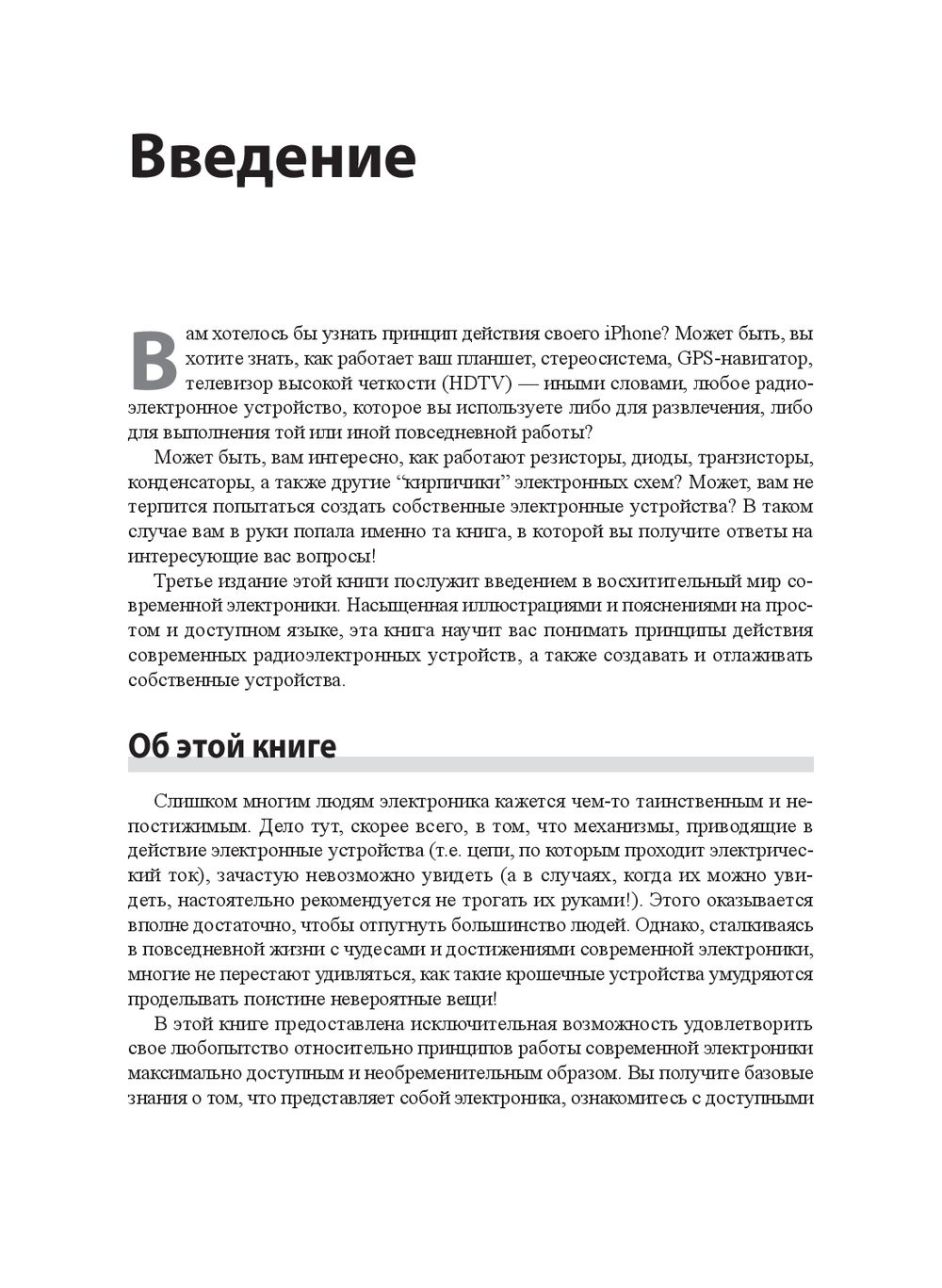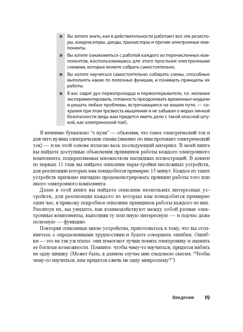 В этой книге вы найдете сотни схем и фотографий, в также подробнейшие рекомендации по проведению опытов, которые покажут вам, как работают те или иные электронные компоненты. В ней приведены советы по выбору и использованию важнейших инструментов, а также описание увлекательных электронных устройств, каждое из которых можно реализовать буквально за 30 минут (или даже еще быстрее!).