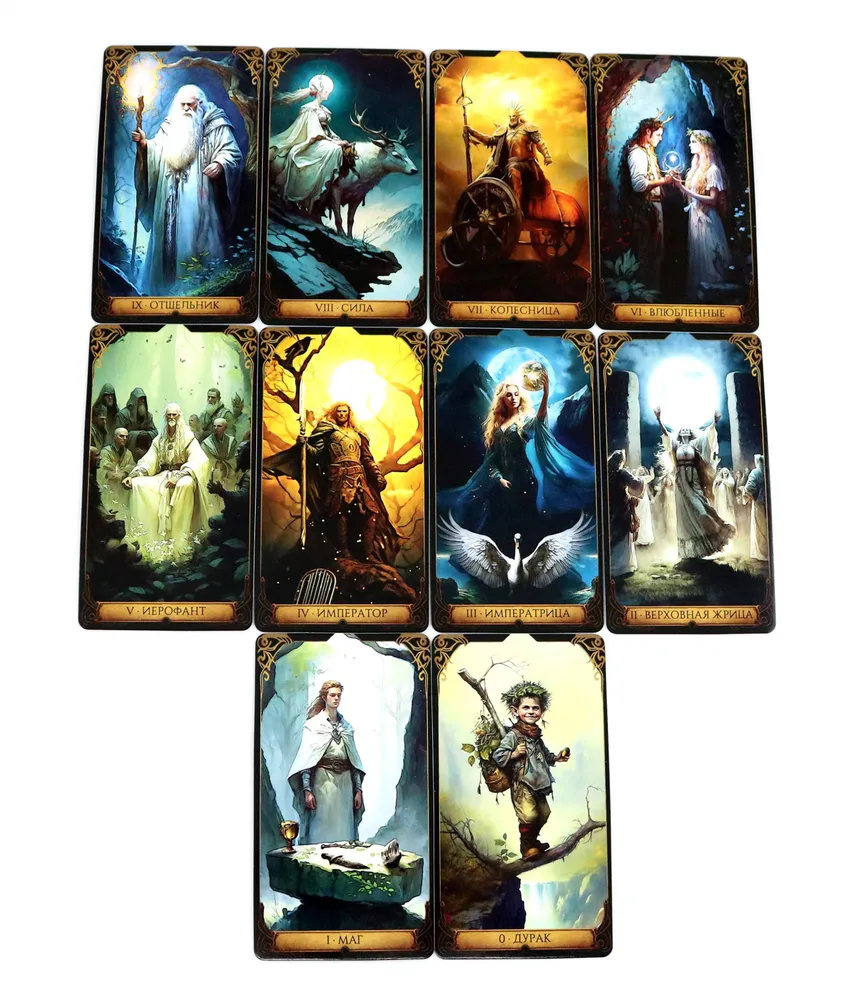 В этом Таро автор колоды Андреа Когерино, практикующий друидическую магию, воплощает свои неоценимые знания о кельтских преданиях и древних обрядах. Гипнотические иллюстрации португальского художника Дэвида Лопеса визуализируют персонажей друидических мифов. Карты этой колоды идеально совмещают структуру Таро, эзотерический подход и языческие традиции, олицетворяющие мощь природы и древних сил, применимых в наших повседневных гадательных практиках.