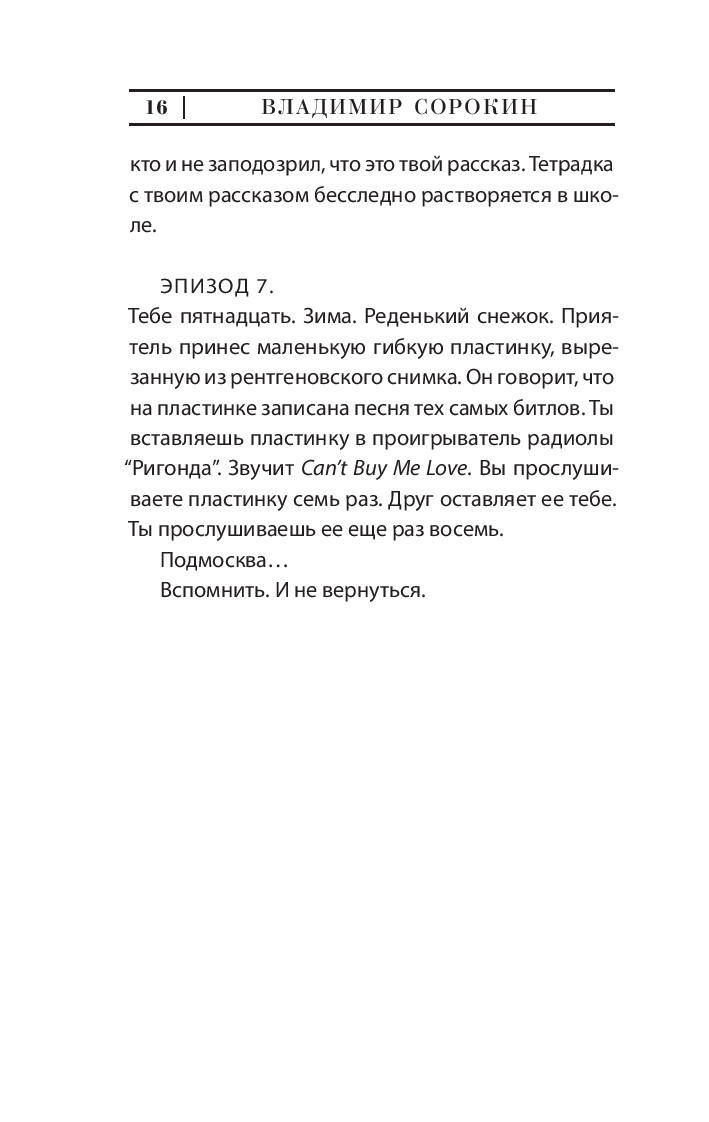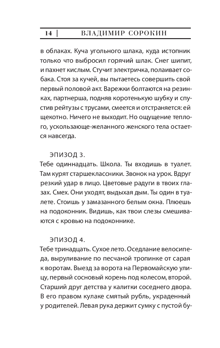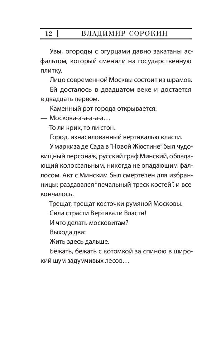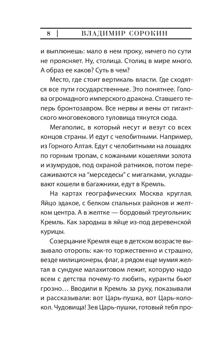 Особого внимания достойны тексты о художественной среде восьмидесятых, сформировавшей Сорокина как писателя. Называя последнее десятилетие существования СССР “разрывным временем”, когда “процесс стал теснить состояние”, Сорокин показывает, как стремительно разрывало тогда привычную картину мира, отказывалось от рамок неподцензурное искусство. Это свидетельство участника “процесса” ценно не только для историков искусства, но и для рядового обывателя, у которого восьмидесятые ассоциируются то ли с бесконечной очередью, героиней и сюжетом первого романа Сорокина, то ли с партийным санаторием. Для современника, не слышавшего в те времена имперского распада о Пригове, Кабакове и московском андеграунде.