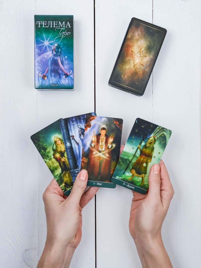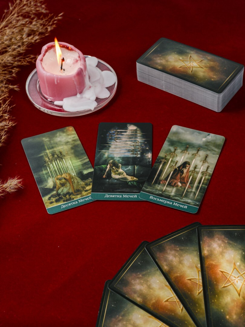 Колода состоит из 78 карт и разделена на 2 части: Старшие Арканы и Младшие Арканы. Старшие Арканы – это 22 карты, пронумерованные от 0 до 21. Они символизируют Архетипы, общие для всего человеческого опыта. Младшие Арканы – 56 карт, разделенных на 4 масти. Кубки говорят об отношениях и эмоциях. Пентакли показывают наши отношения с материальным миром. Мечи описывают то, как мы общаемся и рассказывают о конфликтах, которые приходят в нашу жизнь. И, наконец, Жезлы изображают сцены творческих озарений, порывов и страстей.