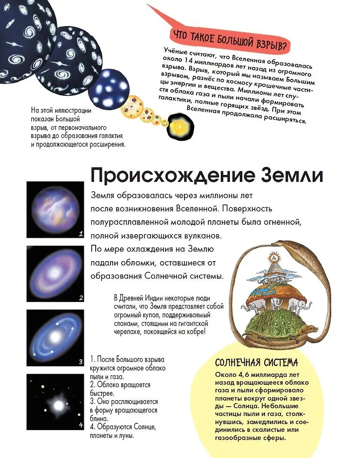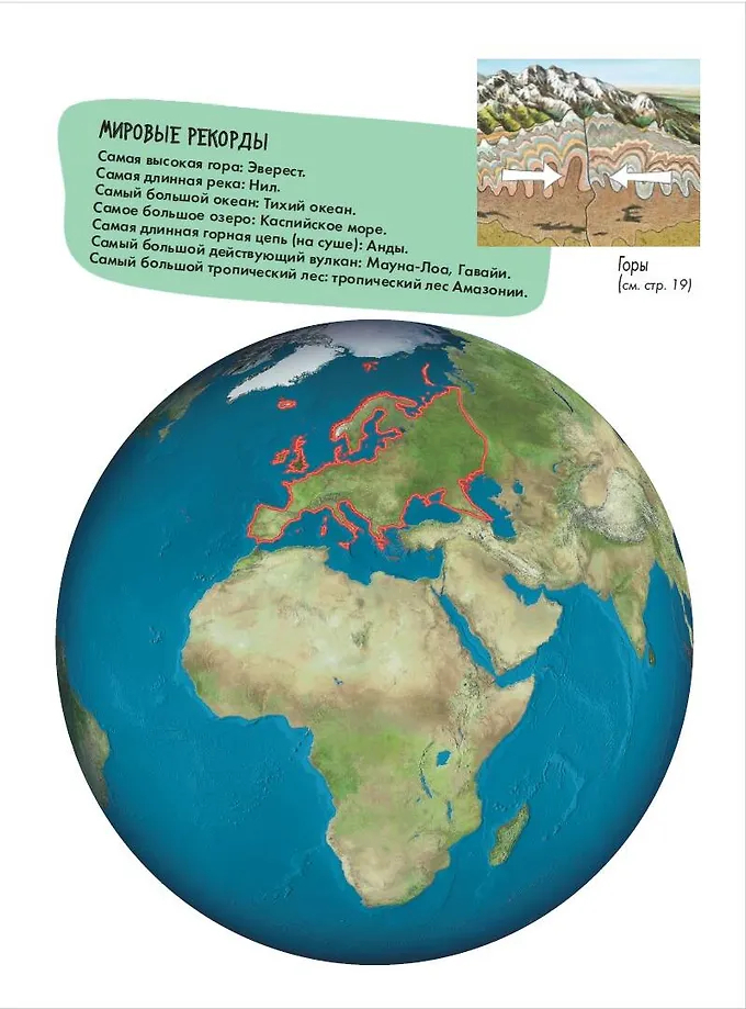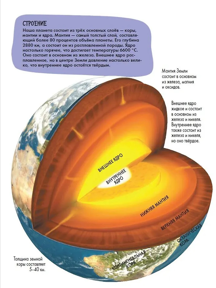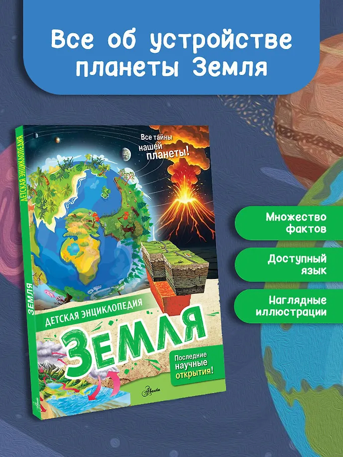 От атмосферы до ядра Земли, от городов до полей и пастбищ, от океанских глубин до гор и вулканов. Книга прекрасно подойдёт для первого знакомства с историей и устройством планеты, на которой мы живём. Множество полезных фактов и информативные иллюстрации обязательно заинтересуют юных читателей и помогут в будущих школьных проектах.