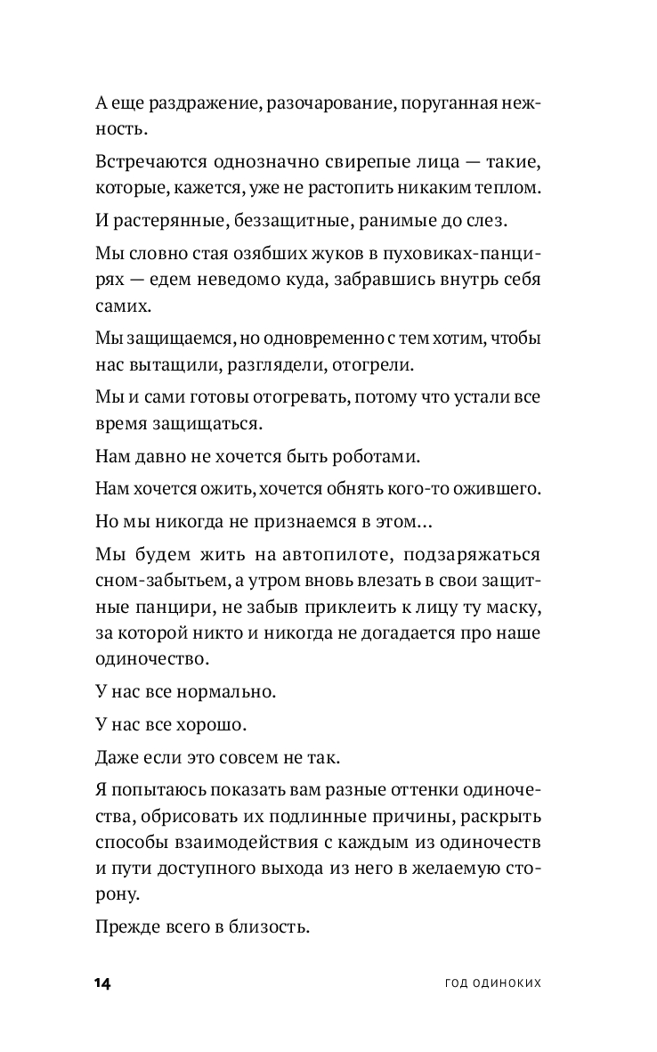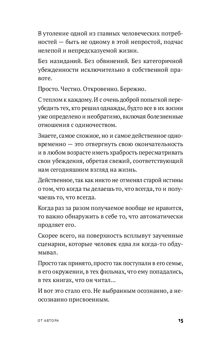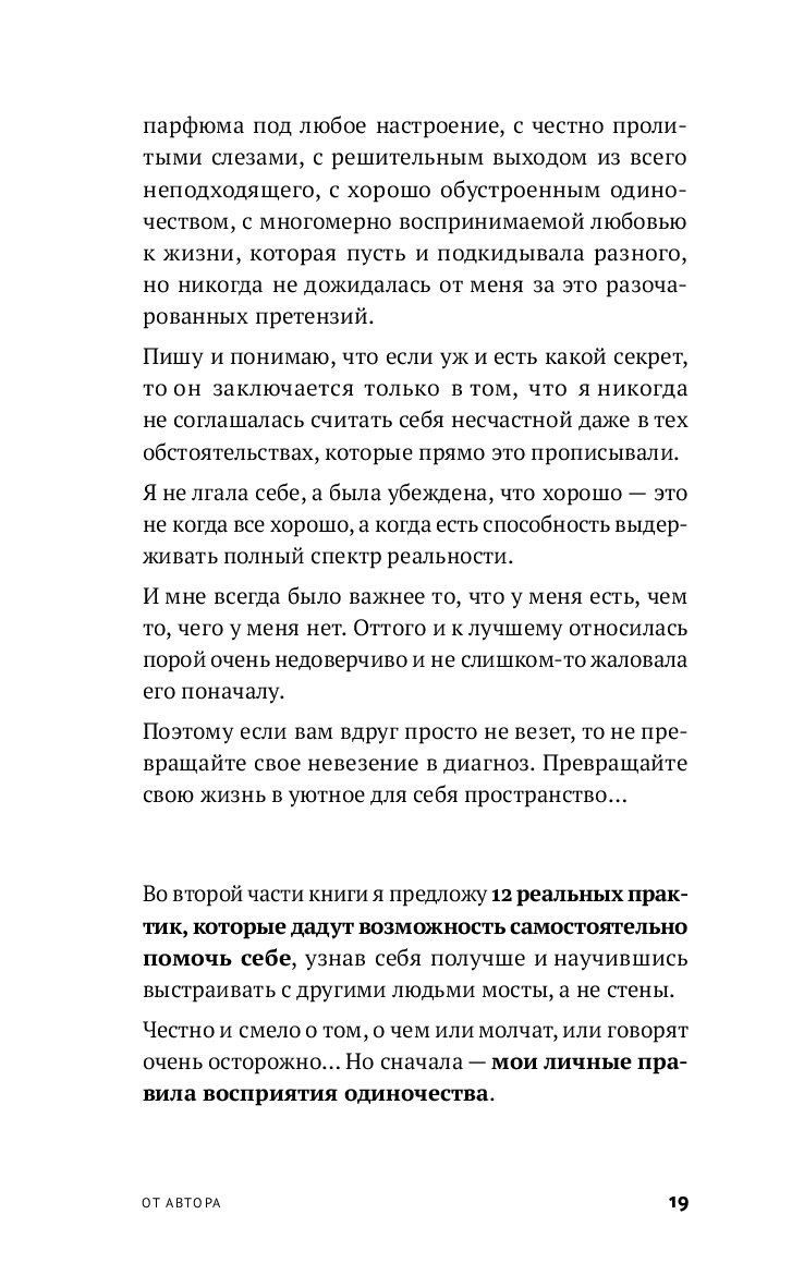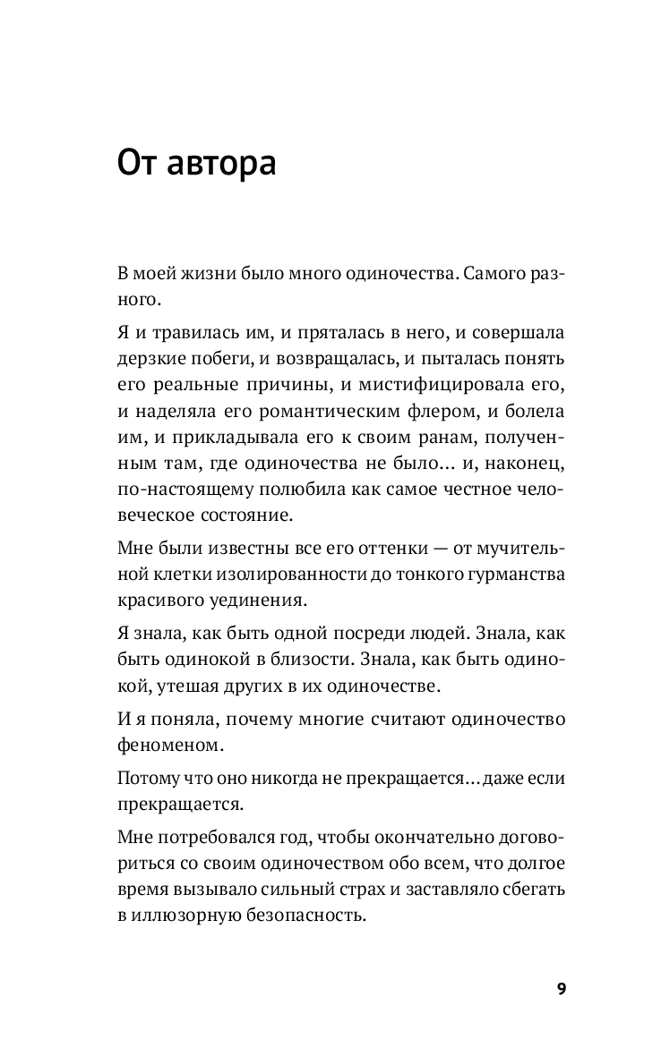 Автор приводит примеры жизненных историй, среди которых вы наверняка повстречаете и свою. Она также предлагает 12 практик шагов, которые помогут вам избавиться от горького, порой невыносимого чувства тоски и отчуждения. Ведь только обустроив свое одиночество и установив с ним честный контакт, считает автор, можно обрести близость с другими людьми, не используя их для заполнения собственных пустот.