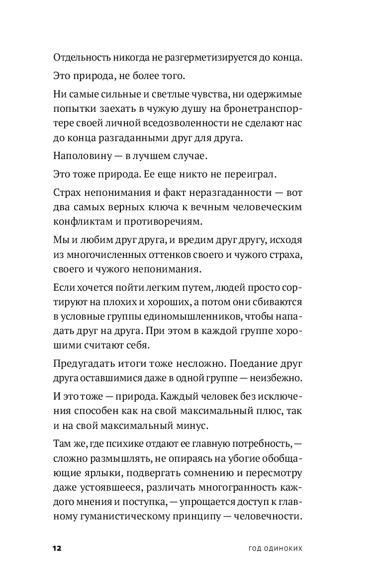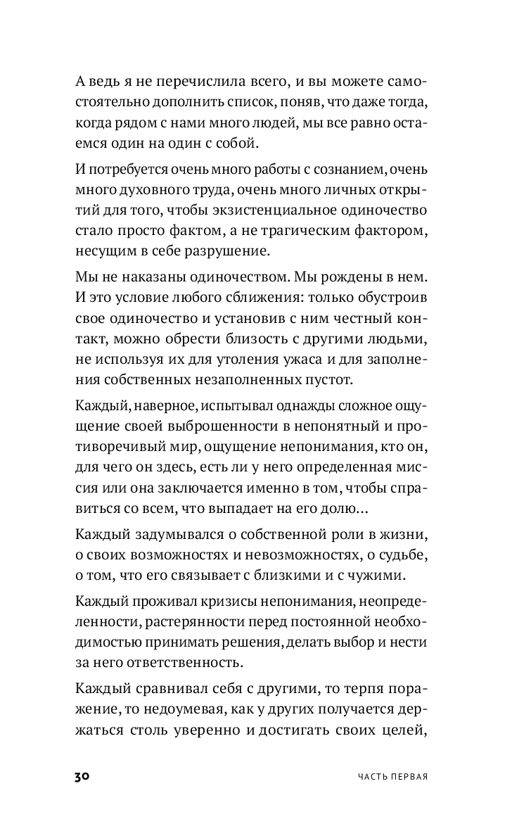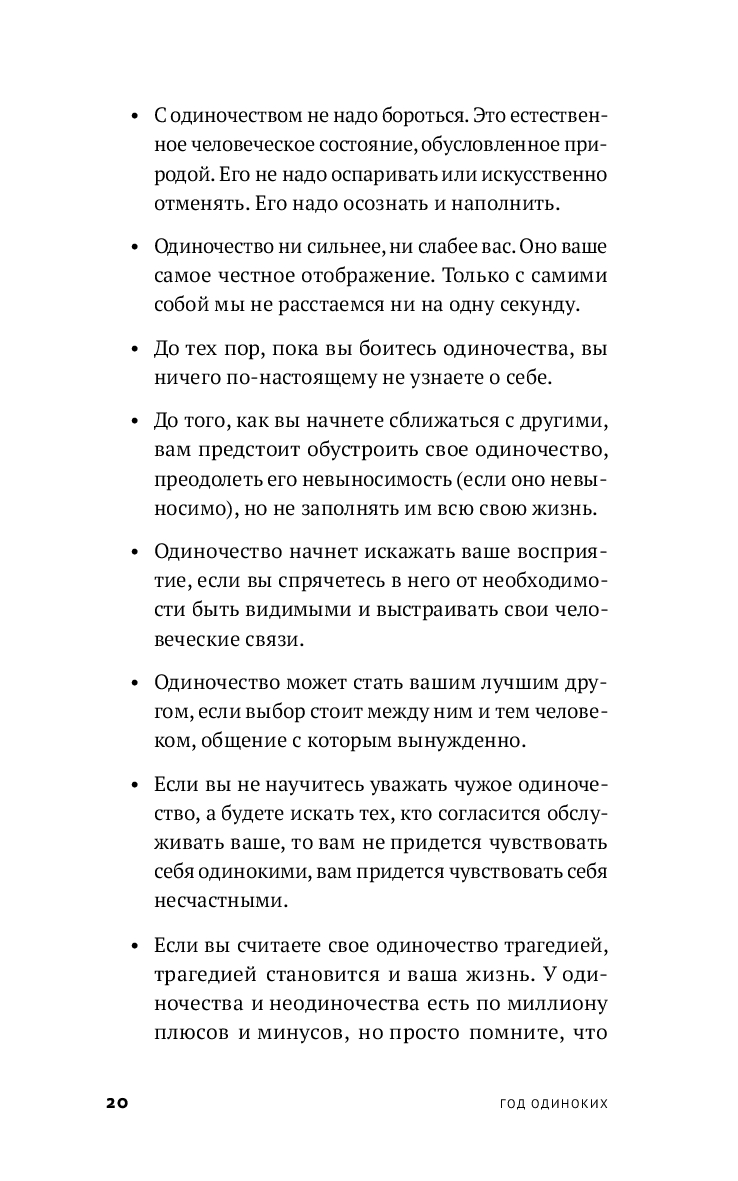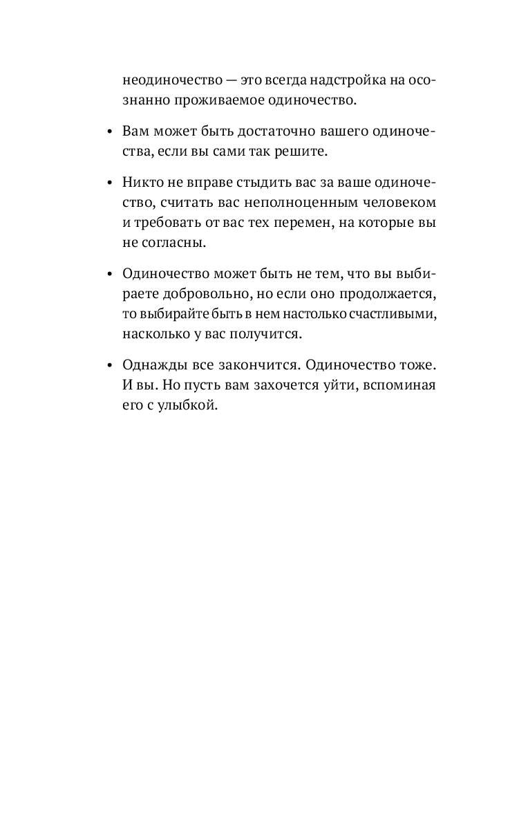 Автор приводит примеры жизненных историй, среди которых вы наверняка повстречаете и свою. Она также предлагает 12 практик шагов, которые помогут вам избавиться от горького, порой невыносимого чувства тоски и отчуждения. Ведь только обустроив свое одиночество и установив с ним честный контакт, считает автор, можно обрести близость с другими людьми, не используя их для заполнения собственных пустот.