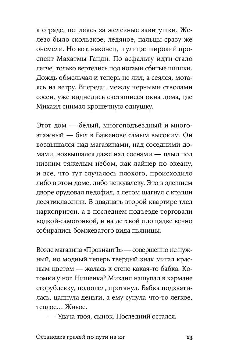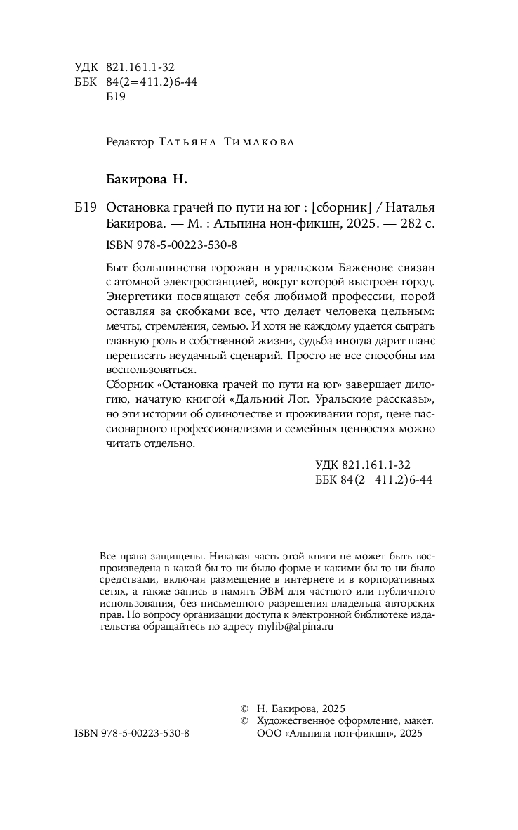 Сборник "Остановка грачей по пути на юг" завершает дилогию, начатую книгой "Дальний Лог. Уральские рассказы", но эти истории об одиночестве и проживании горя, цене пассионарного профессионализма и семейных ценностях можно читать отдельно.