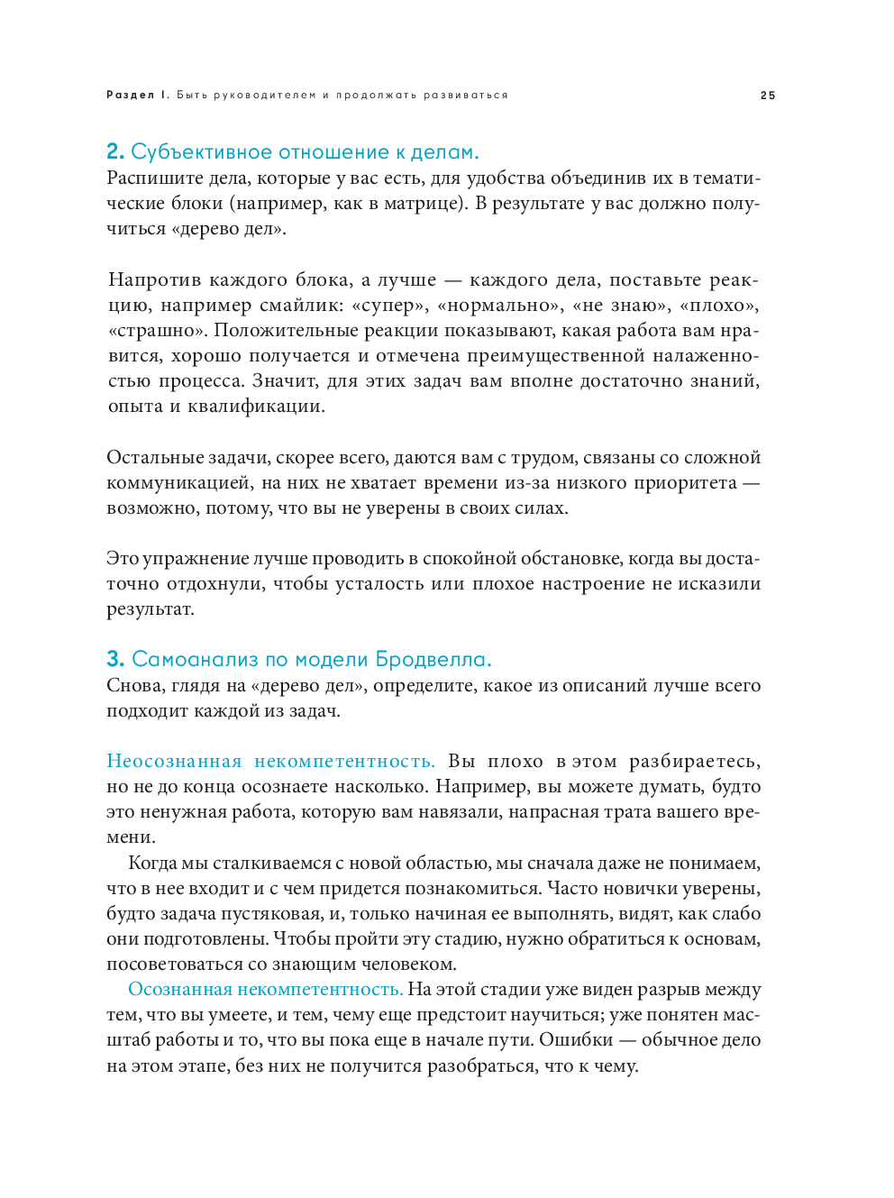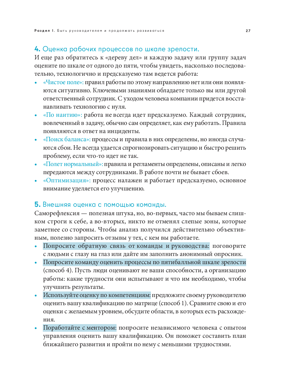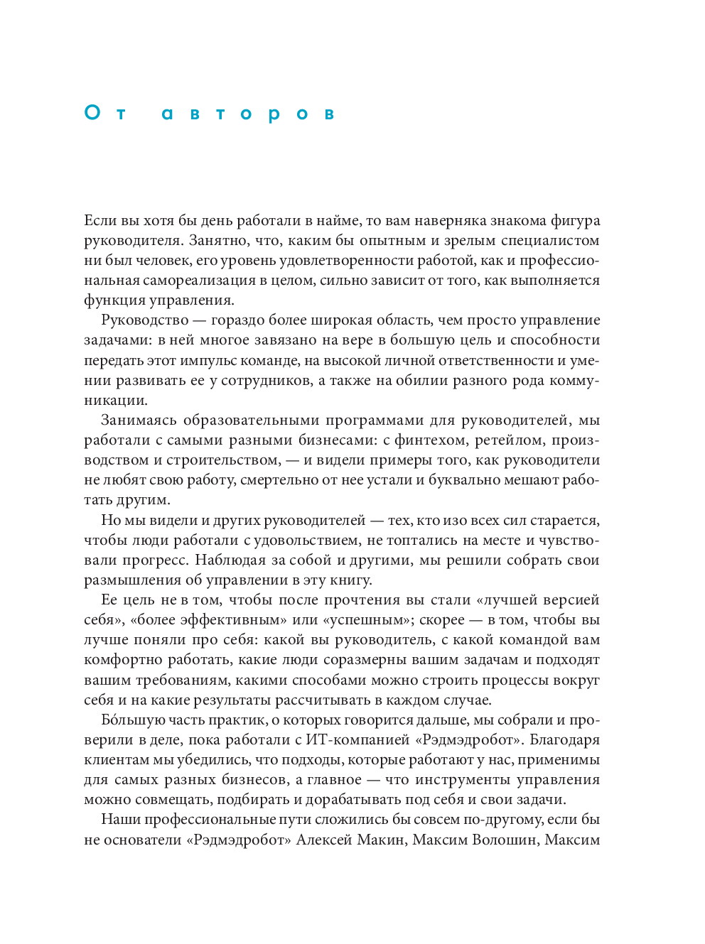 Читая книгу, опытный руководитель сможет провести "инвентаризацию" привычных инструментов управления и дополнить их лучшими практиками от авторов книги. Начинающий руководитель познакомится с широким набором техник, которые полезно освоить и сочетать между собой.