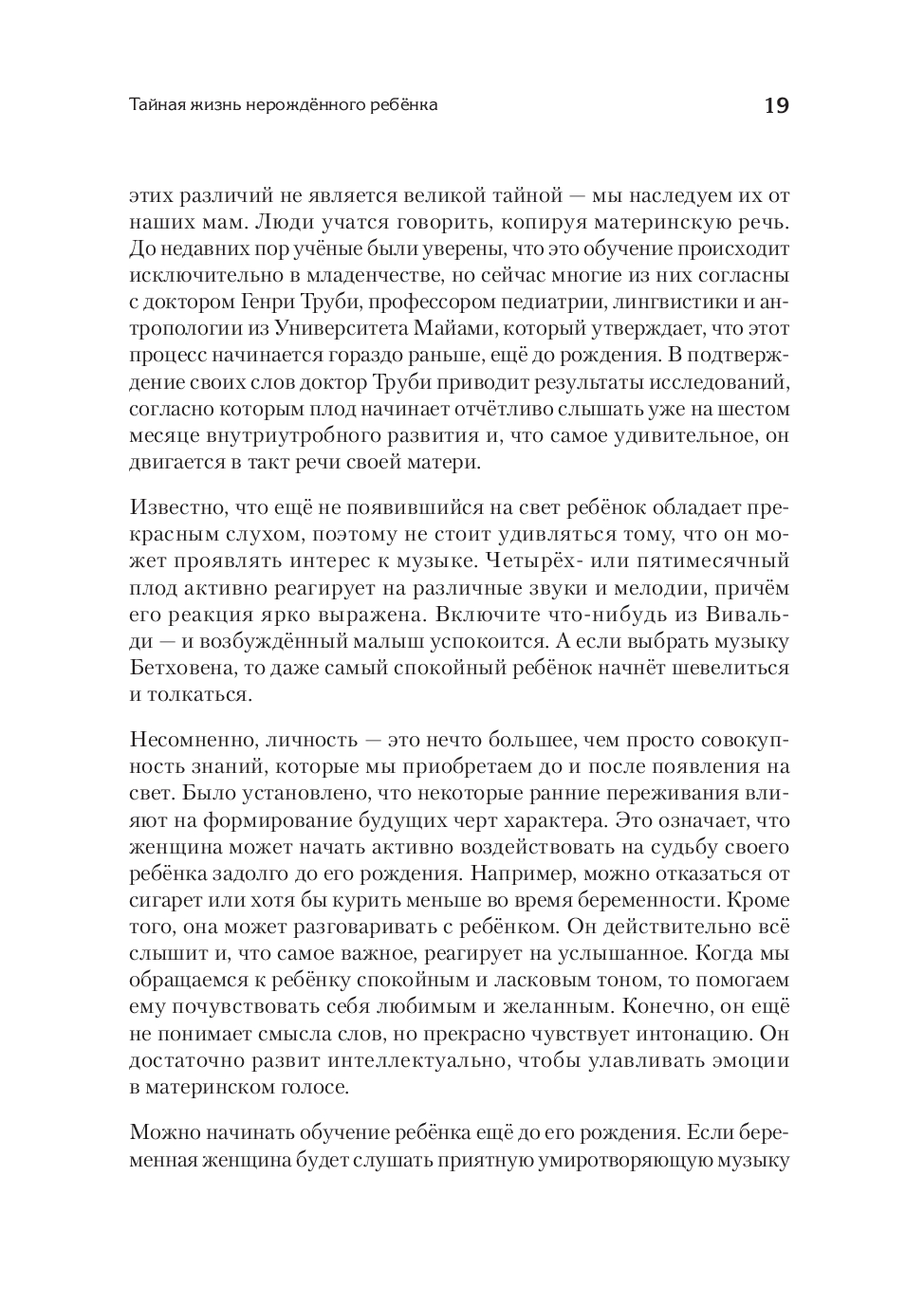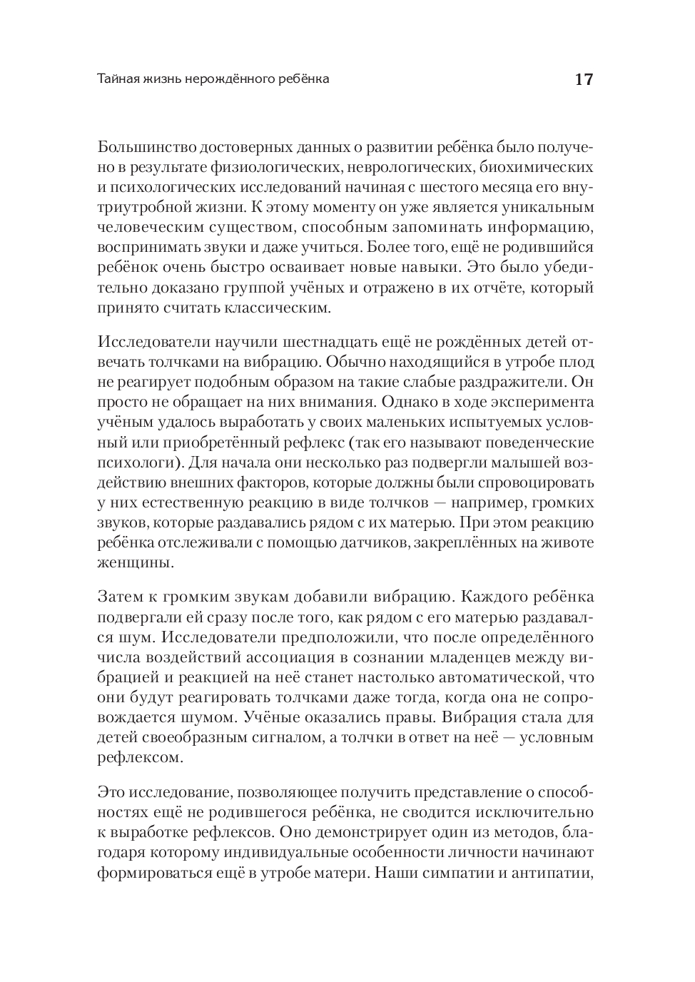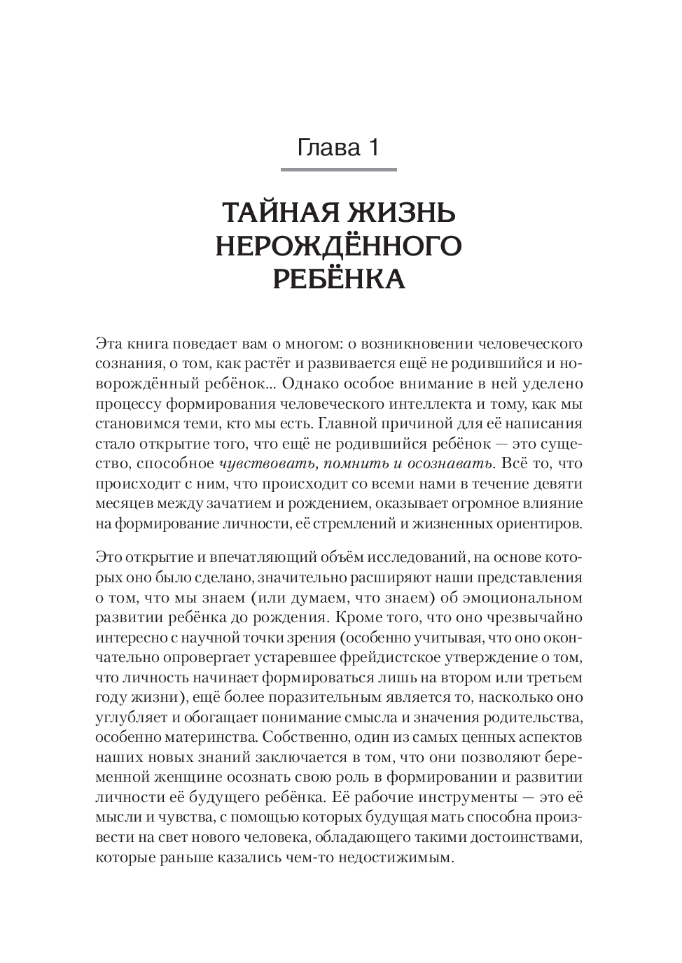 Перед вами книга Томаса Верни – классика перинатальной психологии, которая навсегда изменила представление о жизни ребенка до рождения. В ней приведены поразительные доказательства, основанные на двух десятилетиях медицинских исследований, что нерожденный ребенок думает, чувствует и даже действует. И то, что происходит с ним за 9 месяцев, предшествующих его рождению, может глубоко повлиять на то, каким человеком он станет. Это открытие дает нам шанс выбрать, как будет протекать жизнь наших детей – до рождения и после него.