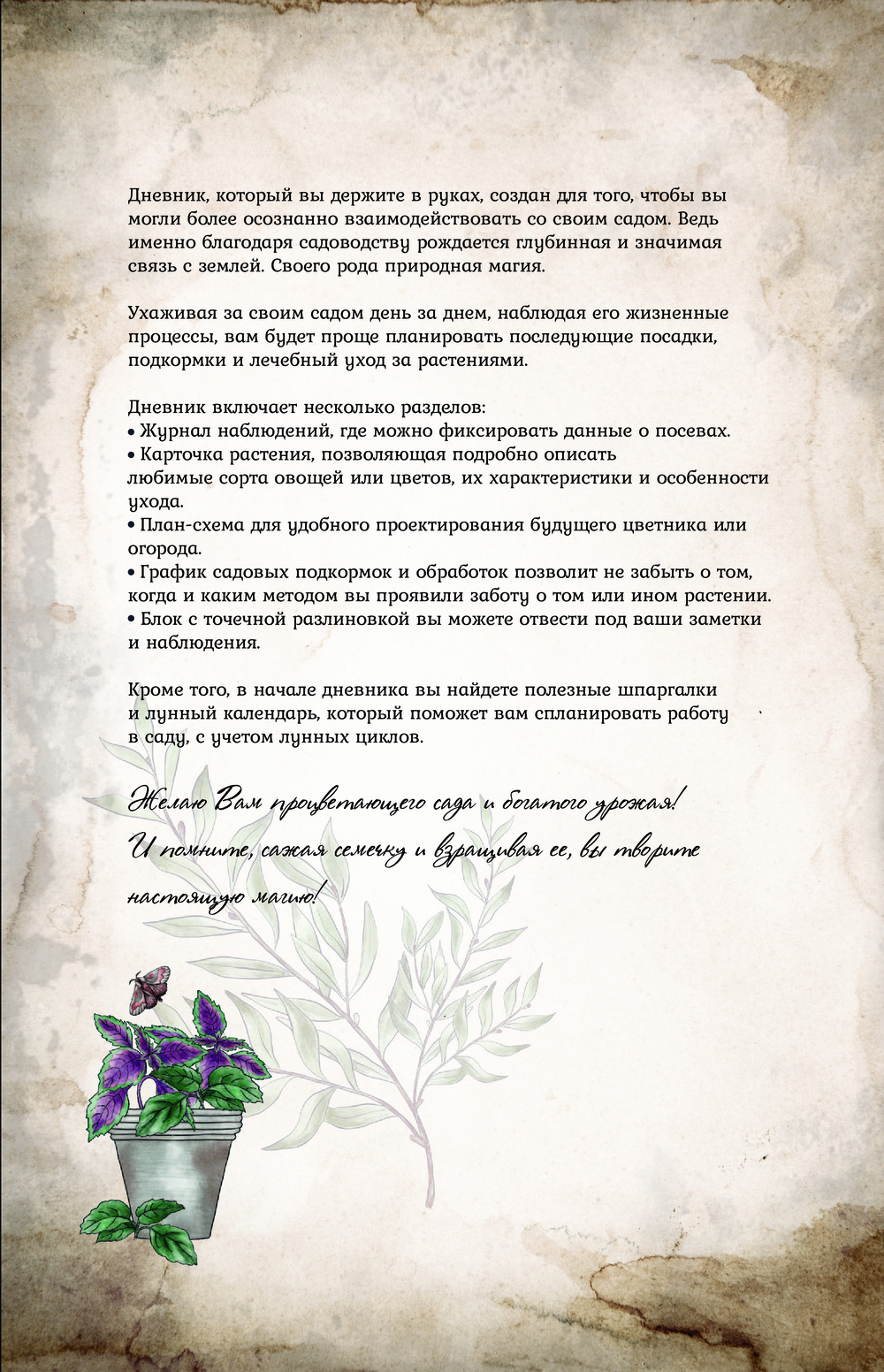 С нашим дневником ваши усилия обязательно окупятся прекрасным садом, полным жизни и магии природы. Начните свою садоводческую историю с идеального планирования и ухода. Подарите своему саду любовь, и он ответит вам щедрым урожаем!