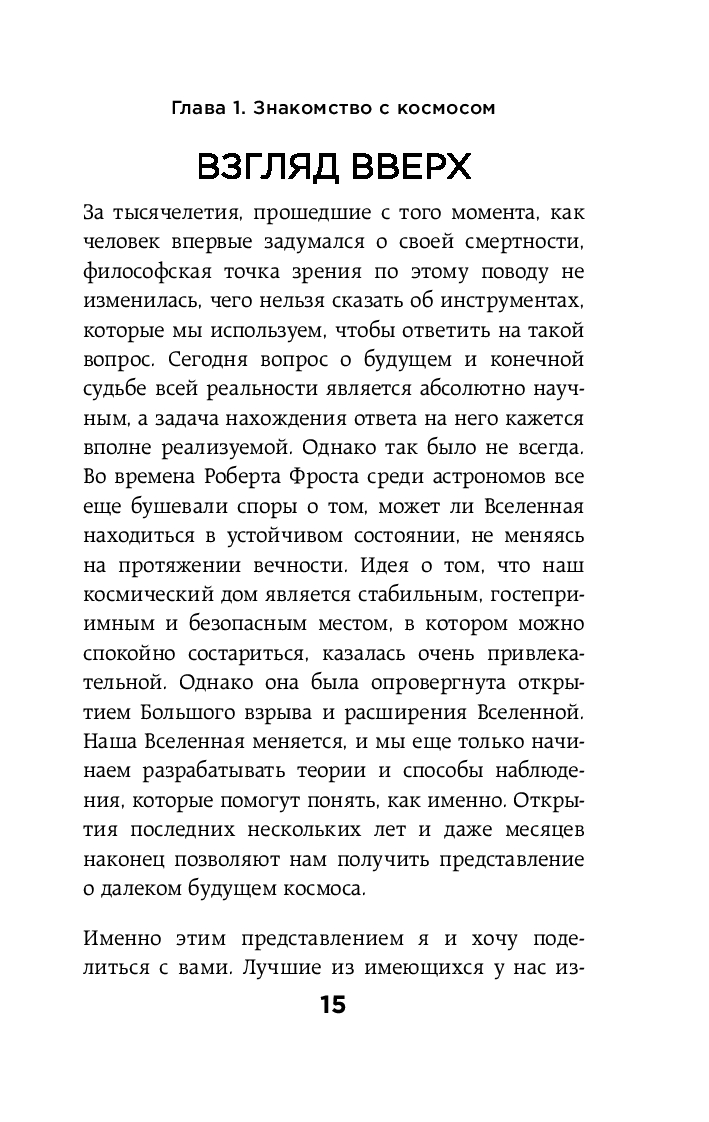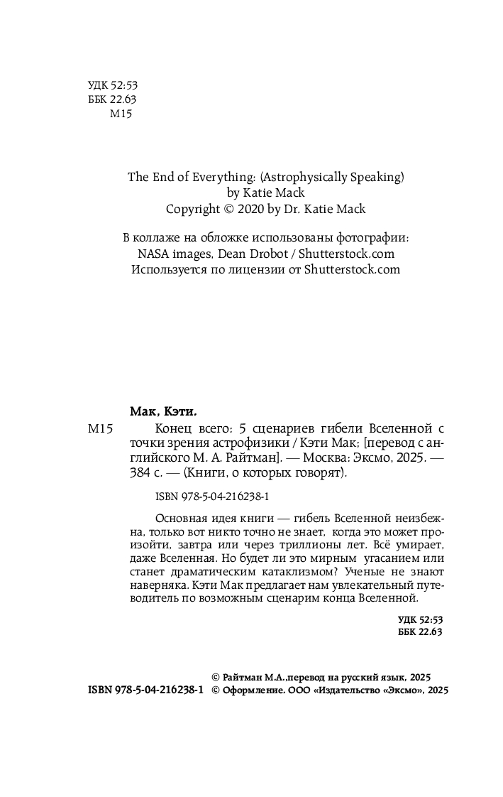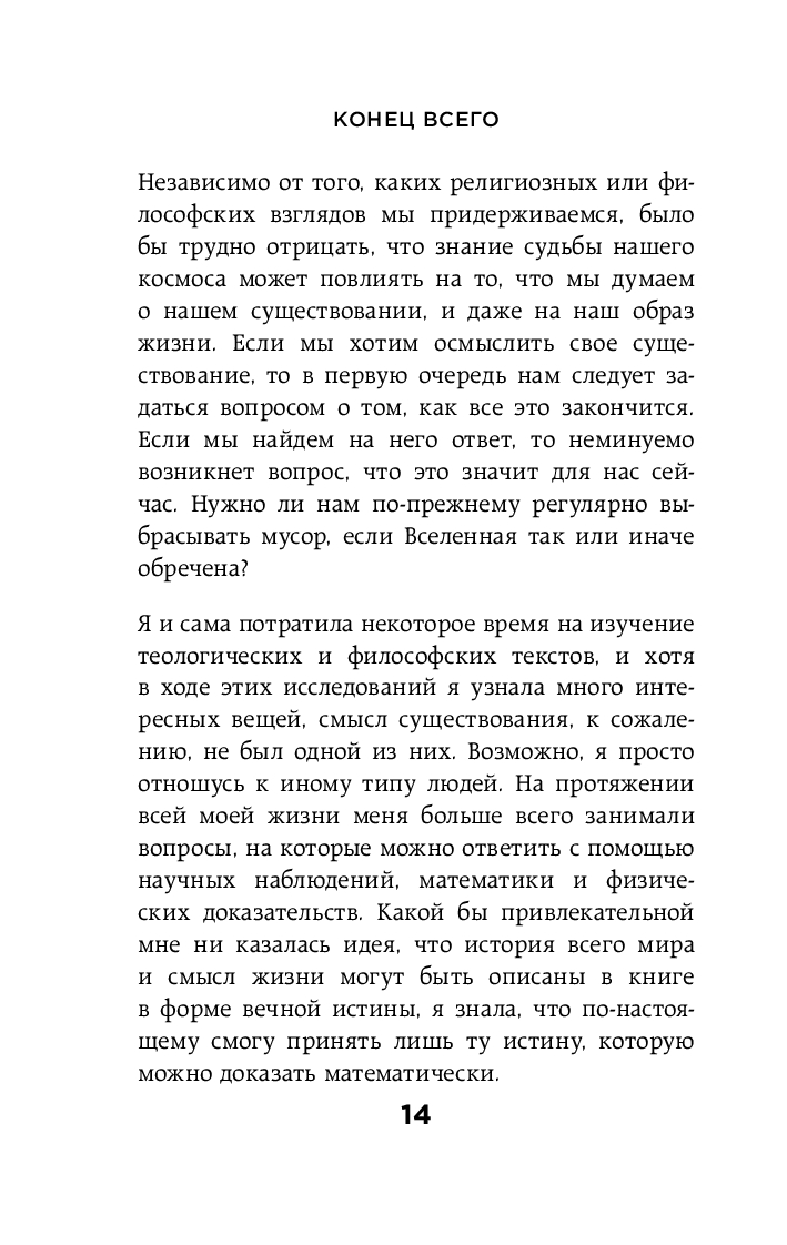 Основная идея книги – гибель Вселенной неизбежна, только вот никто точно не знает, когда это может произойти, завтра или через триллионы лет. Всё умирает, даже Вселенная. Но будет ли это мирным угасанием или станет драматическим катаклизмом? Ученые не знают наверняка. Кэти Мак предлагает нам увлекательный путеводитель по возможным сценариям конца Вселенной.
