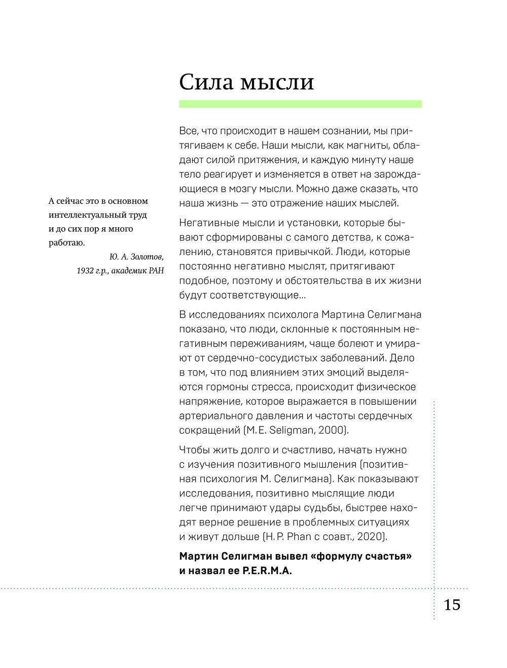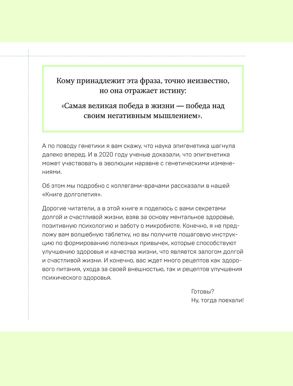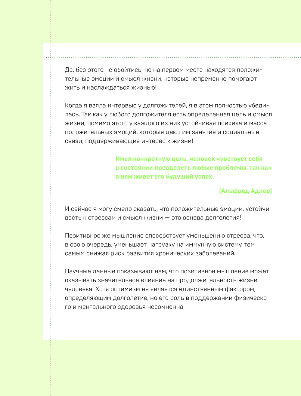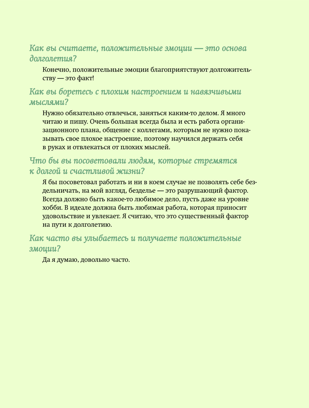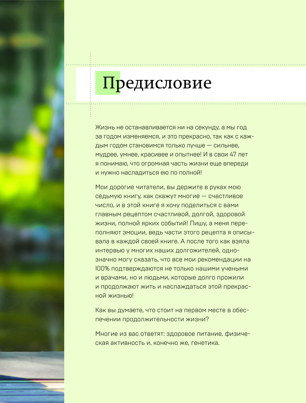 Особенностью этой книги являются интервью с долгожителями, которые взяты Оксаной у людей, которым 90 и 100 лет и которые продолжают жить и радоваться жизни!
