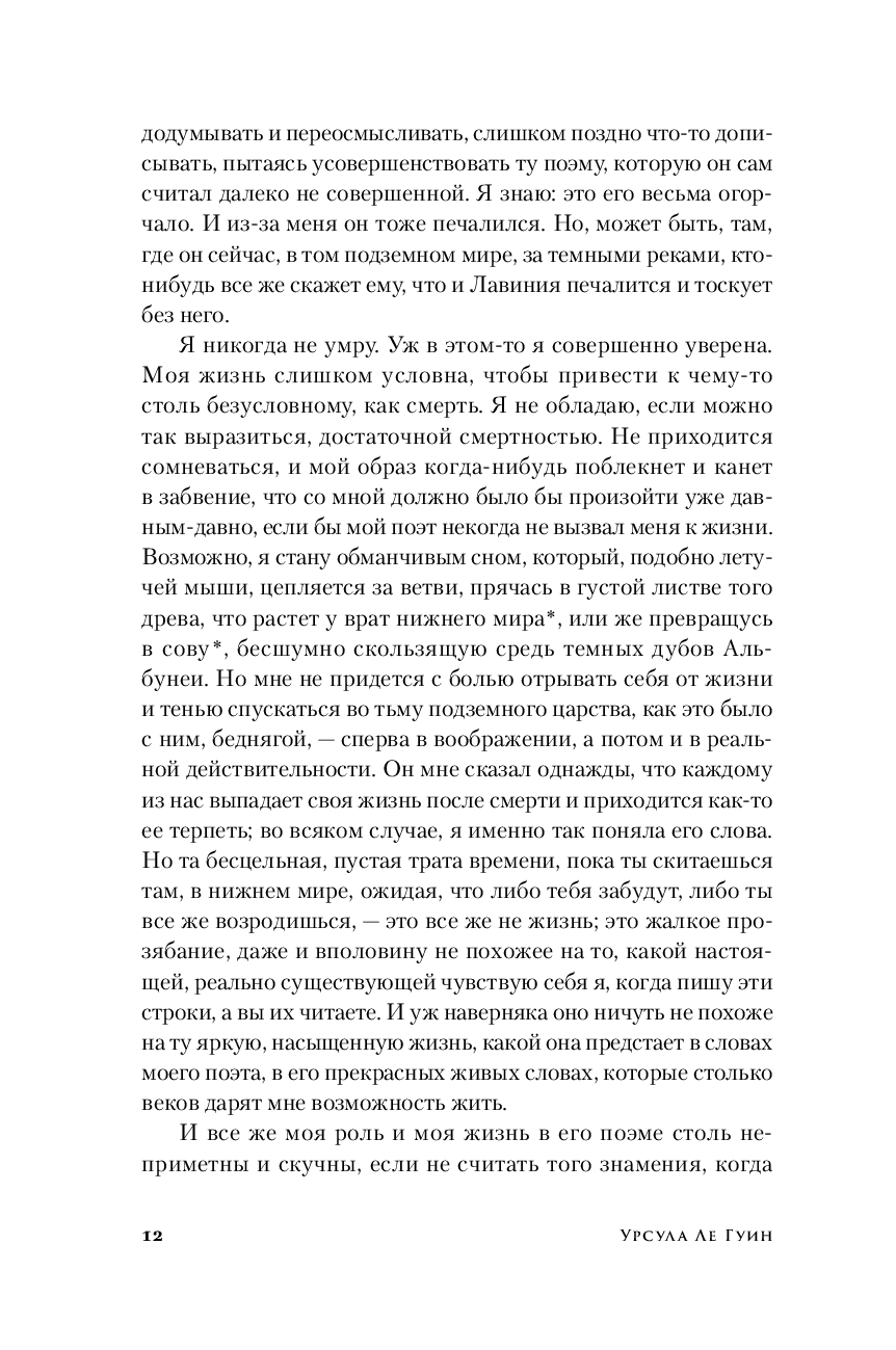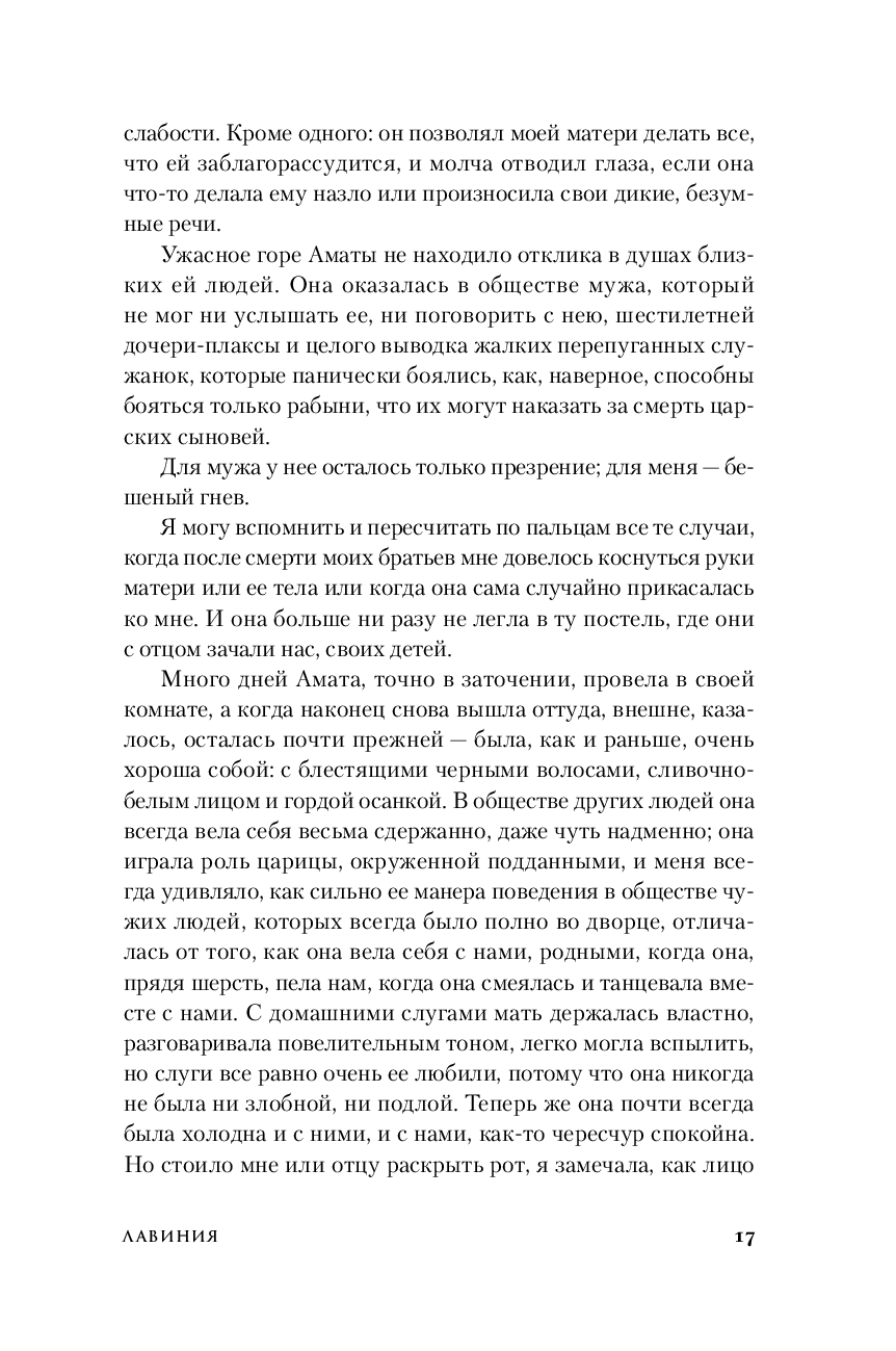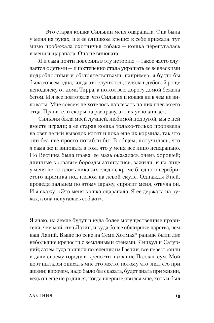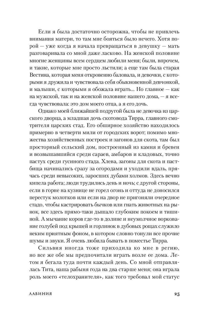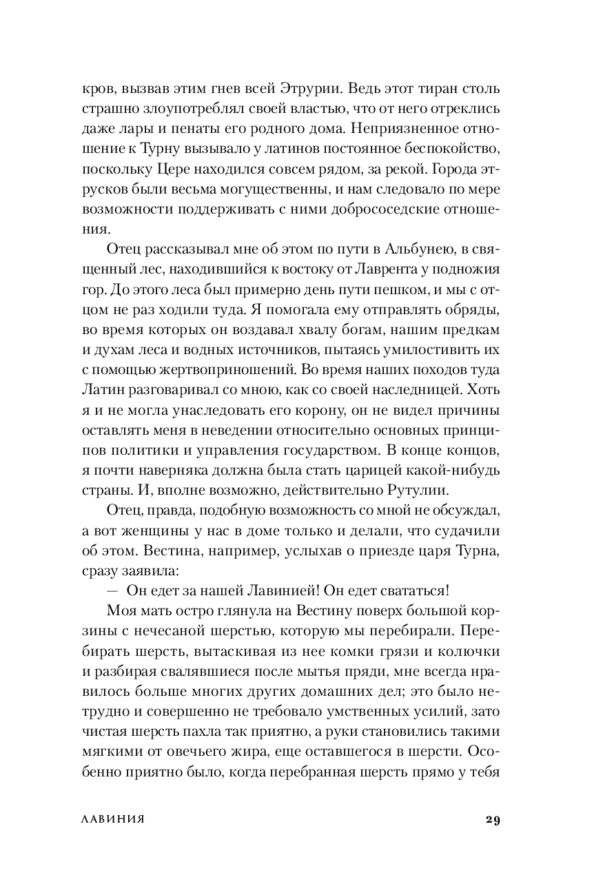 Герой "Энеиды" Вергилия сражается за право обладать дочерью царя Латина, с которой ему предназначено основать империю. Самой же Лавинии в поэме посвящено лишь несколько строк. В романе Урсулы Ле Гуин Лавиния обретает голос: она рассказывает историю своей жизни – от юной девушки, ставшей причиной кровавой войны, но упорно следующей выбранной судьбе, к зрелости, наполненной радостью материнства и горечью потерь.