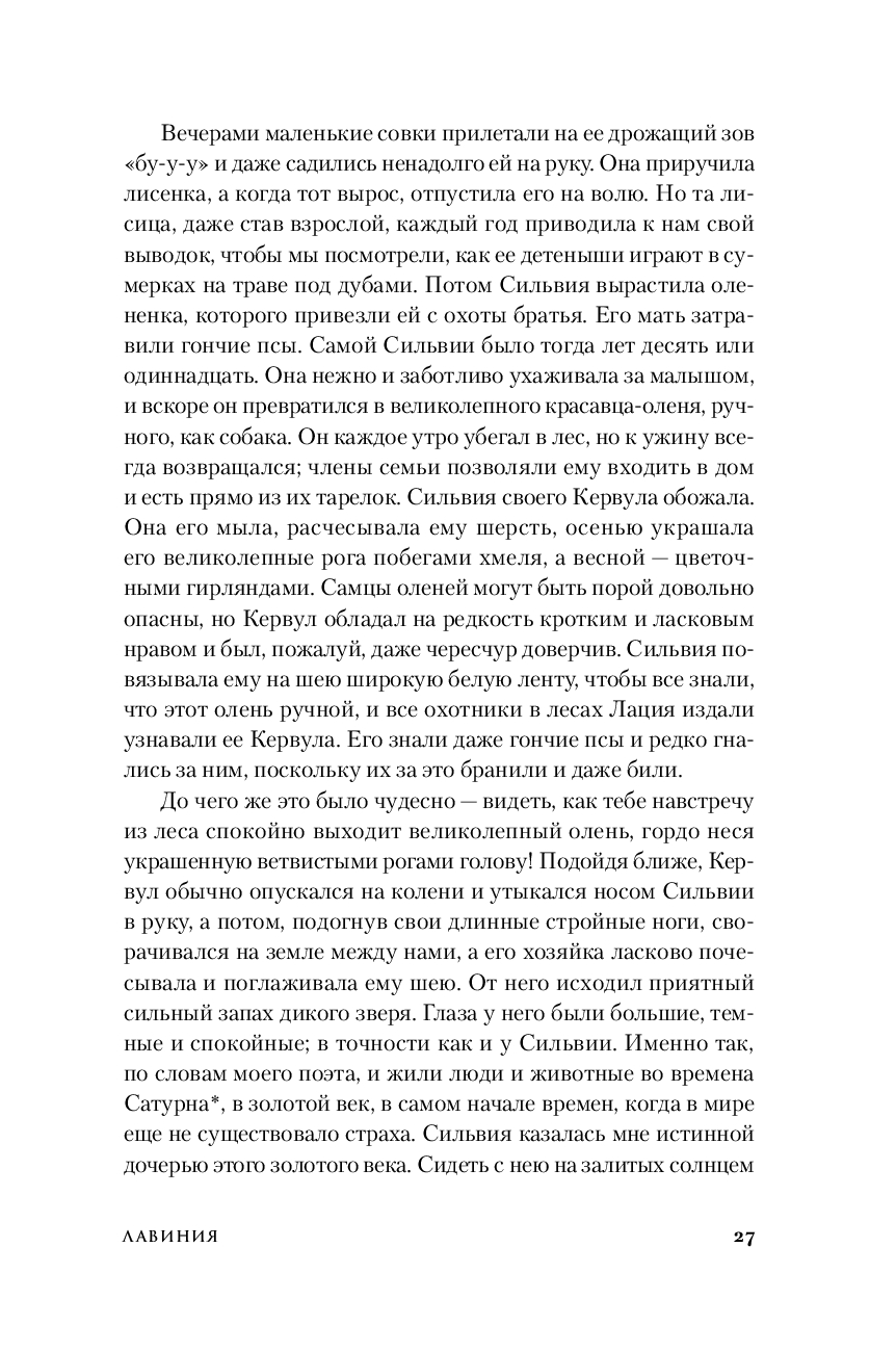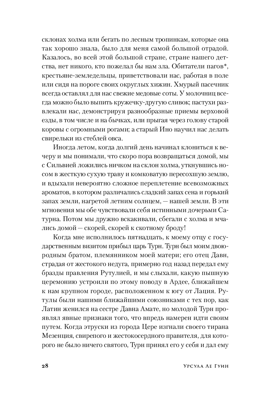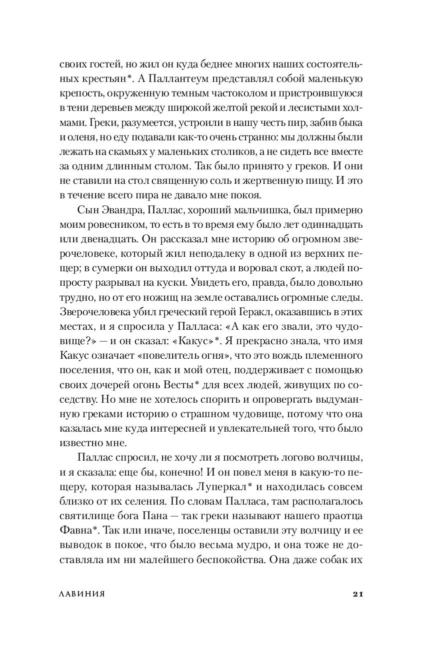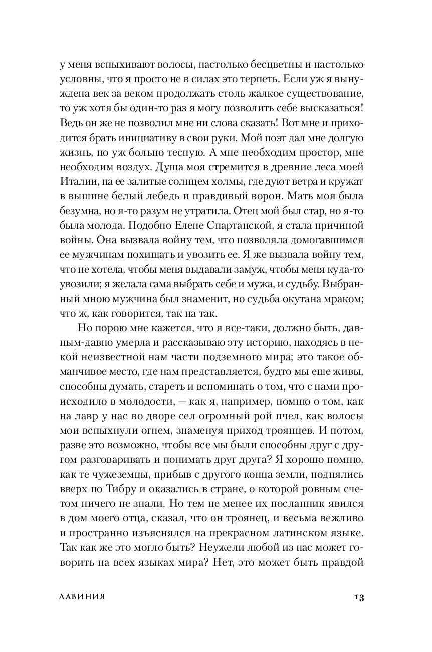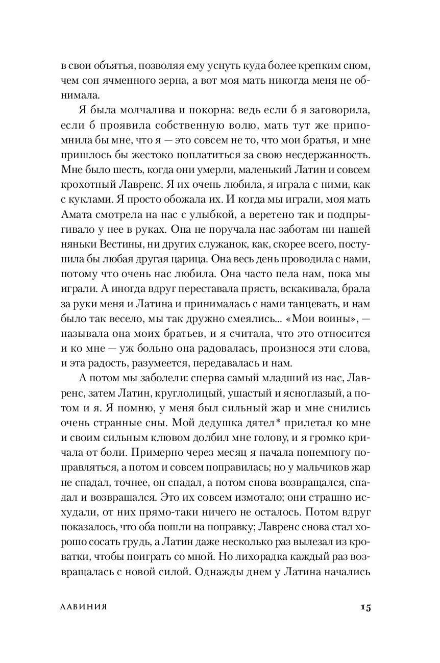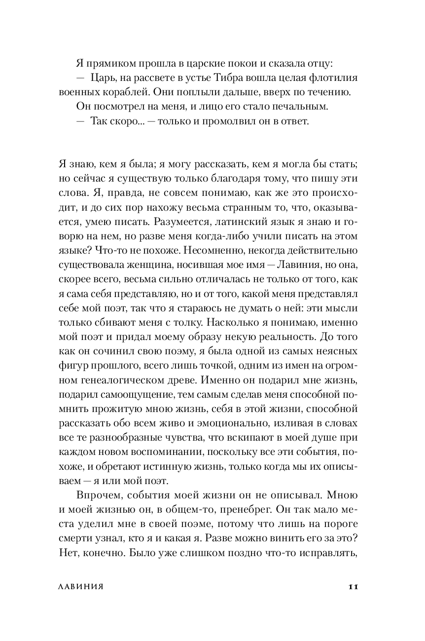 Герой "Энеиды" Вергилия сражается за право обладать дочерью царя Латина, с которой ему предназначено основать империю. Самой же Лавинии в поэме посвящено лишь несколько строк. В романе Урсулы Ле Гуин Лавиния обретает голос: она рассказывает историю своей жизни – от юной девушки, ставшей причиной кровавой войны, но упорно следующей выбранной судьбе, к зрелости, наполненной радостью материнства и горечью потерь.