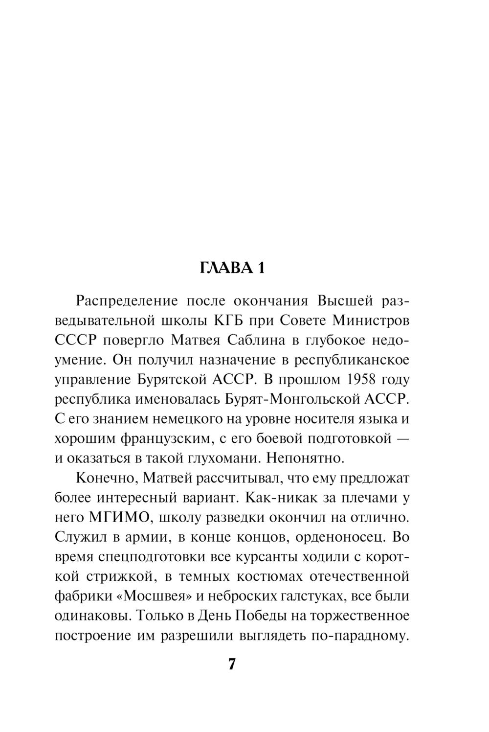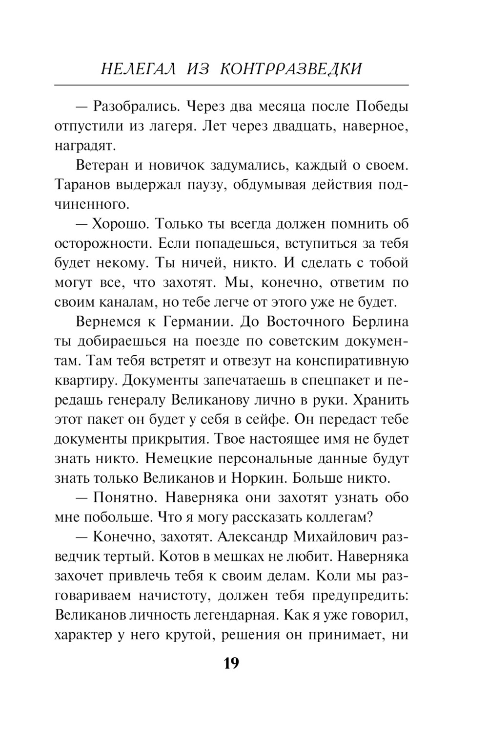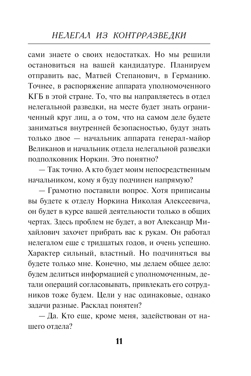 Конец пятидесятых годов. По данным советской агентуры, в одном из крупных городов Германии под видом адвокатской конторы действует штаб экстремистской организации, собирающей под свои знамена фашистских недобитков. Их цель – возрождение рейха и новая война с коммунистами. Лейтенант госбезопасности Матвей Саблин получает задание – выйти на нацистское подполье и нейтрализовать наиболее активных его членов. Задача не из легких, но в распоряжении новоявленного нелегала – целый арсенал проверенных временем приемов. Для предстоящей операции Матвей решает выбрать самый необычный из них...