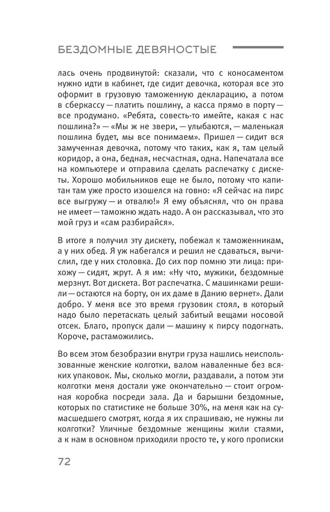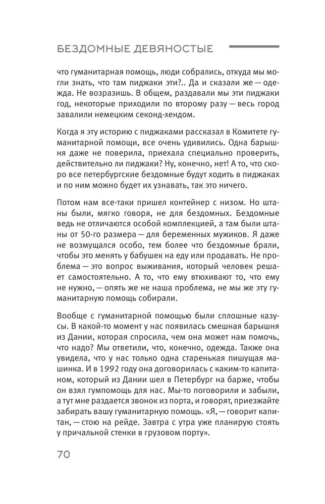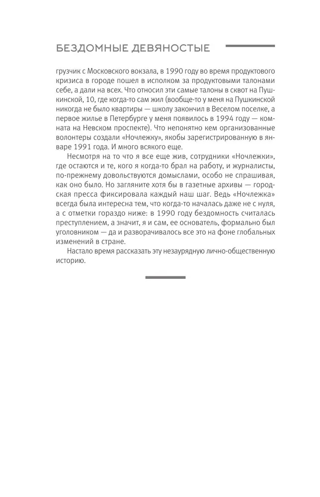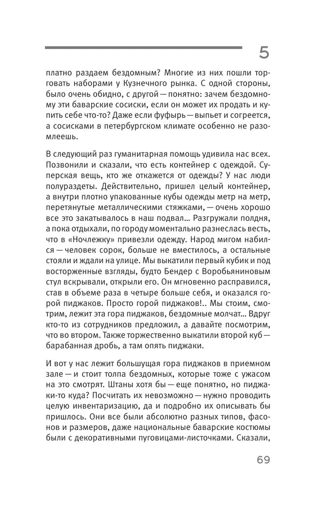 Эта книга – большой трехмесячный уличный разговор журналиста Анастасии Медвецкой и основателя "Ночлежки" Валерия Соколова. Соколов впервые рассказывает, как в действительности все рождалось и развивалось. Как пробить инициативу в Ленсовете? Как вести систему учета тех, у кого нет дома? Как вообще осмелиться помогать тем, кто зачастую приходит со вшами, открытой формой туберкулеза, да еще и подворовывает? Откуда брать деньги? За всем этим стоит история личной драмы бывшего бездомного хиппи в кирзовых сапогах Соколова.