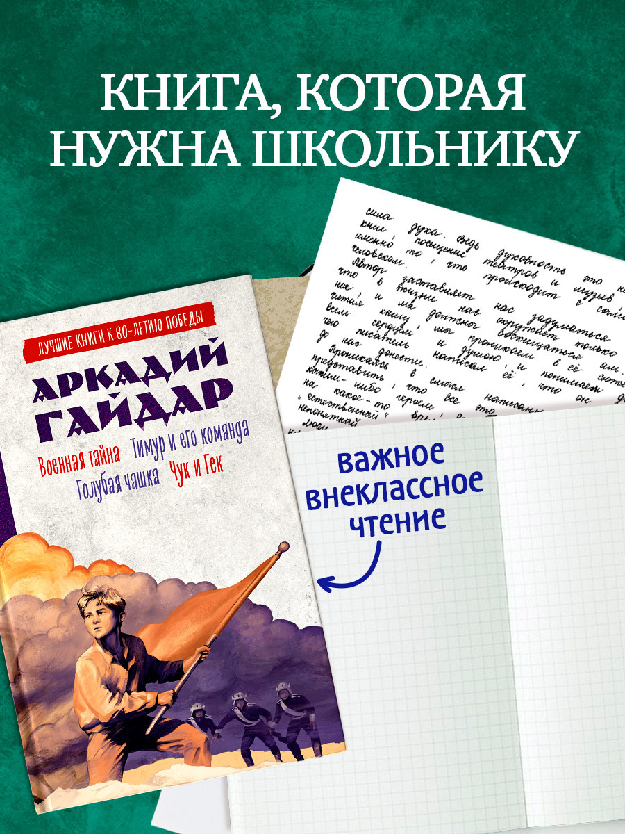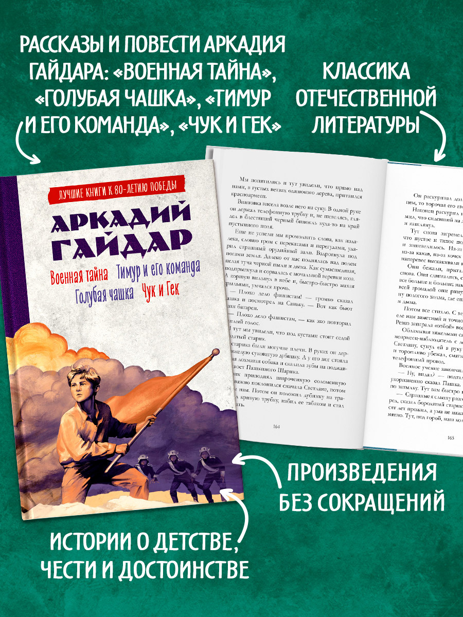 Знаменитые повести "Военная тайна" – о Мальчише-Кибальчише и смелых пионерах, "Тимур и его команда" – о ребятах, которые заботятся о семьях фронтовиков, рассказы "Голубая чашка" и "Чук и Гек" – с этой книгой ваш ребенок откроет для себя мир приключений, знакомых еще нашим родителям, и узнает многое об истории страны.
