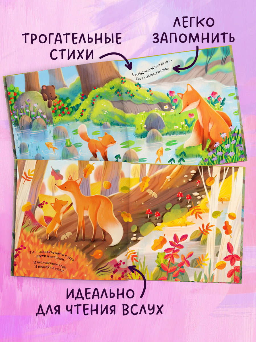 "Ты для меня весь мир!" – книжка-картинка с большими панорамными иллюстрациями, которые интересно рассматривать и детям, и взрослым. Мама-лиса и маленький лисенок путешествуют по страницам и по временам года, а юные читатели смогут не только найти множество забавных деталей на ярких картинках, но и придумывать собственные истории про милых героев.