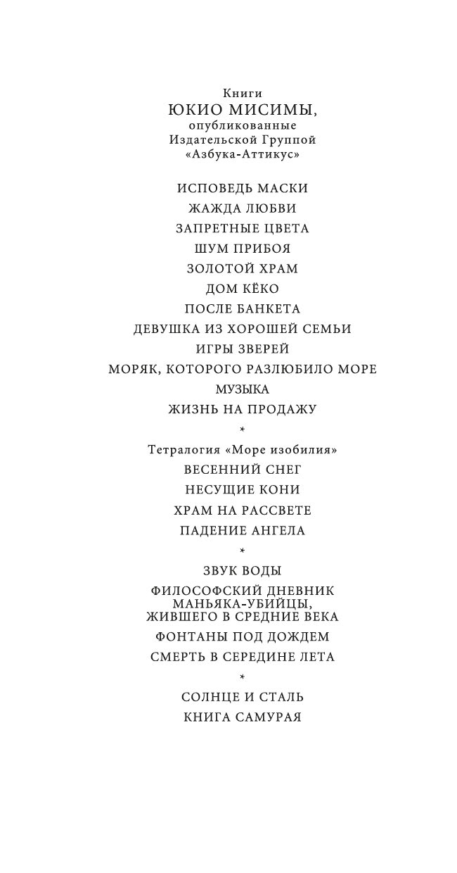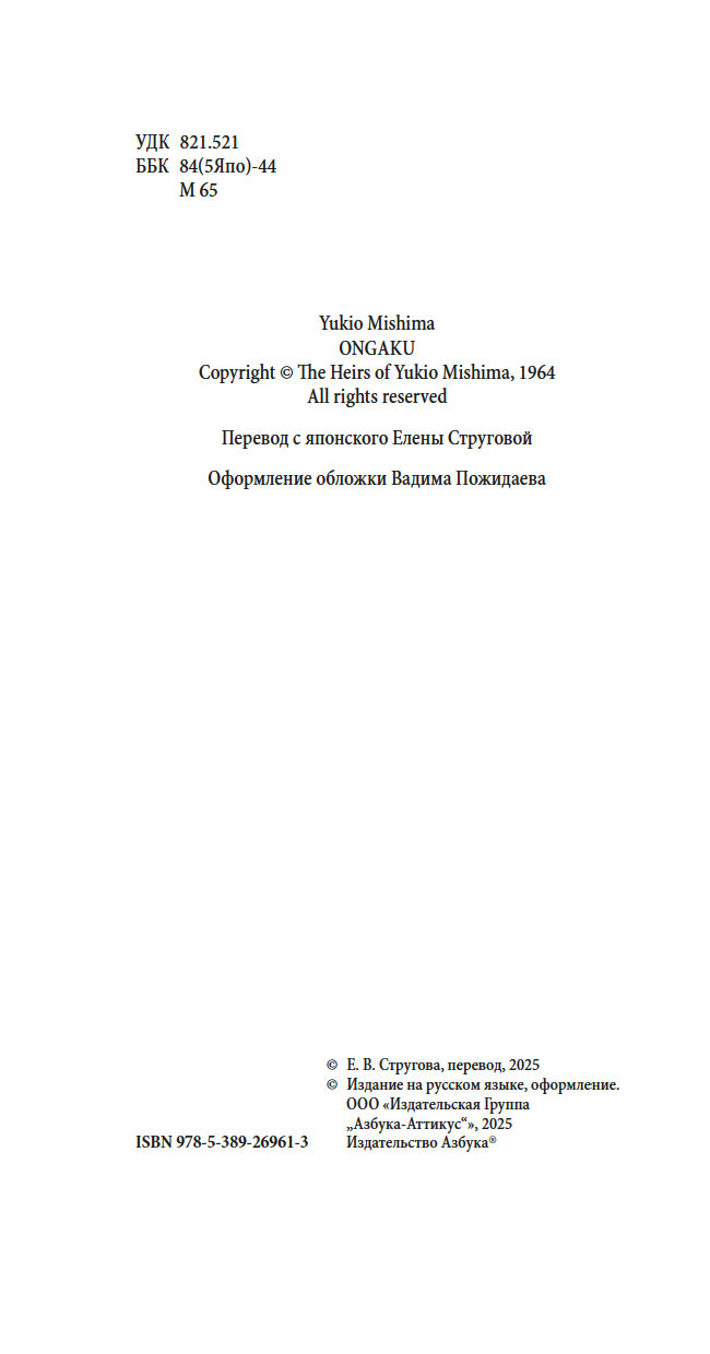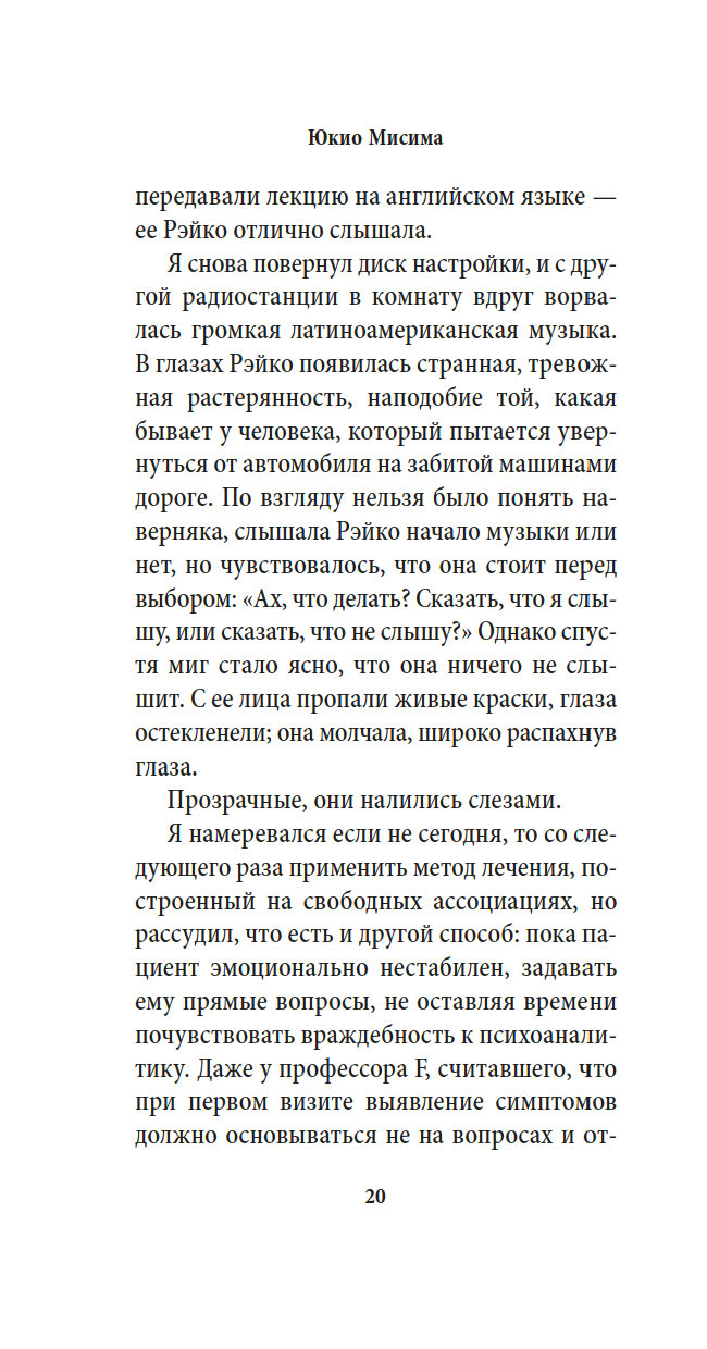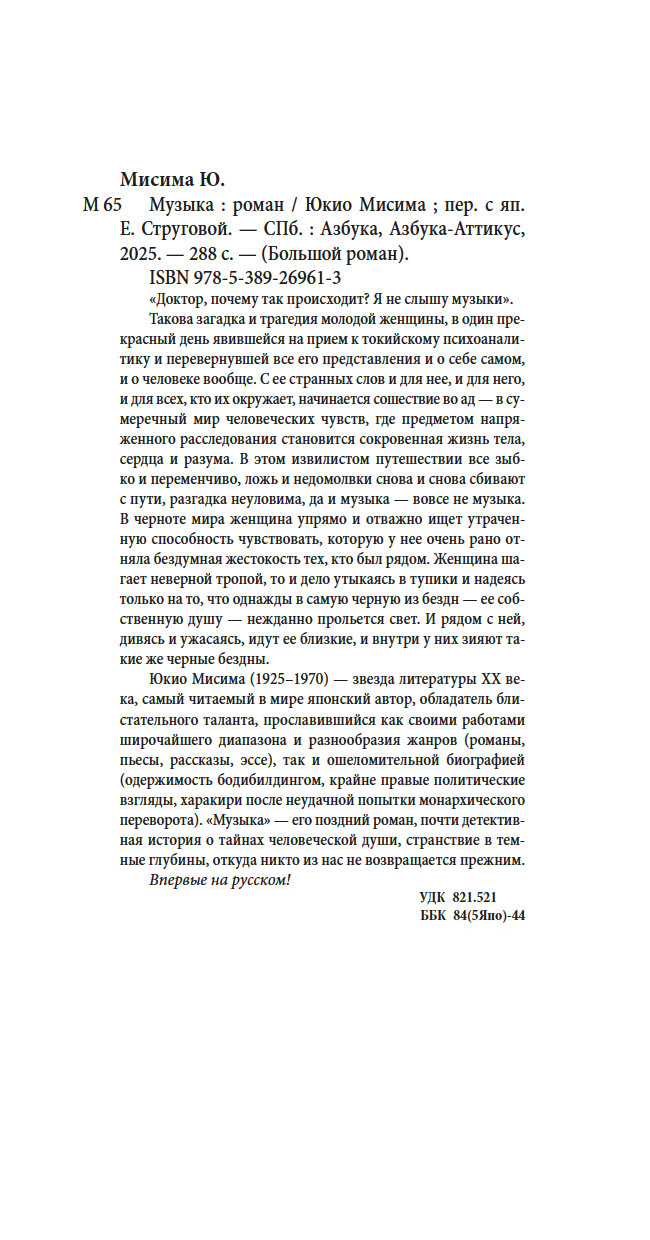 Юкио Мисима (1925–1970) – звезда литературы XX века, самый читаемый в мире японский автор, обладатель блистательного таланта, прославившийся как своими работами широчайшего диапазона и разнообразия жанров (романы, пьесы, рассказы, эссе), так и ошеломительной биографией (одержимость бодибилдингом, крайне правые политические взгляды, харакири после неудачной попытки монархического переворота). "Музыка" – его поздний роман, почти детективная история о тайнах человеческой души, странствие в темные глубины, откуда никто из нас не возвращается прежним.