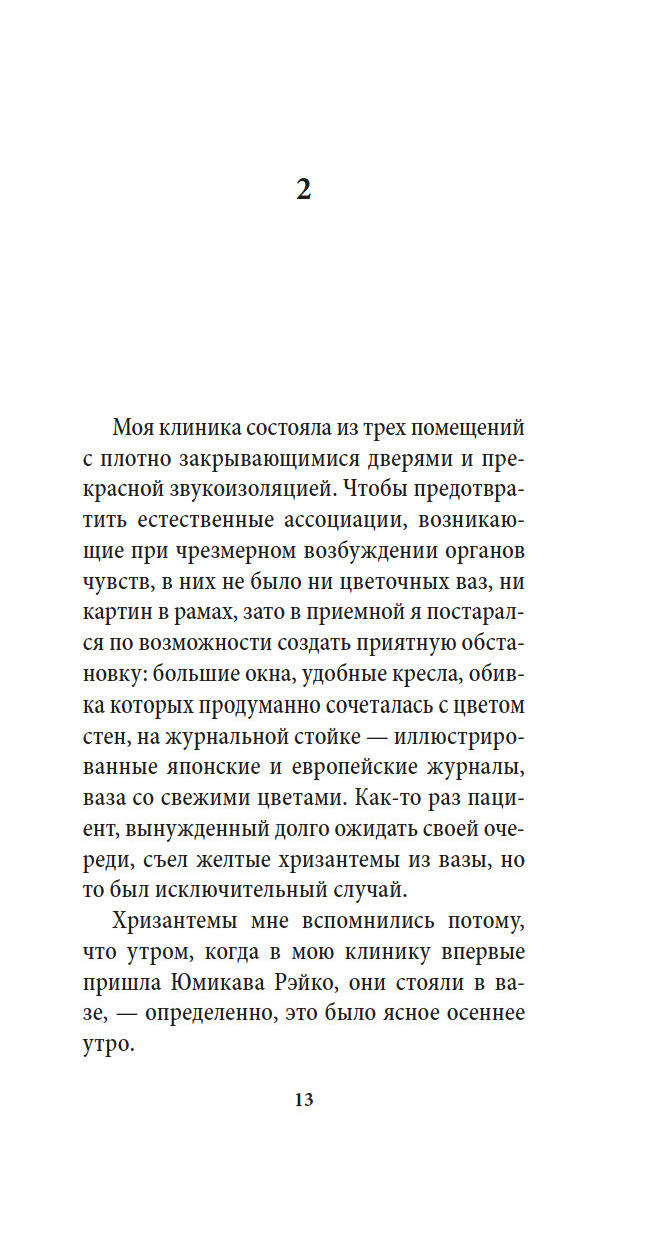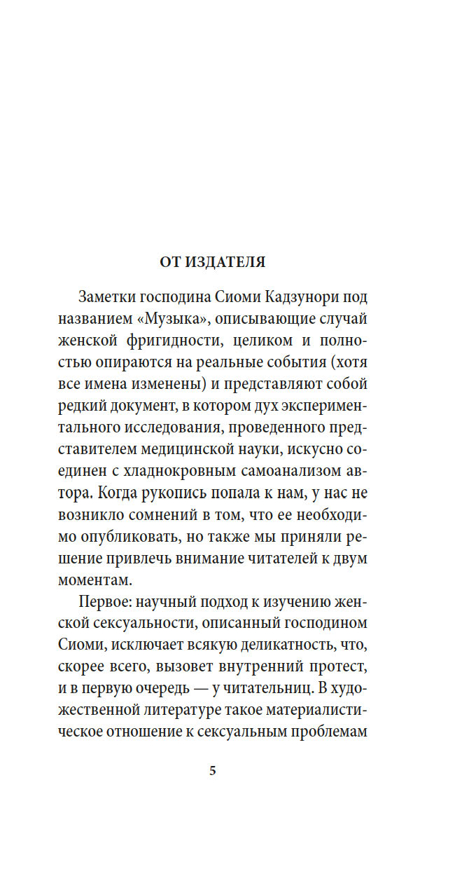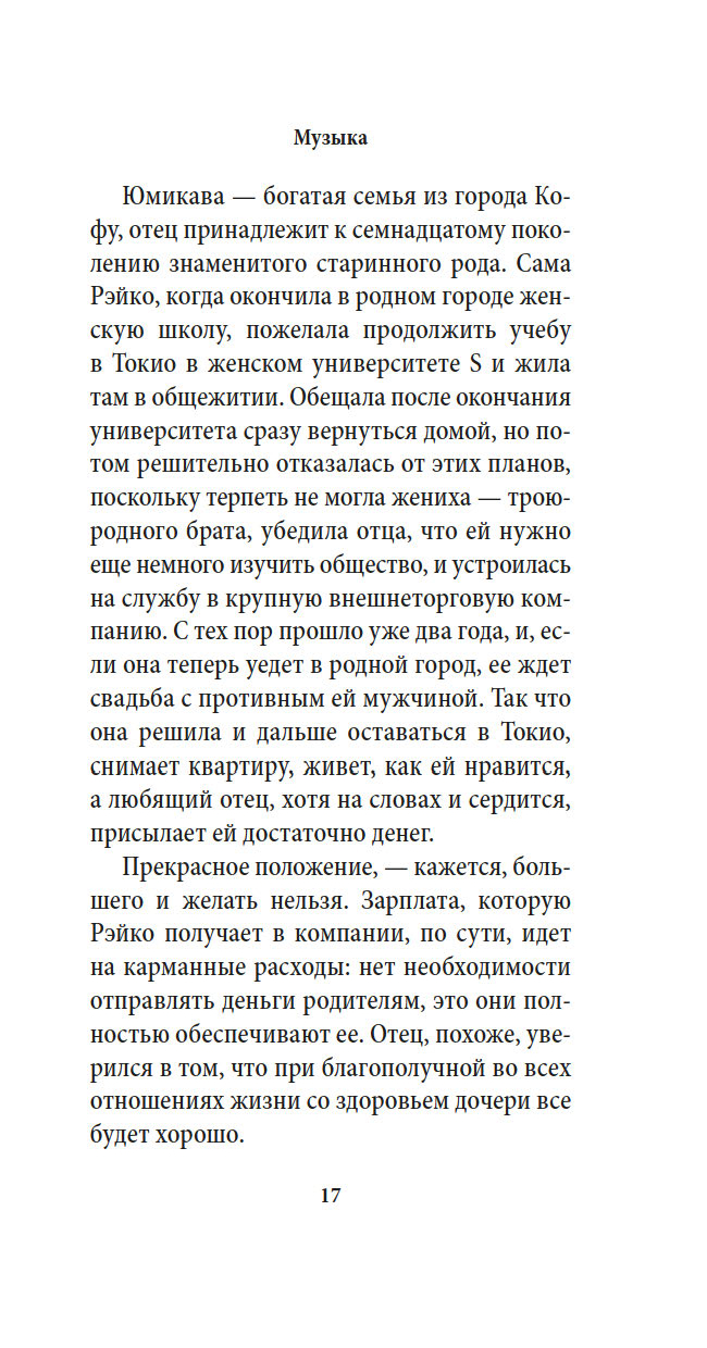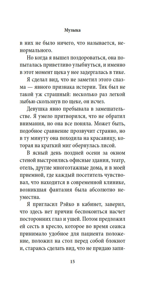 Такова загадка и трагедия молодой женщины, в один прекрасный день явившейся на прием к токийскому психоаналитику и перевернувшей все его представления и о себе самом, и о человеке вообще. С ее странных слов и для нее, и для него, и для всех, кто их окружает, начинается сошествие во ад – в сумеречный мир человеческих чувств, где предметом напряженного расследования становится сокровенная жизнь тела, сердца и разума. В этом извилистом путешествии все зыбко и переменчиво, ложь и недомолвки снова и снова сбивают с пути, разгадка неуловима, да и музыка – вовсе не музыка.