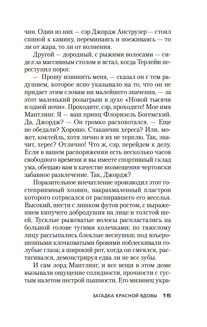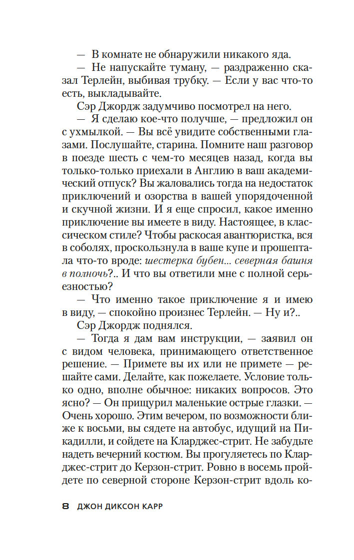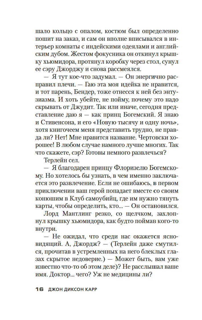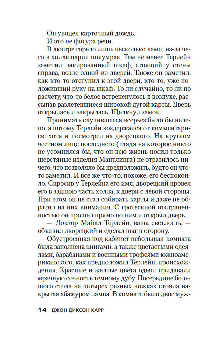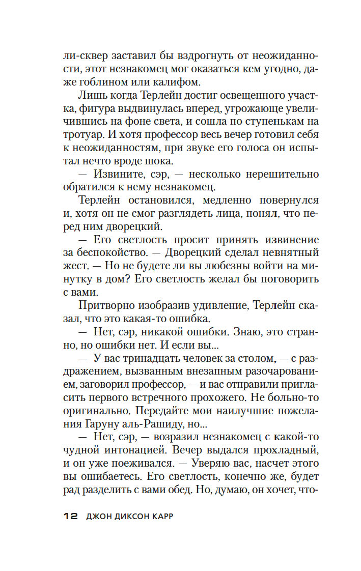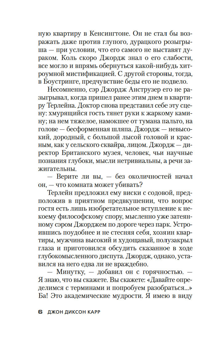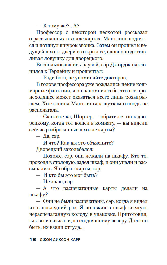 Золотой век детектива оставил немало звездных имен – А. Кристи, Г. К. Честертон, Г. Митчелл и др. В этой яркой плеяде Джон Диксон Карр (1906–1977) занимает самое почетное место. Убийство "в запертой комнате", где нет места бешеным погоням и перестрелкам, а круг подозреваемых максимально ограничен, – излюбленный прием автора. Карр вовлекает читателя в сети ловко расставленных ловушек, обманных ходов и тонких намеков и предлагает принять участие в решении хитроумной головоломки, распутывая ниточки "невозможных" преступлений.