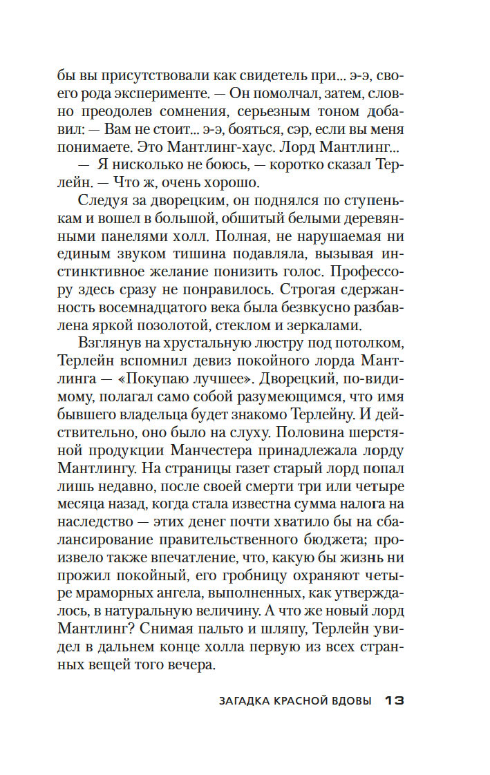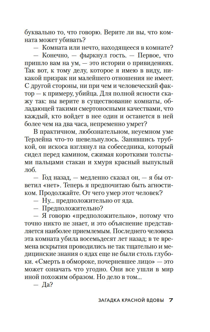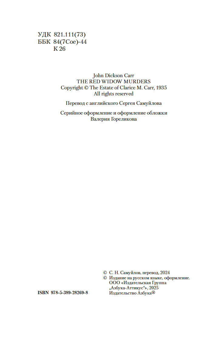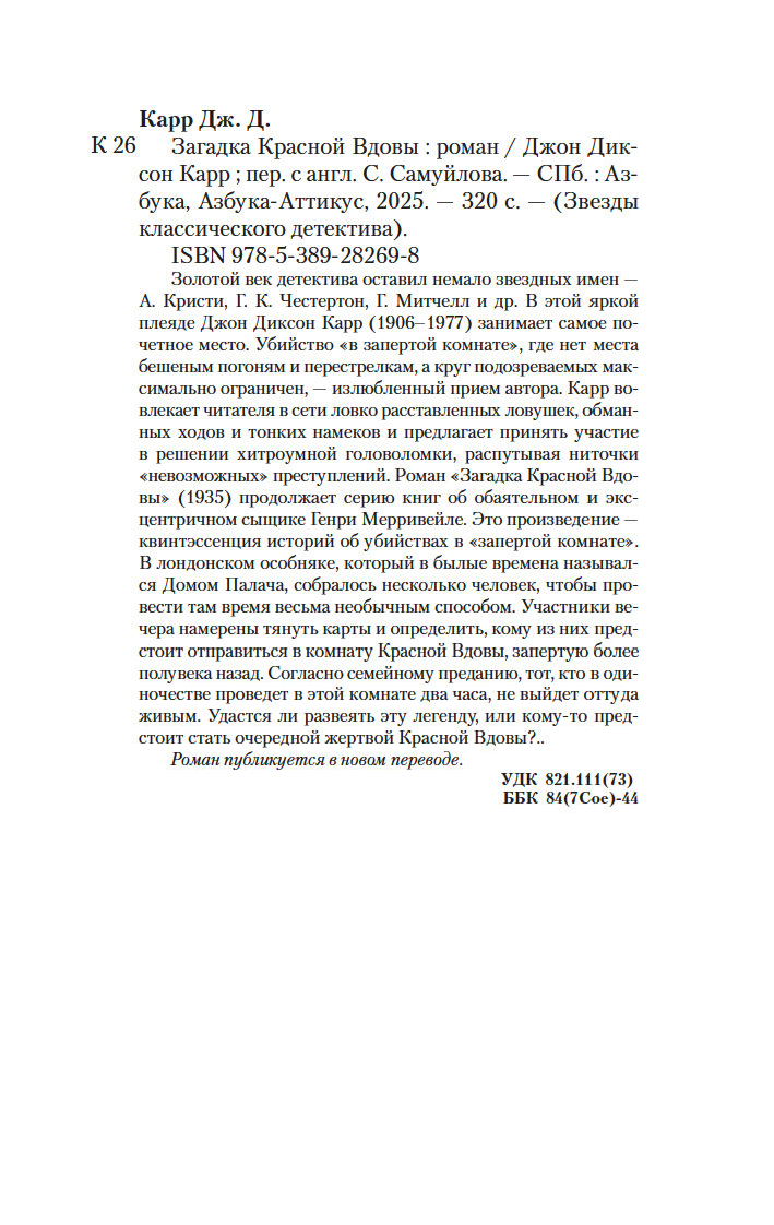 Роман "Загадка Красной Вдовы" (1935) продолжает серию книг об обаятельном и эксцентричном сыщике Генри Мерривейле. Это произведение – квинтэссенция историй об убийствах в "запертой комнате".