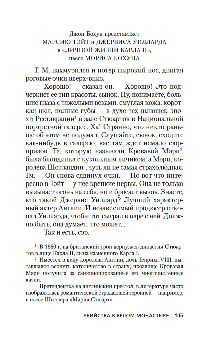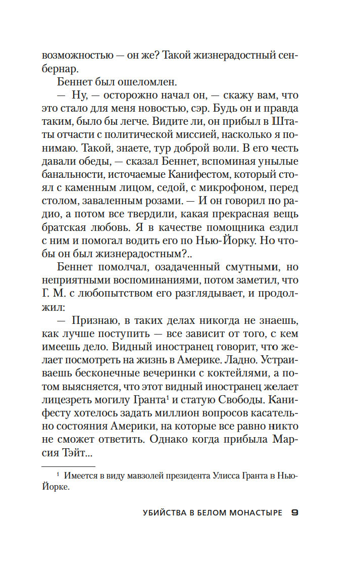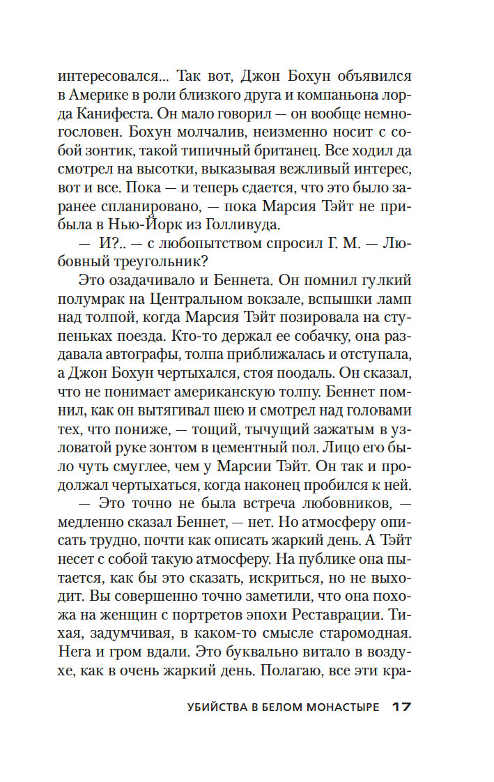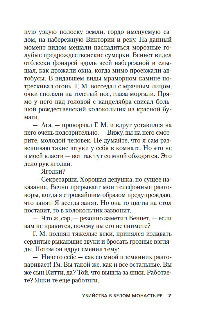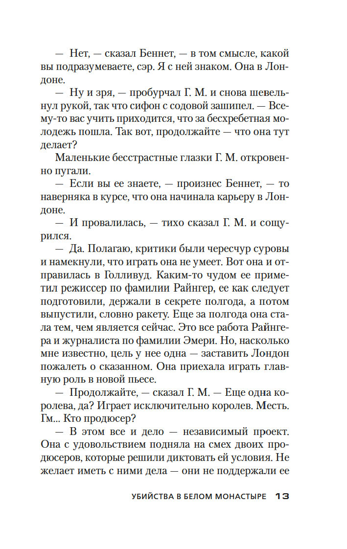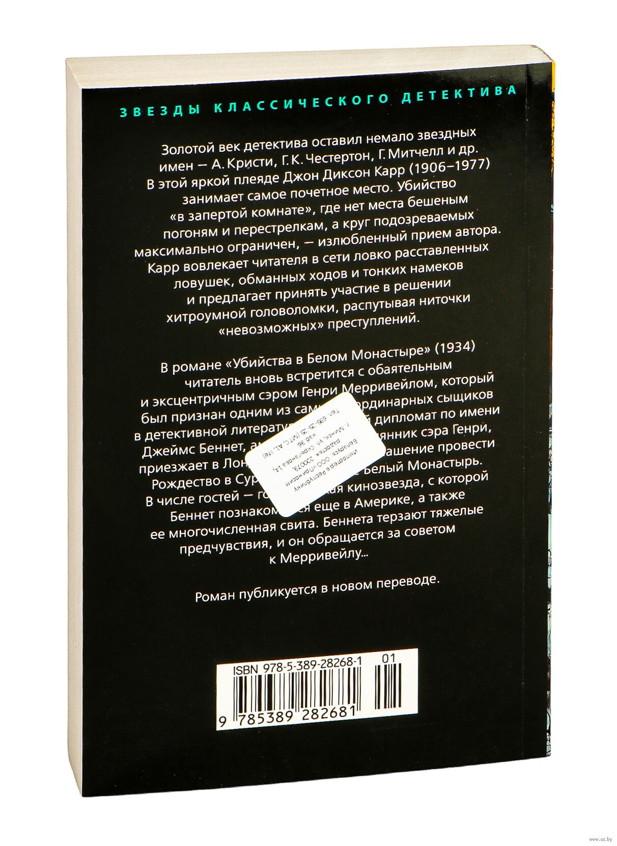 В романе "Убийства в Белом Монастыре" (1934) читатель вновь встретится с обаятельным и эксцентричным сэром Генри Мерривейлом, который был признан одним из самых неординарных сыщиков в детективной литературе. Молодой дипломат по имени Джеймс Беннет, американский племянник сэра Генри, приезжает в Лондон и получает приглашение провести Рождество в Суррее, в поместье Белый Монастырь. В числе гостей – голливудская кинозвезда, с которой Беннет познакомился еще в Америке, а также ее многочисленная свита. Беннета терзают тяжелые предчувствия, и он обращается за советом к Мерривейлу…
