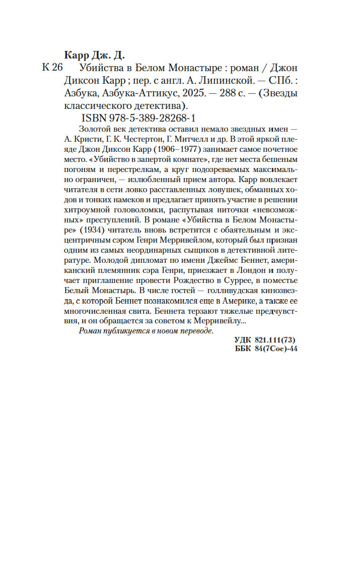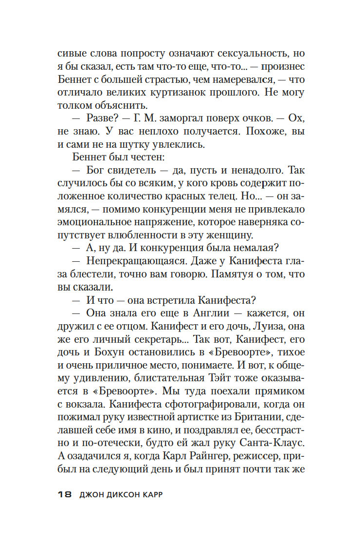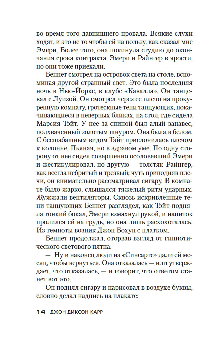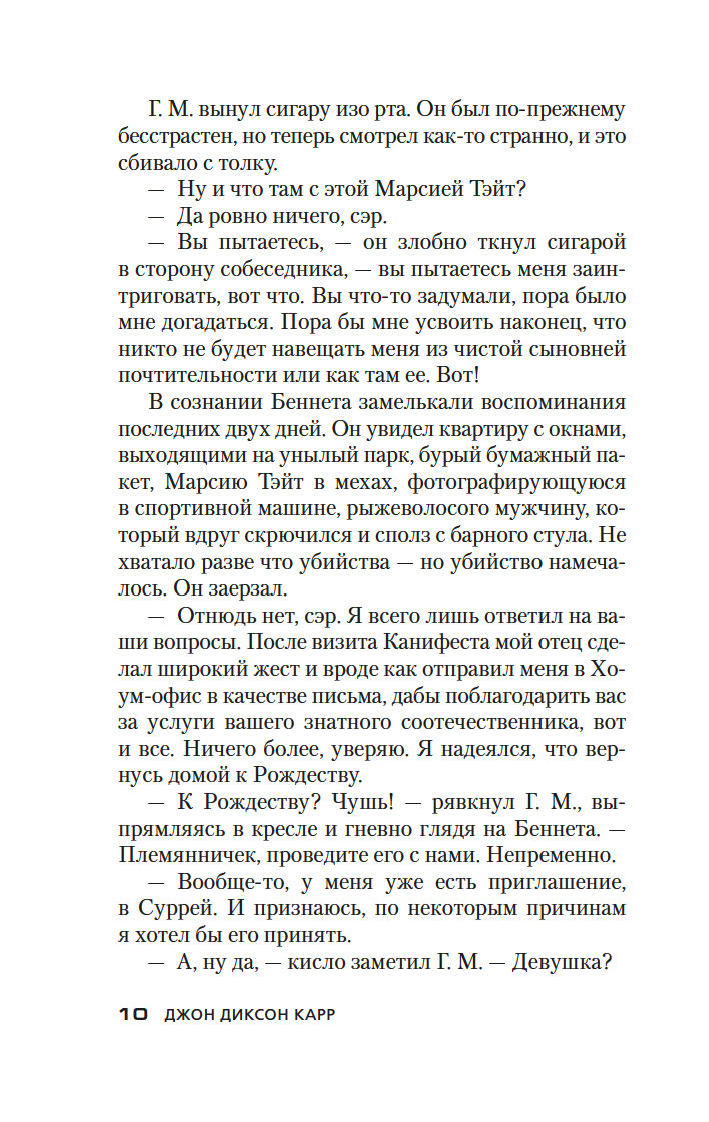 Золотой век детектива оставил немало звездных имен – А. Кристи, Г. К. Честертон, Г. Митчелл и др. В этой яркой плеяде Джон Диксон Карр (1906-1977) занимает самое почетное место. "Убийство в запертой комнате", где нет места бешеным погоням и перестрелкам, а круг подозреваемых максимально ограничен, – излюбленный прием автора. Карр вовлекает читателя в сети ловко расставленных ловушек, обманных ходов и тонких намеков и предлагает принять участие в решении хитроумной головоломки, распутывая ниточки "невозможных" преступлений.