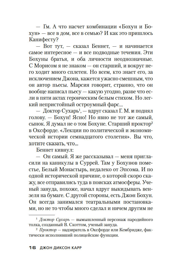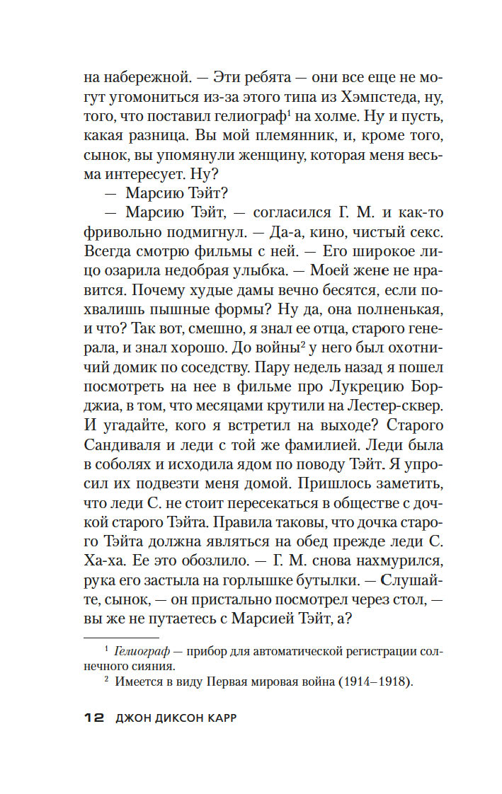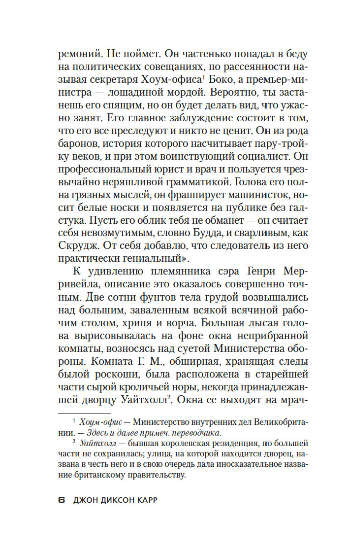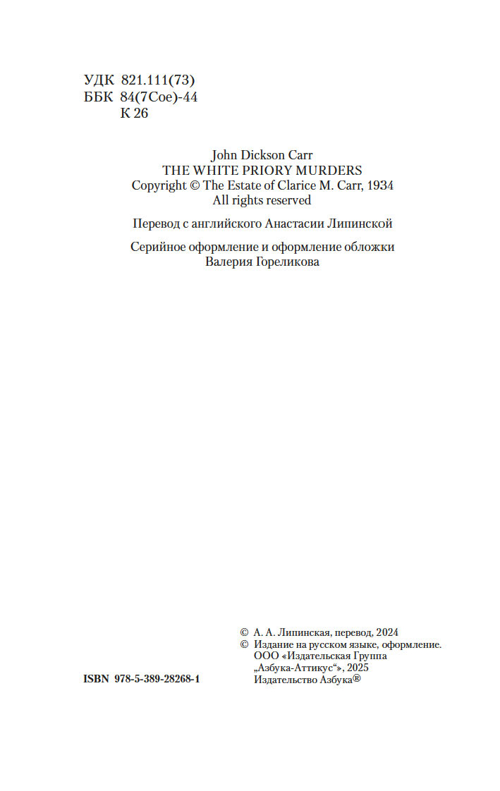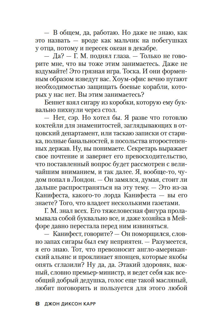 Золотой век детектива оставил немало звездных имен – А. Кристи, Г. К. Честертон, Г. Митчелл и др. В этой яркой плеяде Джон Диксон Карр (1906-1977) занимает самое почетное место. "Убийство в запертой комнате", где нет места бешеным погоням и перестрелкам, а круг подозреваемых максимально ограничен, – излюбленный прием автора. Карр вовлекает читателя в сети ловко расставленных ловушек, обманных ходов и тонких намеков и предлагает принять участие в решении хитроумной головоломки, распутывая ниточки "невозможных" преступлений.
